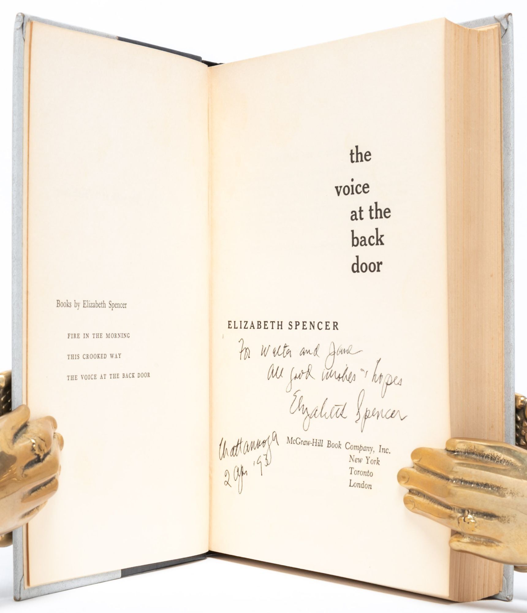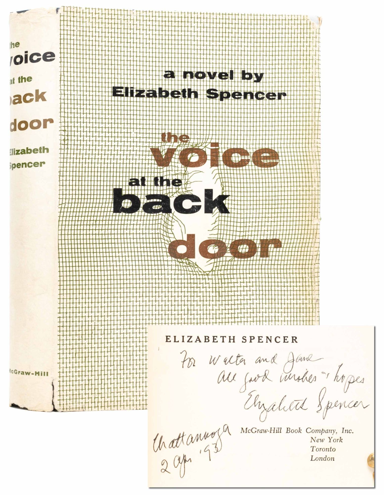 New York: McGraw-Hill Book Company, Inc, 1956. First edition. Near Fine/Very Good +. Inscribed by Elizabeth Spencer on the title-page: "For Walter and Jane, all good wishes and hopes, Elizabeth Spencer, Chattanooga, 2 Apr '93." With a bookplate signed by Spencer laid in. Publisher's black-and-blue boards. Toning to endpapers and first and last couple leaves. Unclipped dust jacket a bit wrinkled around folds, with small chips to corners and head and tail of spine. A Near Fine copy in Very Good+ dust jacket.