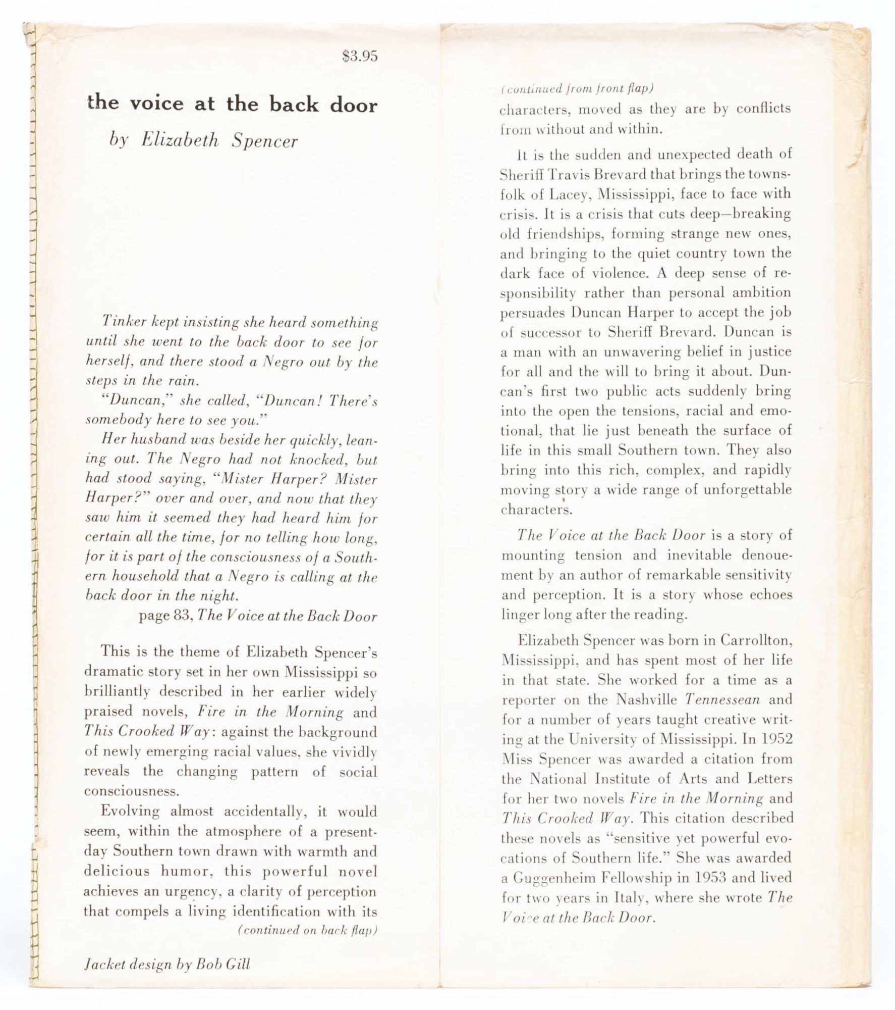 "In The Voice at the Back Door, Mississippi native Elizabeth Spencer gives form to the many voices that shaped her view of race relations while growing up, and at the same time discovers her own voice – one of hope. Employing her extraordinary literary powers – finely honed narrative techniques, insight into a rich, diverse cast of characters, and an unerring ear for dialect – Spencer makes palpable the psychological milieu of a small southern town hobbled by tradition but lurching toward the dawn of the civil rights movement...The Voice at the Back Door is Spencer’s most highly praised novel yet" (preface to the 1994 edition).