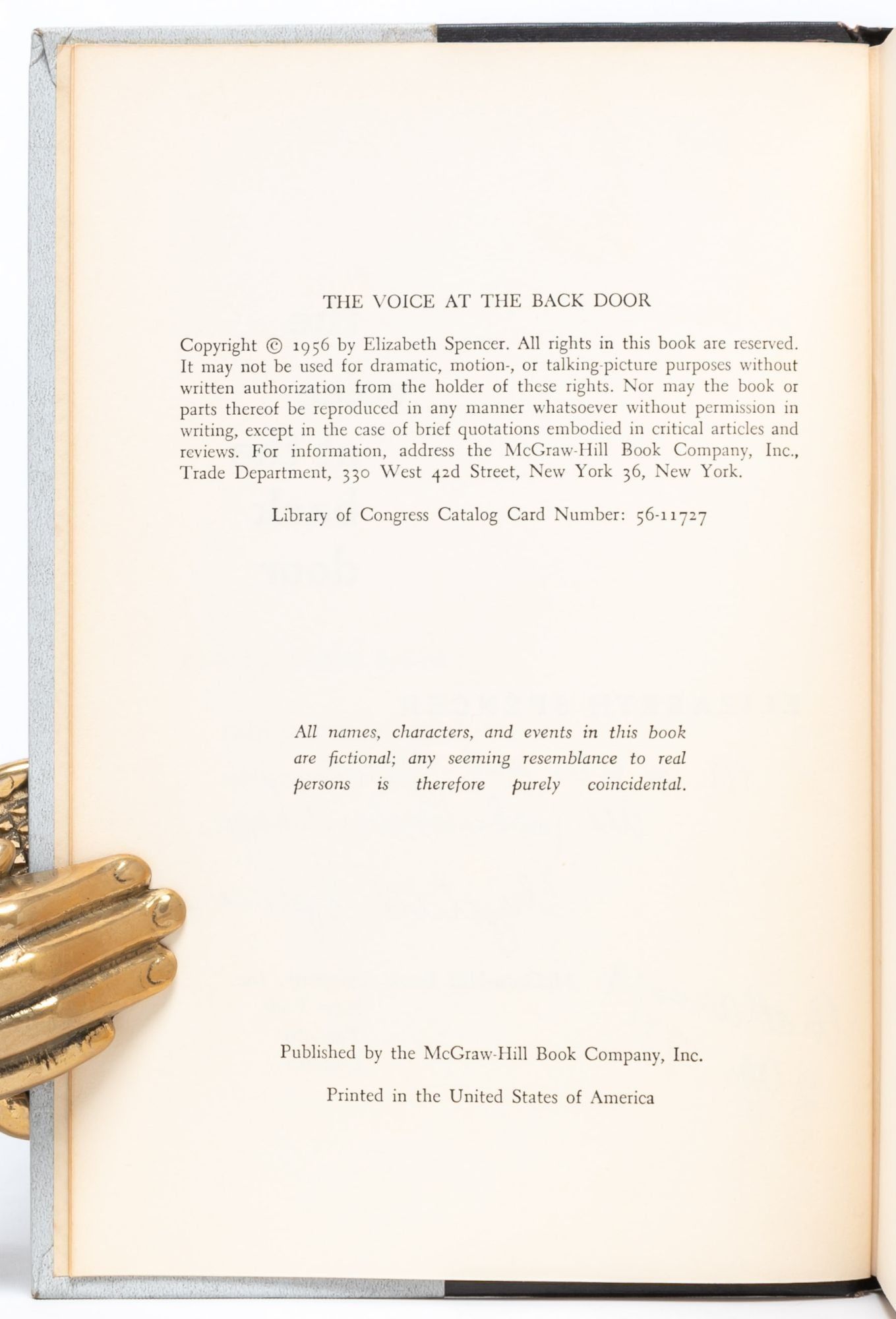 Spencer's novel was a finalist for both the Pulitzer Prize and the National Book Award, though the Pulitzer Prize for Fiction was ultimately not awarded in 1957. The jury had recommended The Voice at the Back Door, but the Pulitzer board, which has sole discretion for awarding the prize, controversially made no award. Near Fine in Very Good + dust jacket.