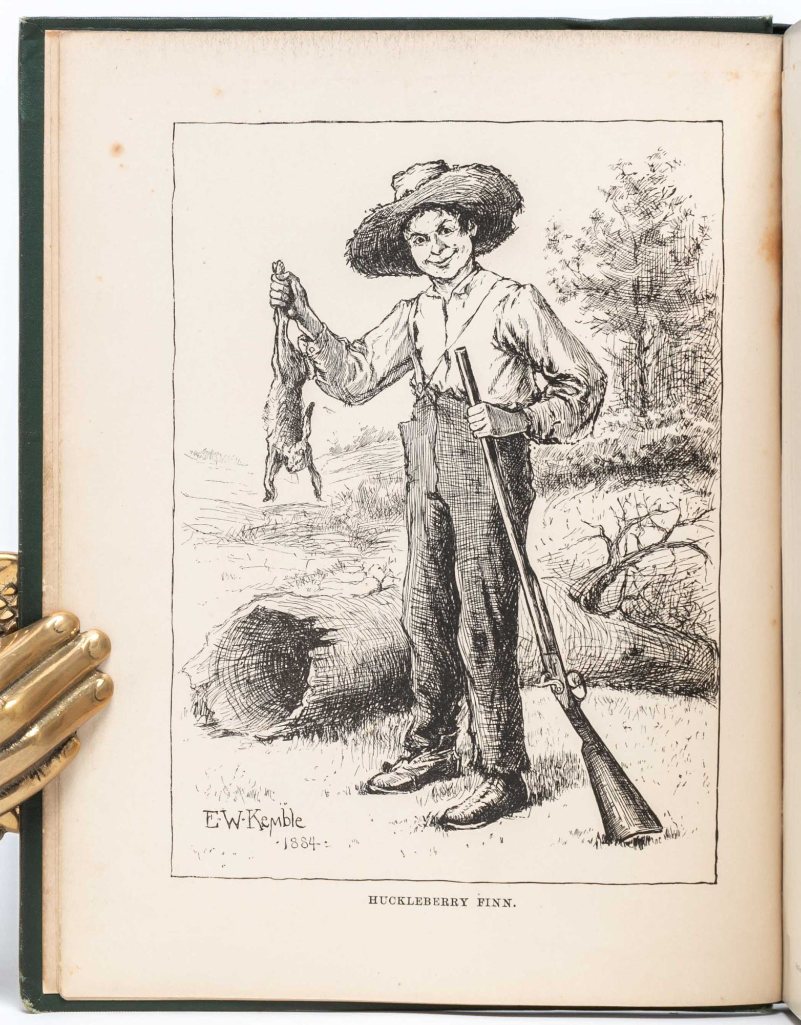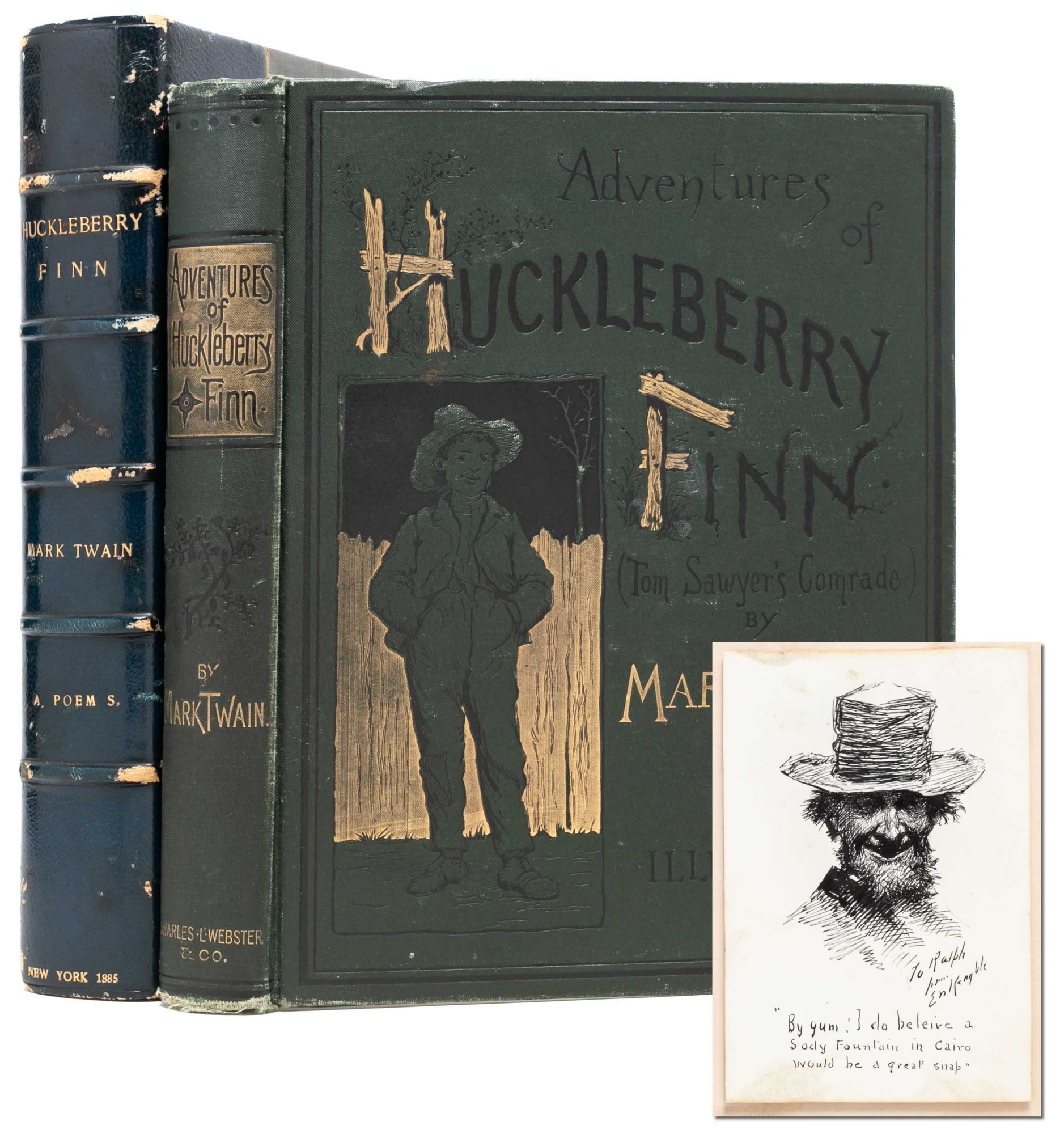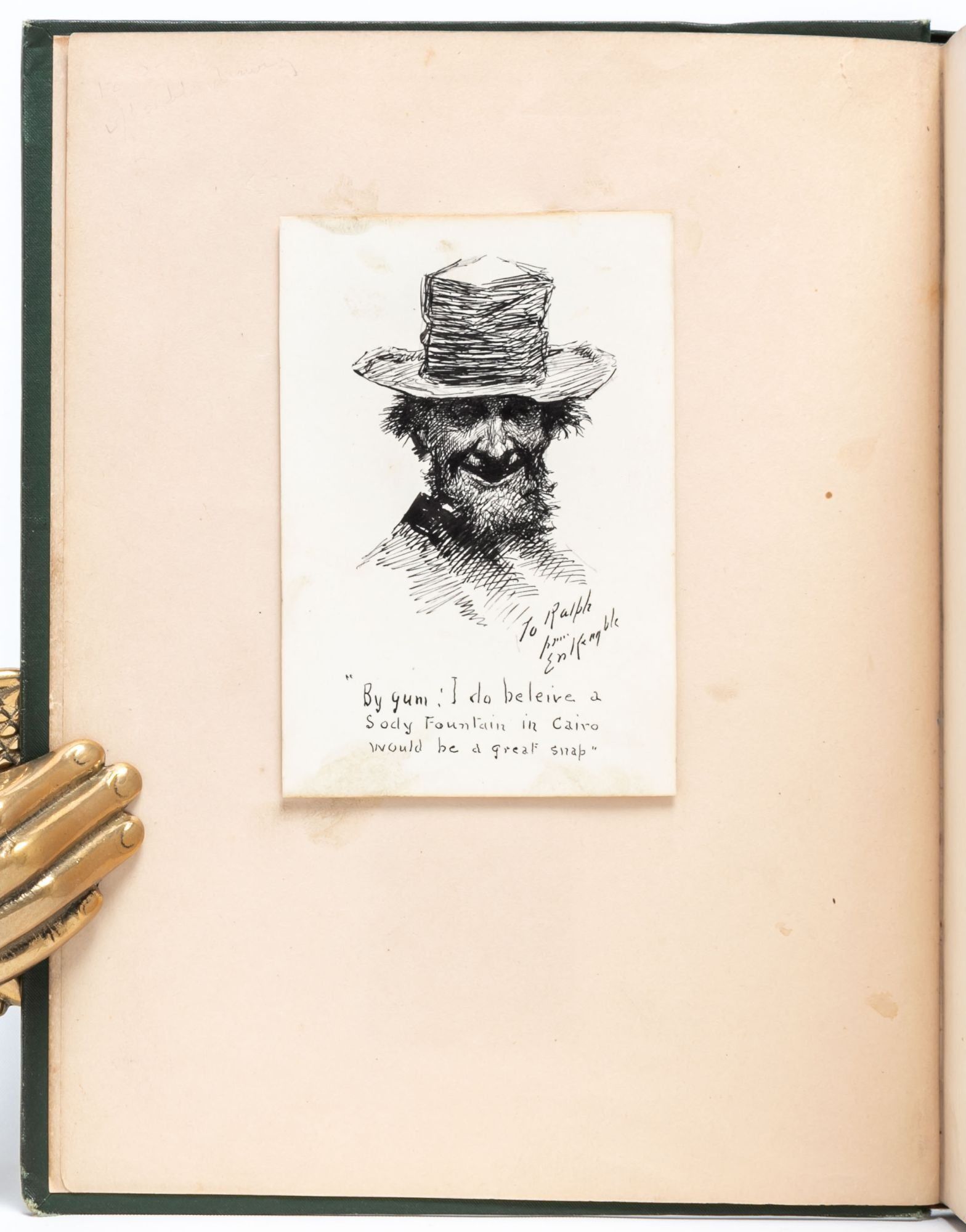 New York: Charles L. Webster and Company, 1885. First American edition. Very Good +. With original sketch by E. W. Kemble, artist of the iconic Huckleberry Finn frontisportrait, tipped onto the verso of the front free endpaper. The sketch is inscribed "To Ralph from E W Kemble" and captioned: "By gum: I do believe a Sody Fountain in Cairo would be a great snap."