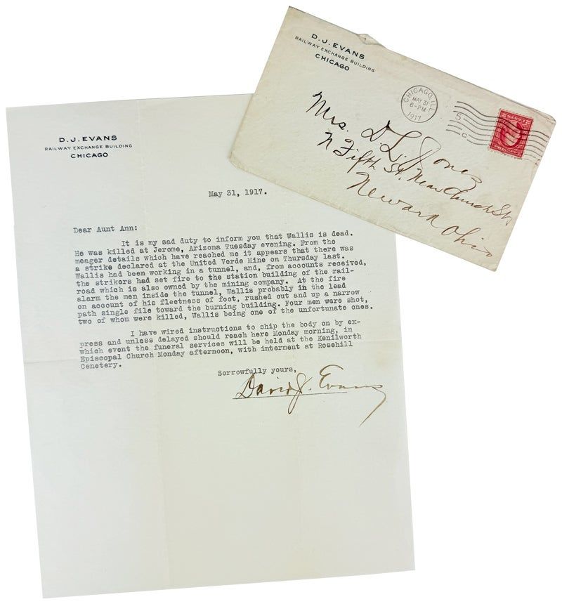 The letter details the death of a Wallis in the immediate aftermath of the declaration of a strike at the United Verde Mine in Jerome, Arizona. Evans reports, "Wallis had been working in a tunnel, and, from accounts received, the strikers had set fire to the station building of the rail-road... At the fire the men inside the tunnel, Wallis probably in the lead on account of his fleetness of foot, rushed out and up a narrow path single file towards the burning building. Four men were shot, two of whom were killed, Wallis being one of the unfortunate ones."
