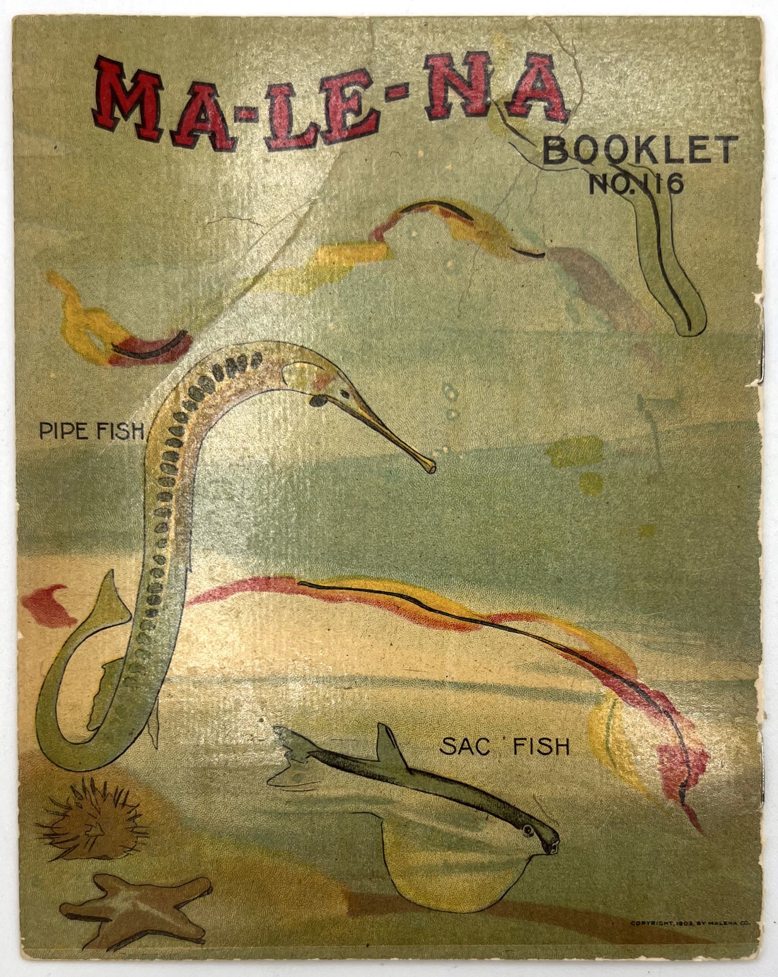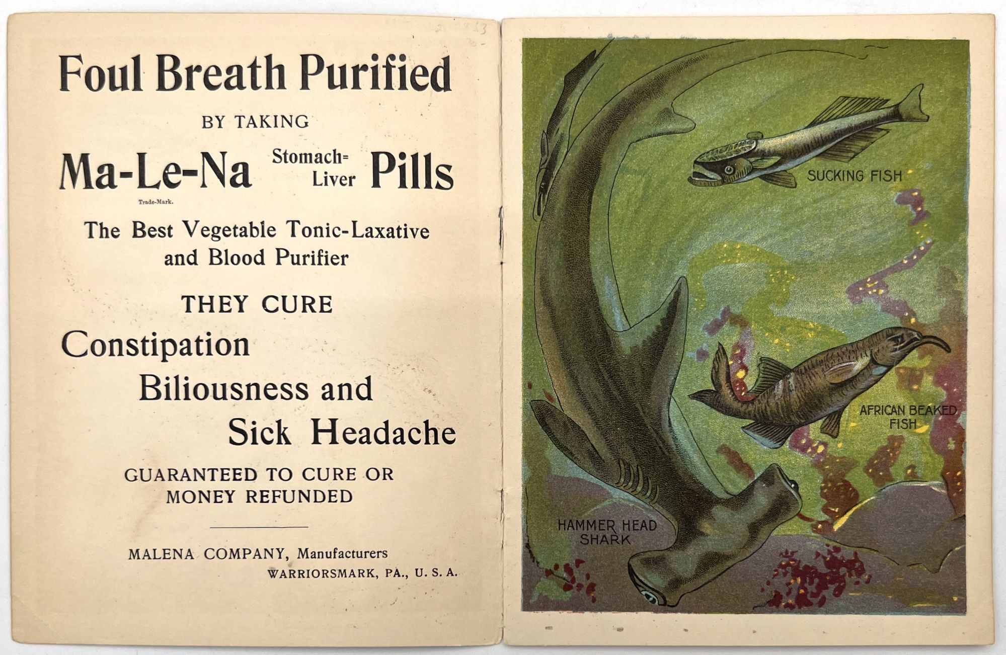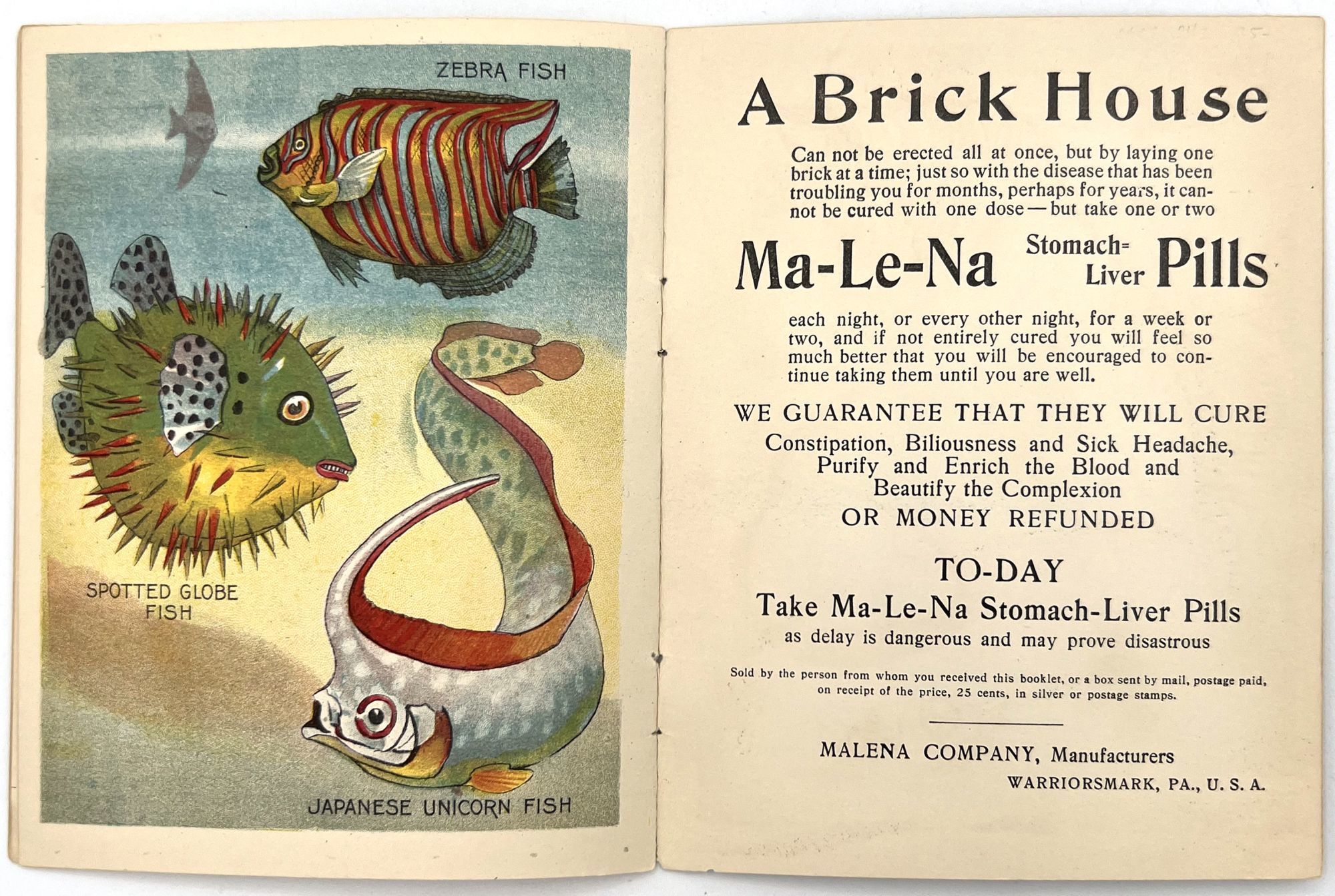 Warriorsmark, Pennsylvania: Malena Company, 1903. Very good. Toned. Minor rubbing to extremities.. An early 1900s illustrated booklet promoting the patent medicine "Ma-Le-Na", marketed here as "the best vegetable tonic-laxative and blood purifier" that is "guaranteed" to cure everything from constipation to headaches and biliousness. Marked as "Booklet No. 116", it offers fun facts and illustrations of strange or interesting sea creatures ranging from the flying fish to angler fish, zebra fish, and mud skippers. Includes line drawn illustrations of the fish in-text, and four full-page color illustrations of some of the fish in-text as well. Single vol. (6.25" by 5"), pp. [8], illus., stapled in in original illus. coated wrps.