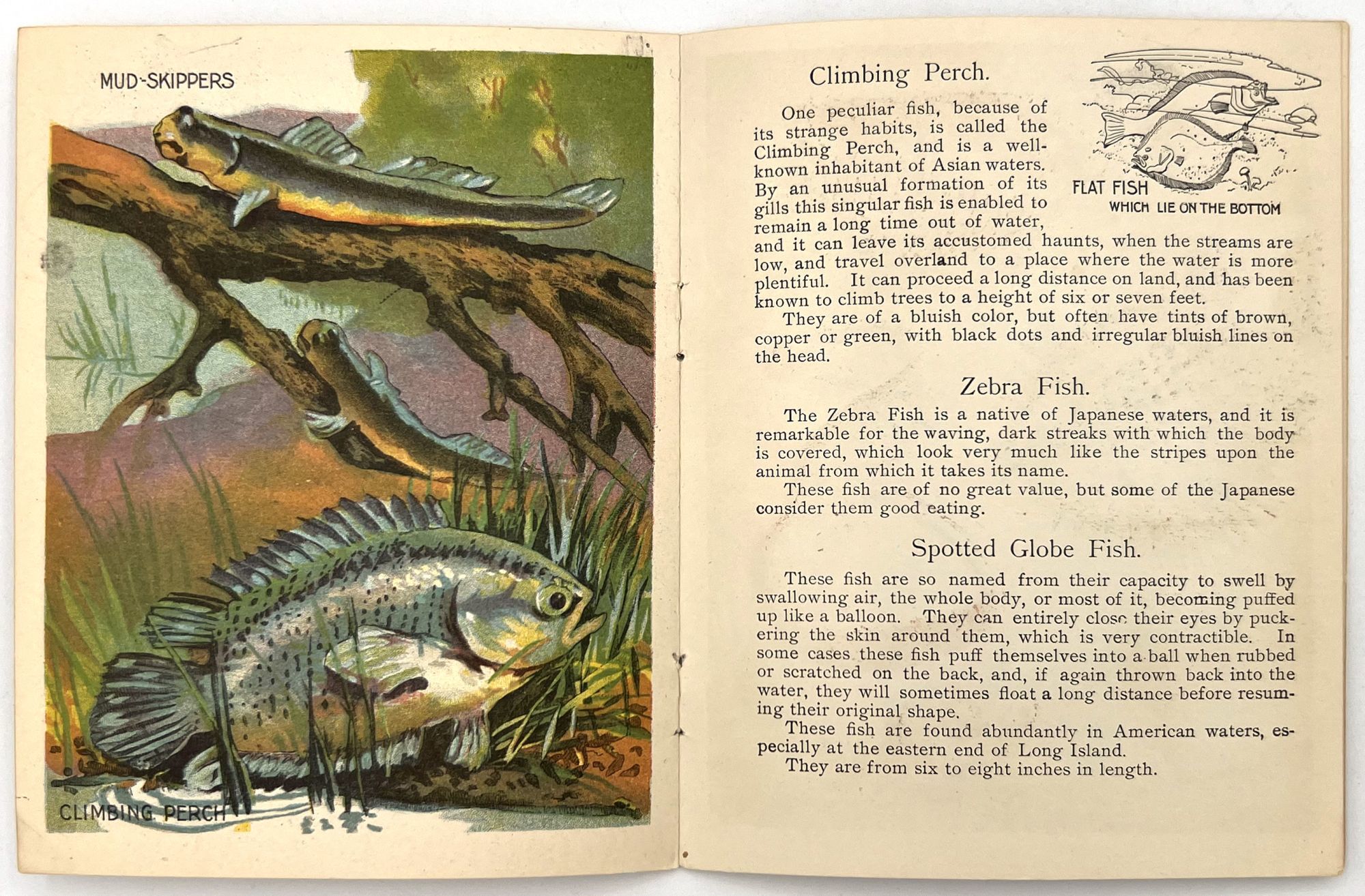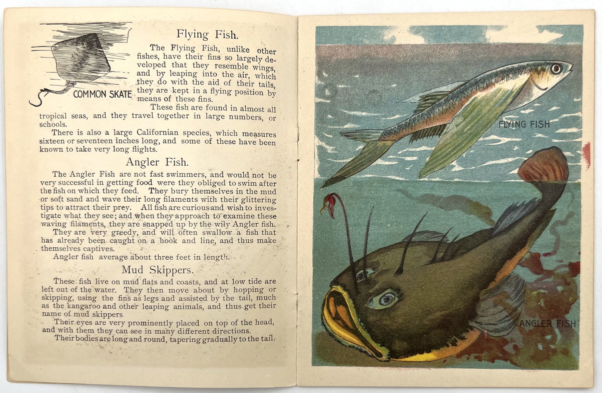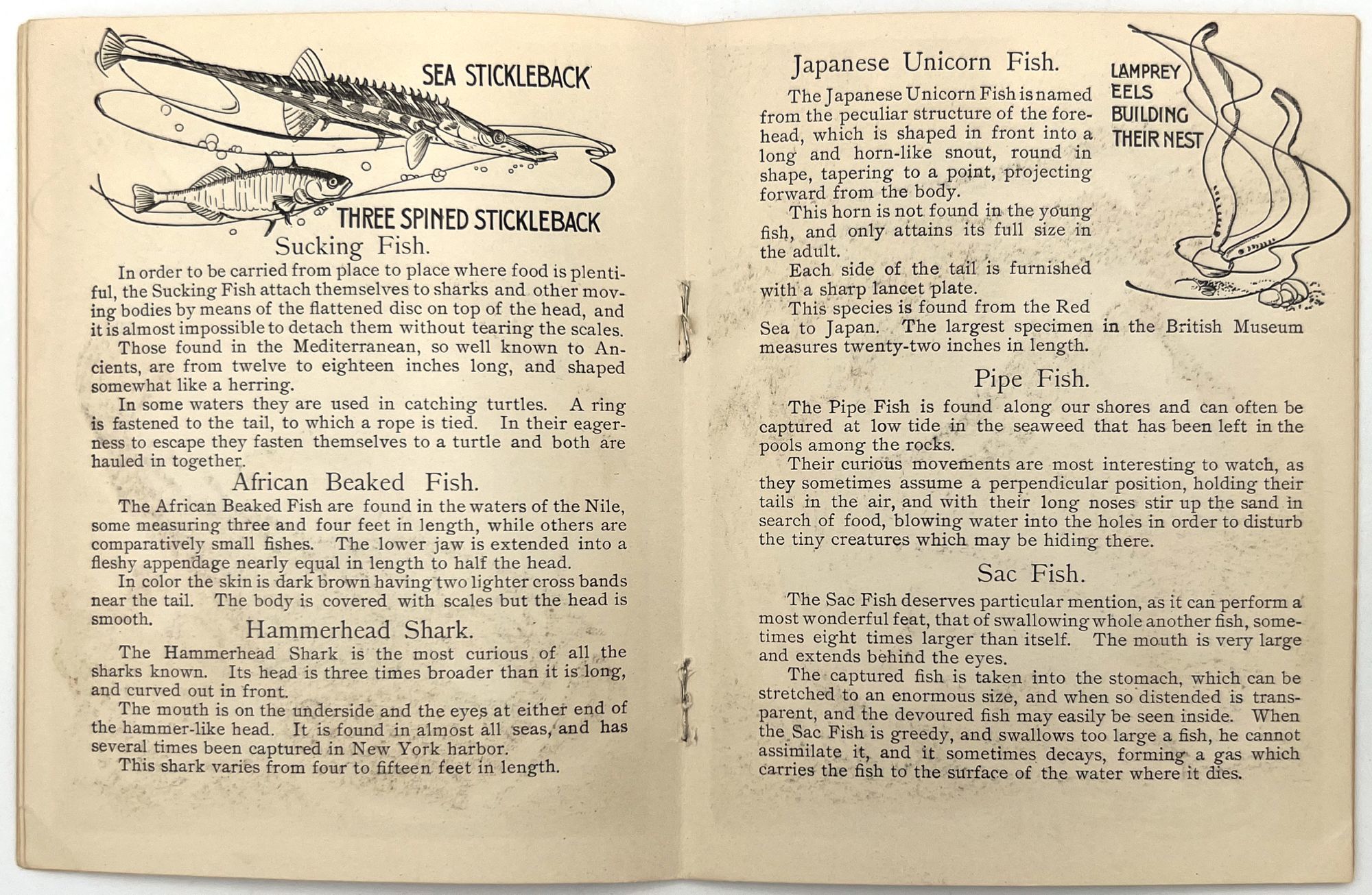 Warriorsmark, Pennsylvania: Malena Company, 1903. Very good. Toned. Minor rubbing to extremities.. An early 1900s illustrated booklet promoting the patent medicine "Ma-Le-Na", marketed here as "the best vegetable tonic-laxative and blood purifier" that is "guaranteed" to cure everything from constipation to headaches and biliousness. Marked as "Booklet No. 116", it offers fun facts and illustrations of strange or interesting sea creatures ranging from the flying fish to angler fish, zebra fish, and mud skippers. Includes line drawn illustrations of the fish in-text, and four full-page color illustrations of some of the fish in-text as well. Single vol. (6.25" by 5"), pp. [8], illus., stapled in in original illus. coated wrps.
