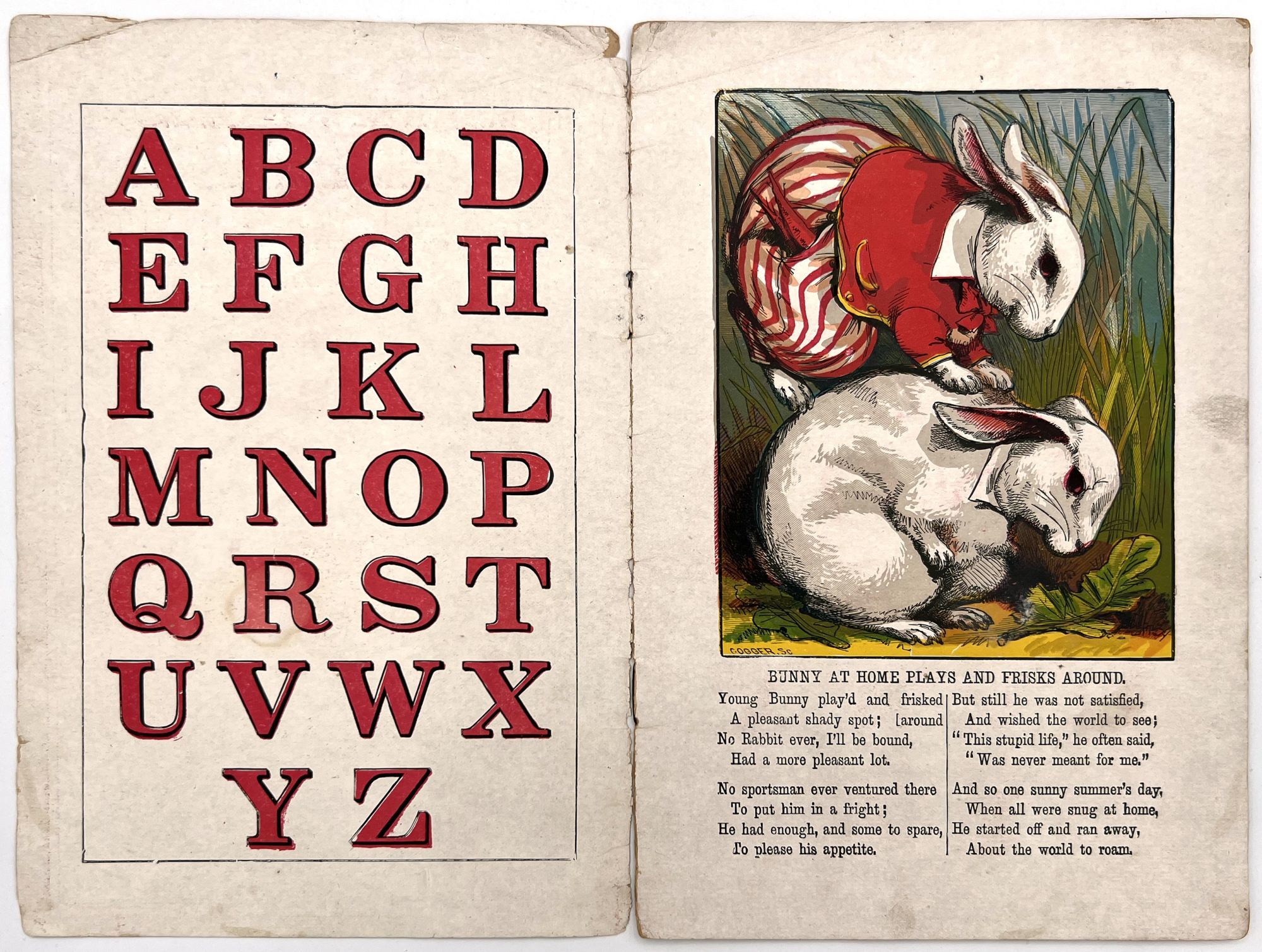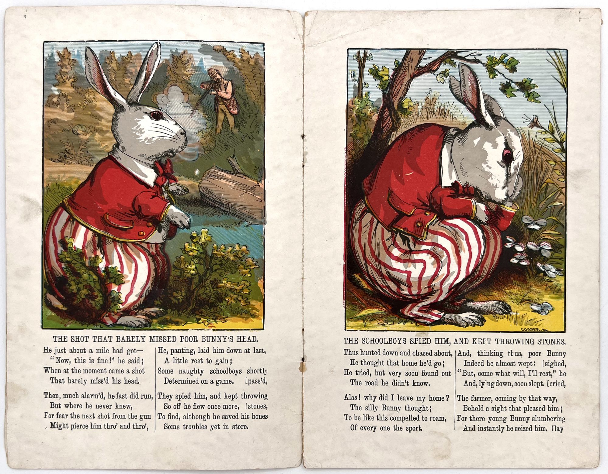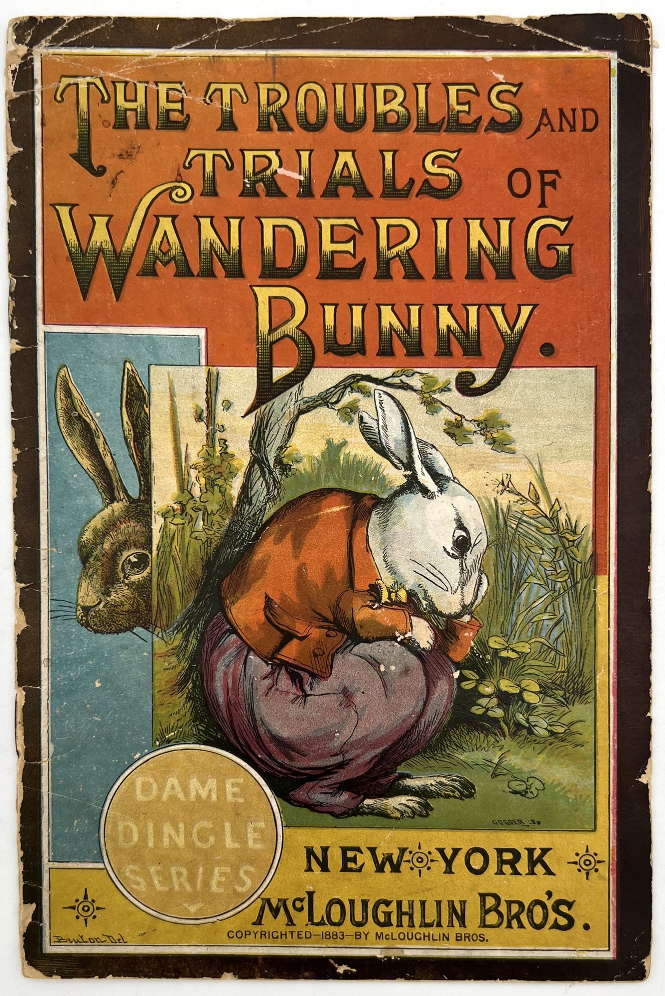 New York, New York: McLoughlin Bros, 1883. Fair. Wrappers worn with short tear to spine, dust soiling.. A charming picture book for early readers published by McLoughlin as a part of their "Dame Dingle Series". Includes an alphabet on the inside of the upper and lower covers. The story is told in verse, and follows a bunny that narrowly avoids a hunter, school boys throwing rocks, is captured by a farmer and fattened up, and escapes to London, before being caught in a trap and killed by a hunter. Each of the eight pages features a half-page chromolitho illustration to accompany the story. Single vol. (9.5" by 6"), pp. [8], illus., in original illus. wrps with image of anthropomorphized bunny on front. Note the back cover depicts two young girls kissing, presumably to comfort one of them for the broken doll at their feet.