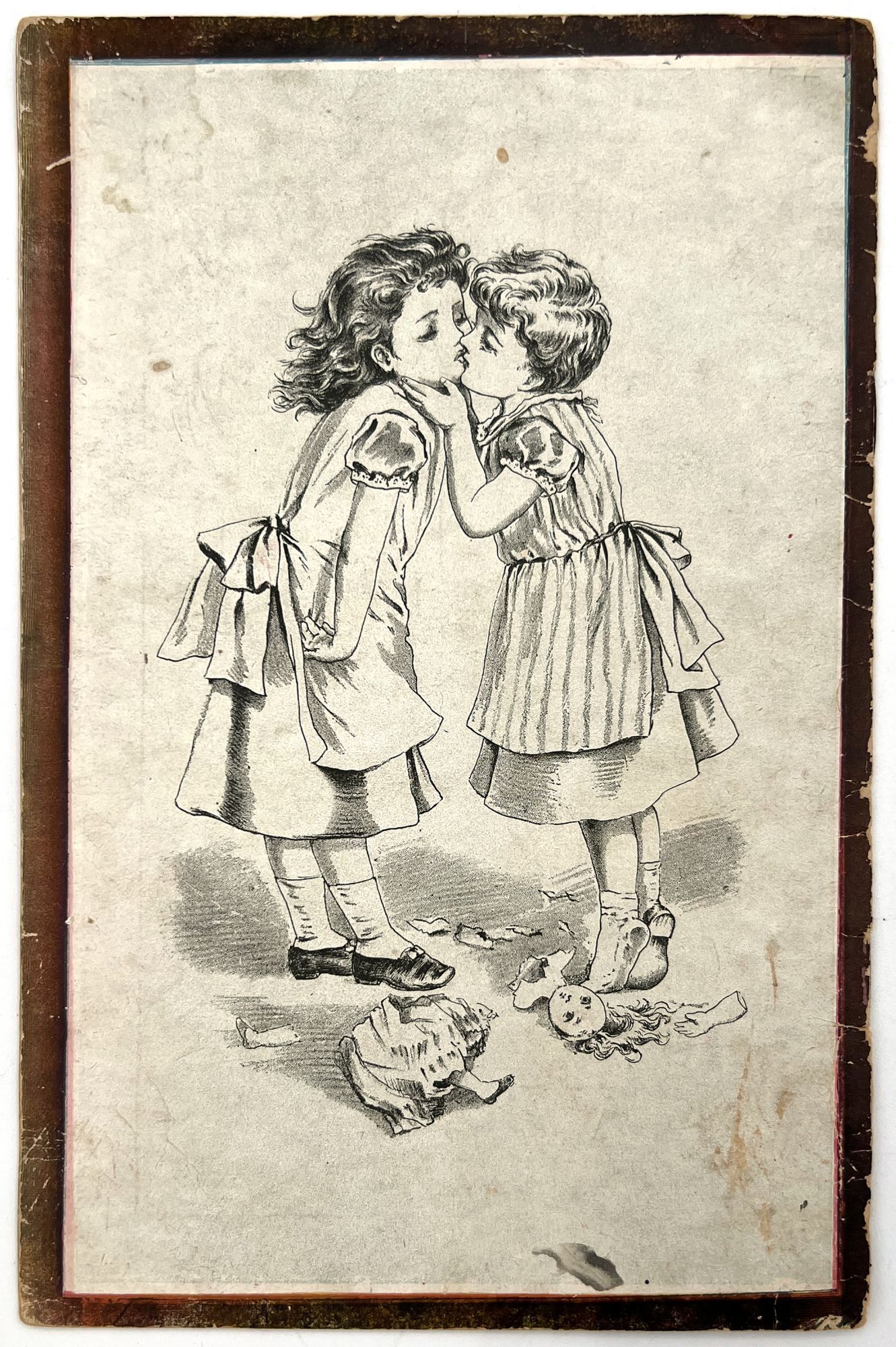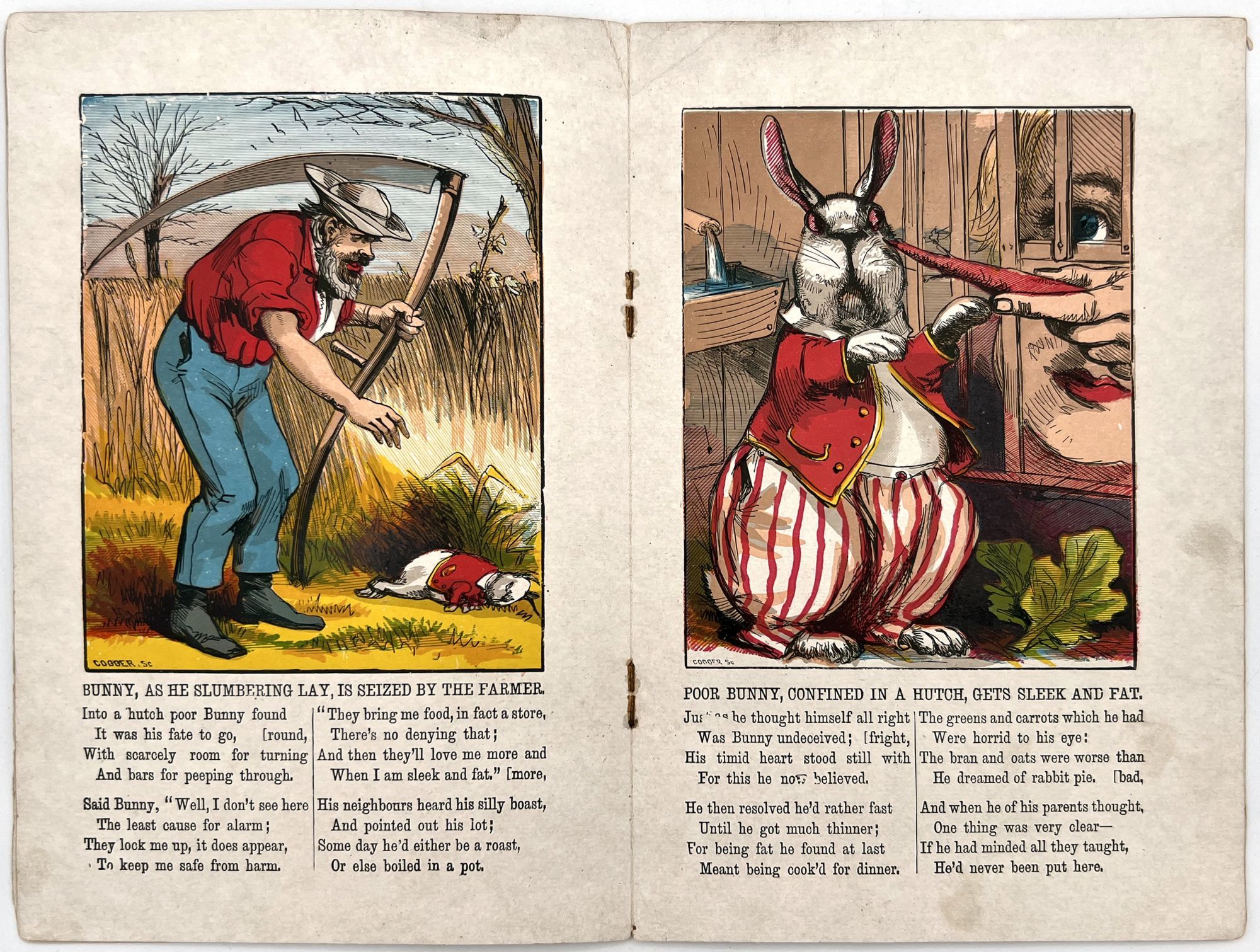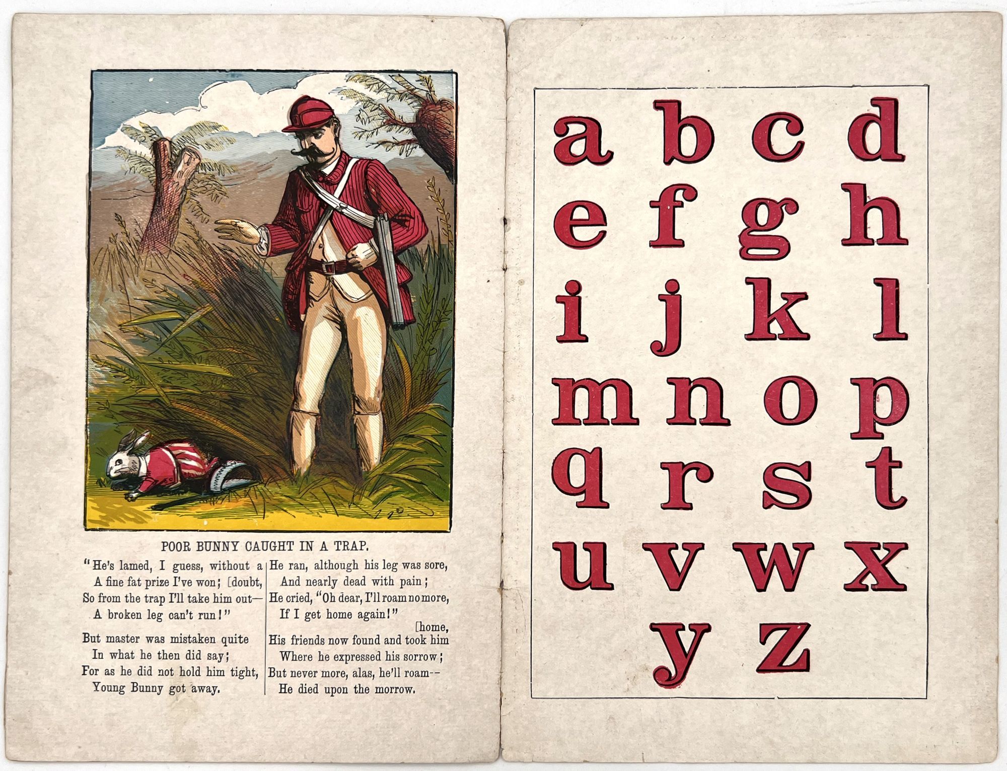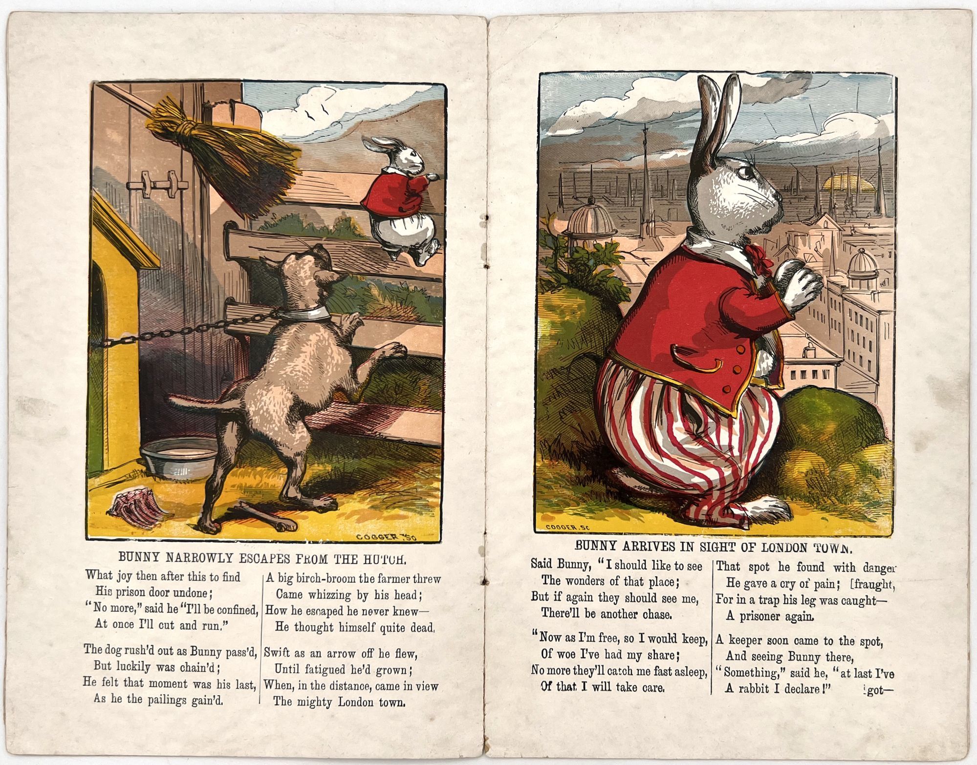 New York, New York: McLoughlin Bros, 1883. Fair. Wrappers worn with short tear to spine, dust soiling.. A charming picture book for early readers published by McLoughlin as a part of their "Dame Dingle Series". Includes an alphabet on the inside of the upper and lower covers. The story is told in verse, and follows a bunny that narrowly avoids a hunter, school boys throwing rocks, is captured by a farmer and fattened up, and escapes to London, before being caught in a trap and killed by a hunter. Each of the eight pages features a half-page chromolitho illustration to accompany the story. Single vol. (9.5" by 6"), pp. [8], illus., in original illus. wrps with image of anthropomorphized bunny on front. Note the back cover depicts two young girls kissing, presumably to comfort one of them for the broken doll at their feet.