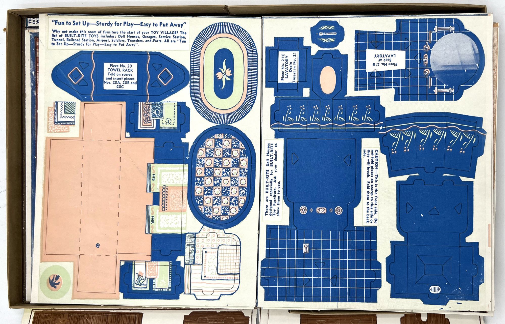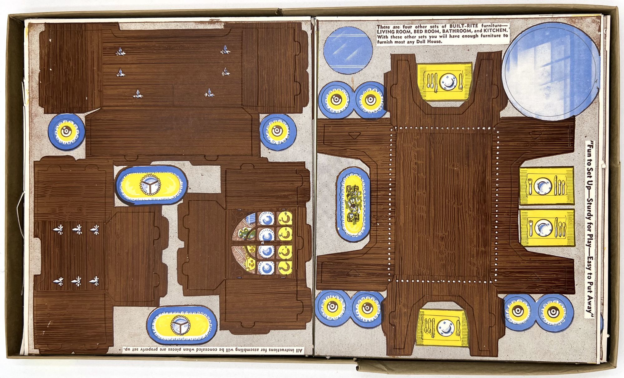 N.pl: Built Right Toys, 1940. Good.. In original litho on pasteboard box. Heavy stock punch out pieces of furniture with instructions for assembly on reverse. The directions are hidden when the furniture is assembled. Includes Living Room, Bedroom, Dining Room, Bathroom and Kitchen. Box measures 8.25" by 14.25". End apron lacking, separations and repairs on side aprons. Content complete and intact.