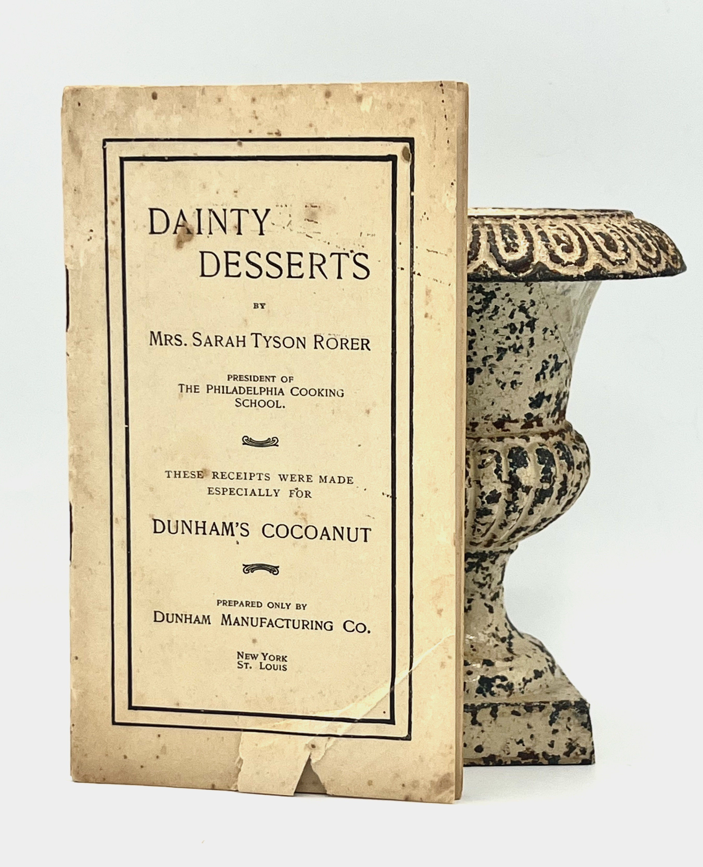 New York: DUNHAM MANUFACTURING CO., c. 1910. Staplebound. White wraps. Very good. 32 pages. 16 x 9 cm. Rorer promotes Dunham's Original Shred Cocoanut, a popular brand of prepared coconut, known for its use in baking and other culinary applications. It was particularly popular during the late 19th and early 20th centuries. Illustrations show product suggestions and recipes. Includes advice on use of coconuts, index, and recipes. Sarah Tyson Rorer (1849-1937) was a cooking teacher and dietitian who founded the Philadelphia School of Cookery in 1884. She became a leading figure in American domestic science, and was well-known in the United States for her practical and versatile cookbooks and demonstrations. Front and back cover soiled with 1 cm. closed tear. Interior clean. [BROWN 3644]