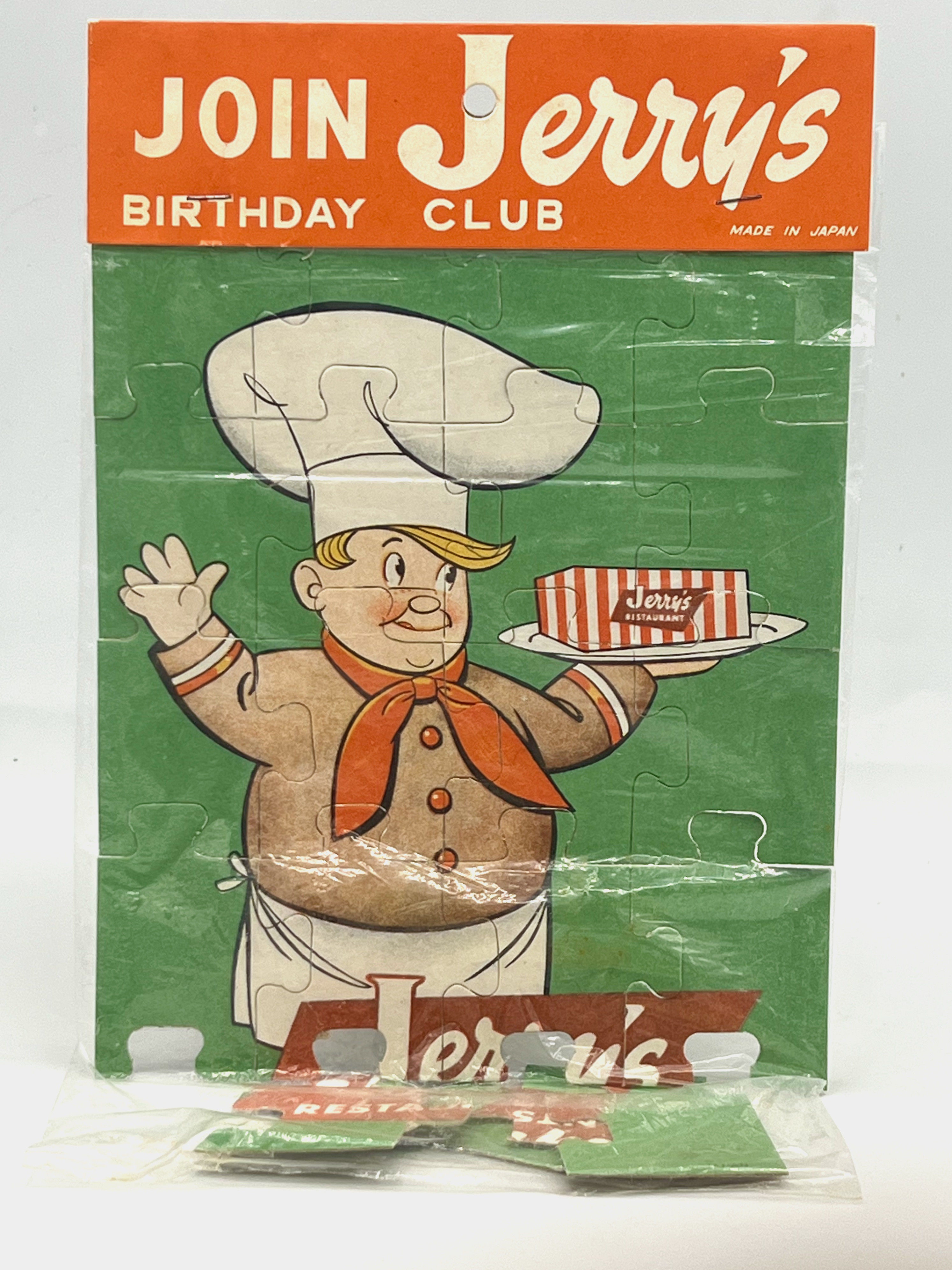 c. 1960. Color illustrated cardboard. Fine. 23 x 15 cm. Unopened jigsaw puzzle featuring the mascot of Jerry's restaurant. Jerry's Restaurants was an American restaurant chain founded by Jerry Lederer. Lederer initially opened the White Tavern restaurant in Kentucky in 1929 and later opened Jerry's in 1946. Very similar to Big Boy restaurants, Jerry's started franchising in 1957 and was mostly located in the Midwest and South.