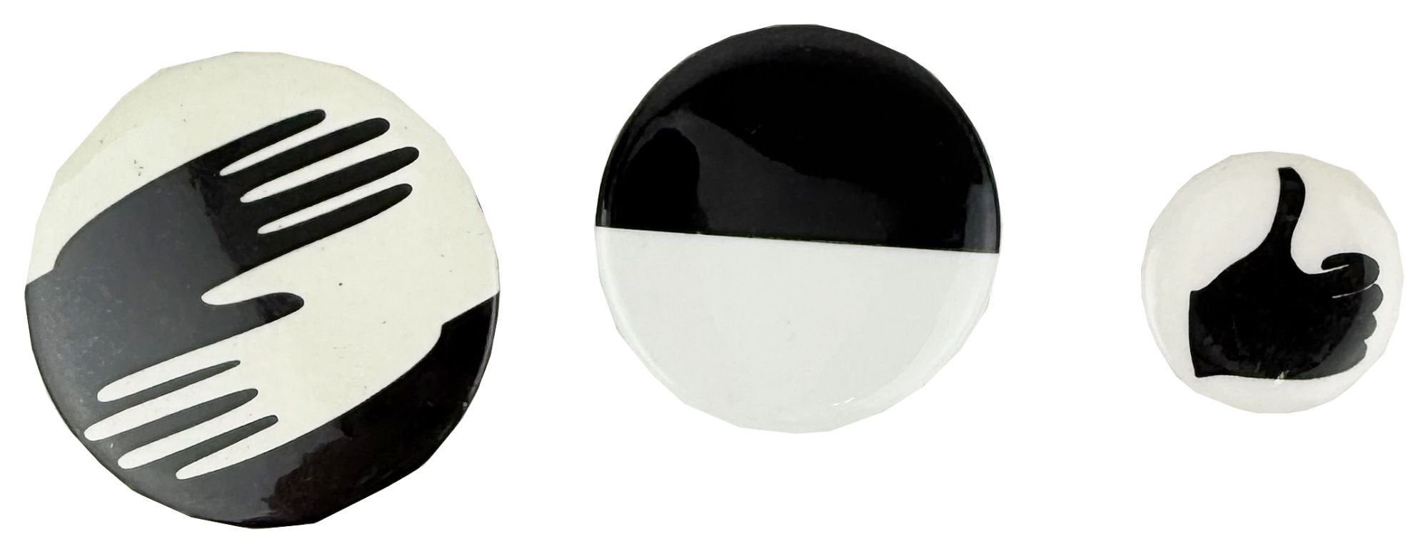 Lovely trio of pins stripped down of text, simply evoking the spirit of the Civil Rights movement through design: a Black and white hand mirroring one another; a Black hand giving a thumbs up; a half moon.