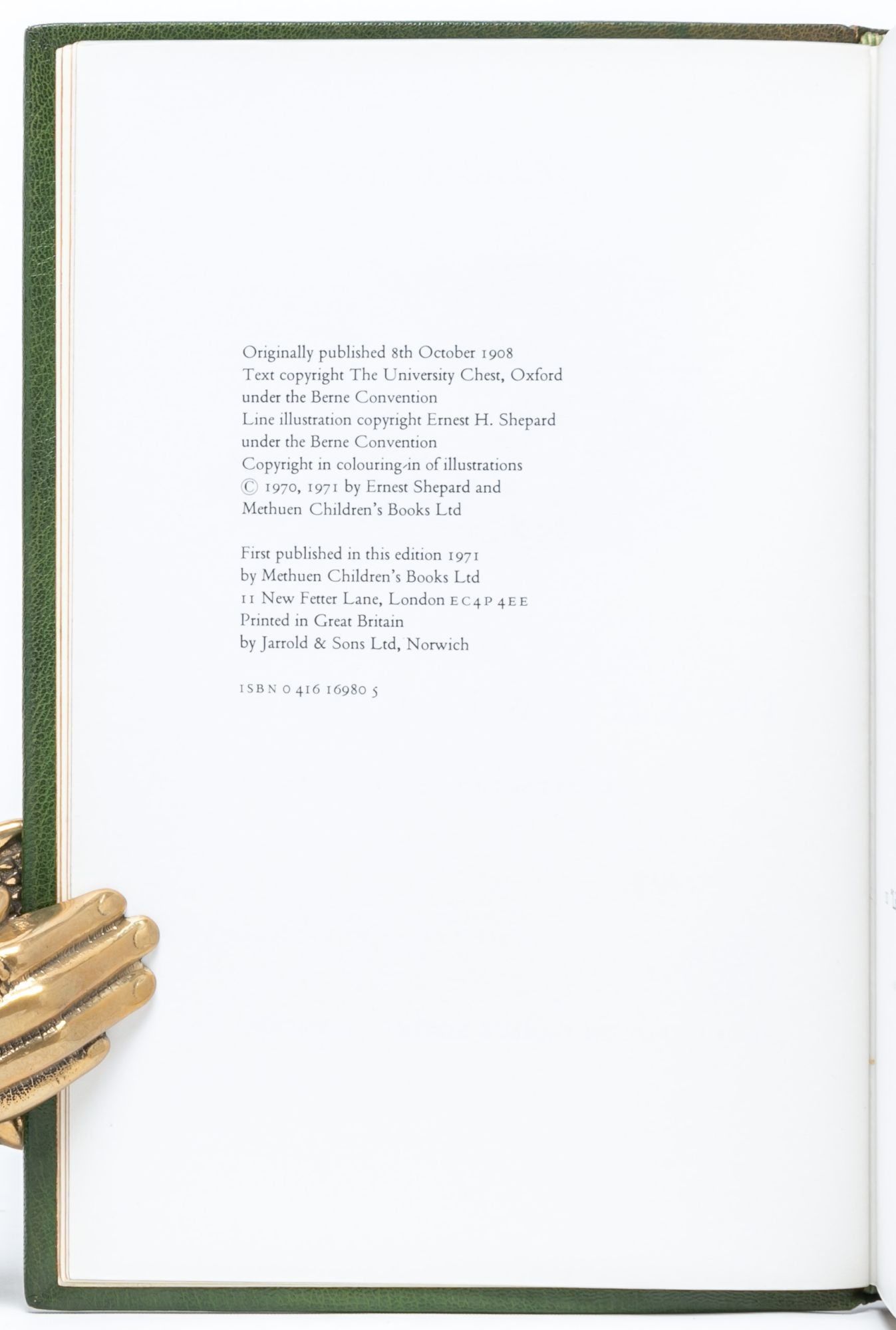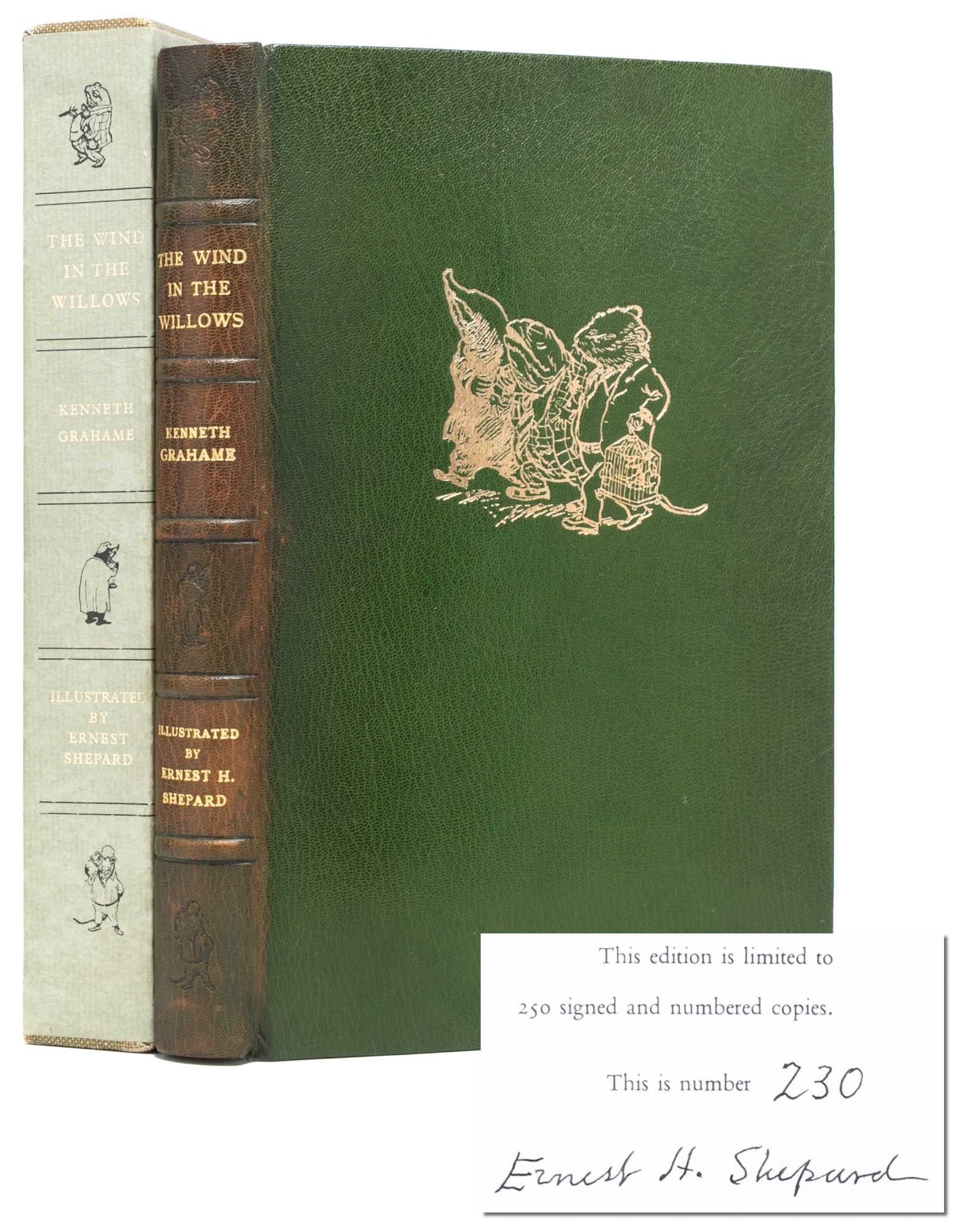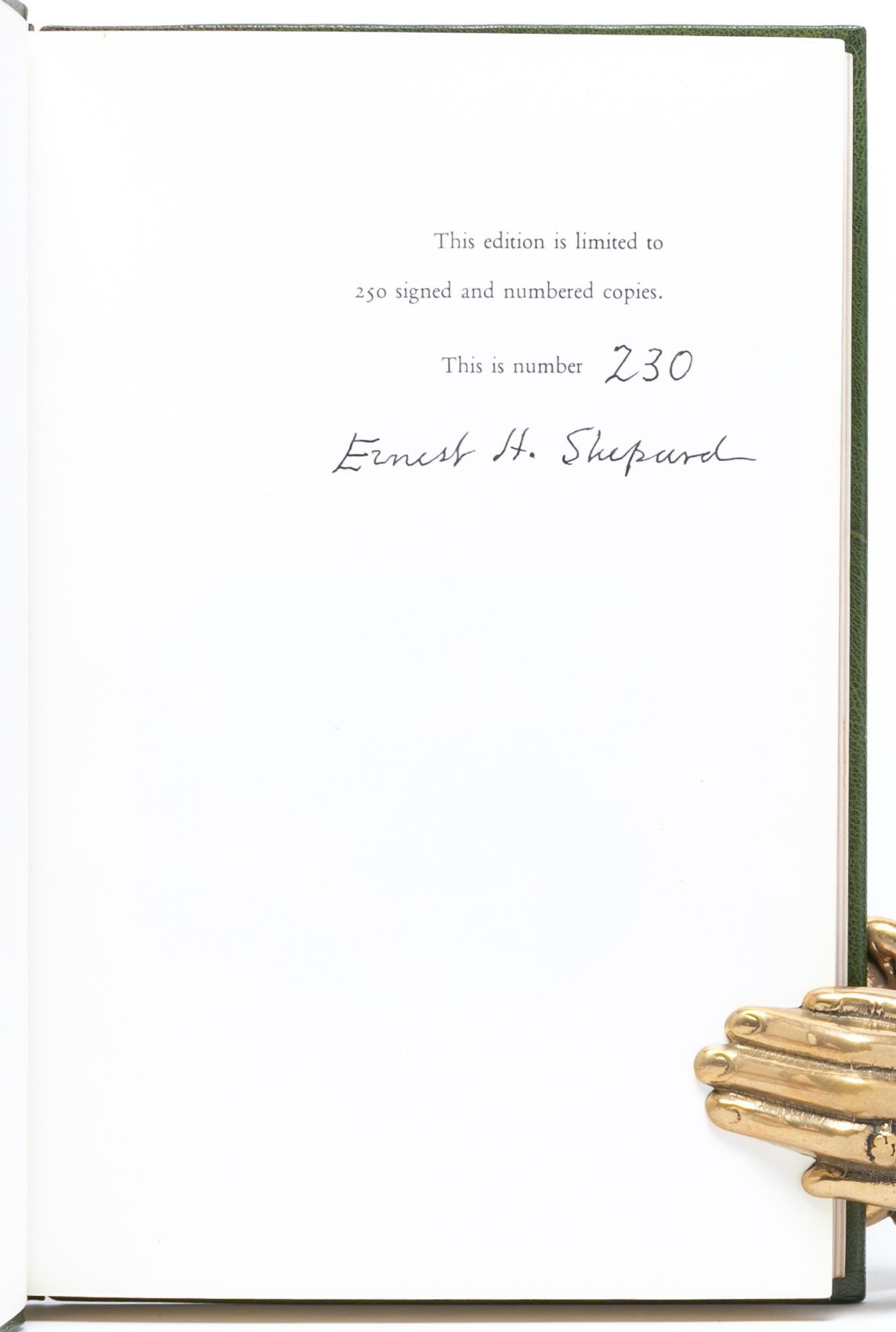 London: Methuen Children's Books, 1971. First thus. Fine/Near Fine. One of 250 copies signed by the illustrator, Ernest H. Shepard. Bound in publisher's full green morocco by Zaehnsdorf in the publisher's printed slipcase. Illustrated in color throughout by Shepard, with illustrated map endpapers and a title-page vignette. Some sunning to spine, but still a lovely, Fine copy, bright and fresh throughout. Slipcase Near Fine with some sunning to edges.
