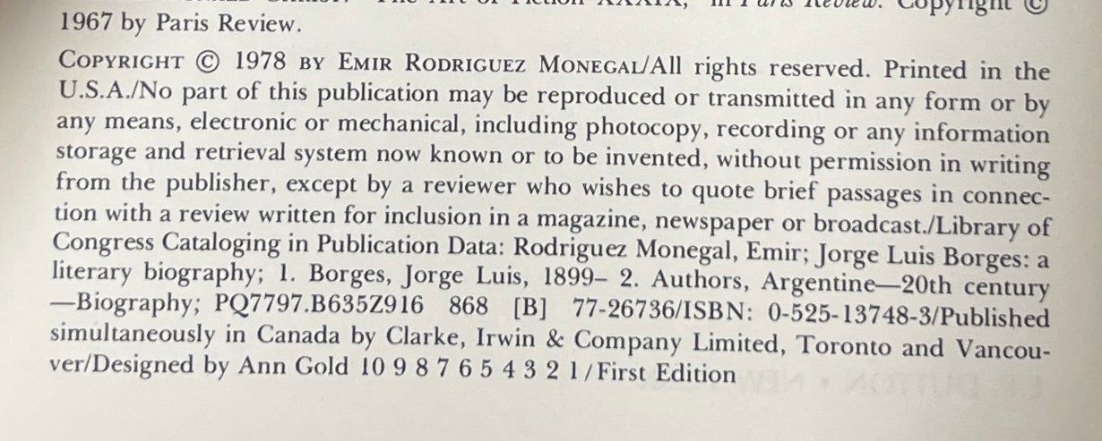New York: E.P. Dutton, 1978. First Edition. Hardcover. Fine/Very Good. Fine in a Very Good jacket, unclipped ($12.95), bumped and with some short tears at the edges. Quarter cream cloth with brown paper on the boards. Square and firmly bound, former owner's signature on the front endpaper, clean otherwise. Here, Monegal tracks the development of Borges's artistry from his childhood growing up around Buenos Aires to his breakthrough in the French literary scene.