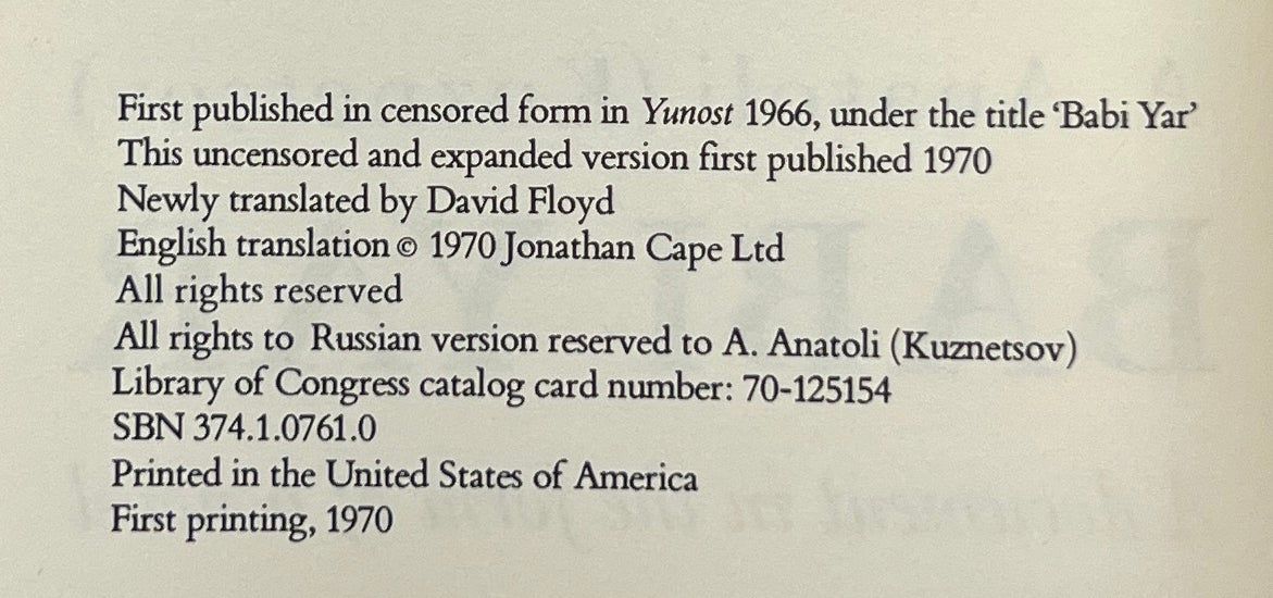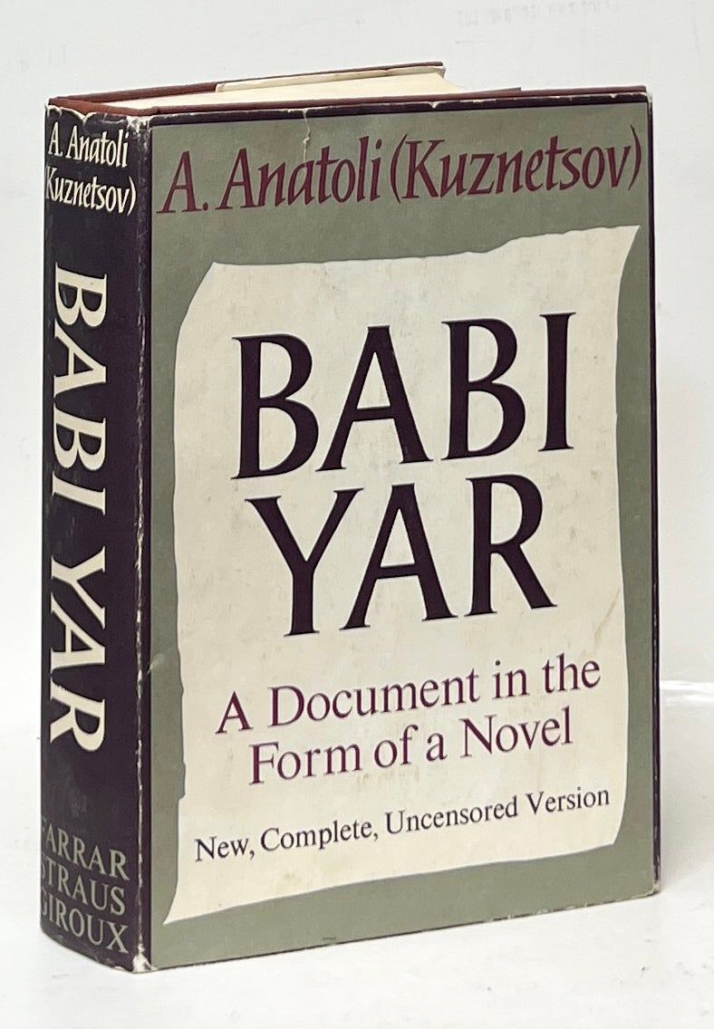 New York: Farrar, Straus and Giroux, 1970. First Edition Thus. Hardcover. Near Fine/Very Good. Translated by David Floyd. Near Fine in a Very Good jacket, unclipped ($10.00), lightly soiled, rubbed at the edges, a few short tears. Purple cloth with gilt lettering on the spine. Square and firmly bound, clean internally. The first uncensored English edition of Anatoli's novel of Nazi occupation of Kyiv.