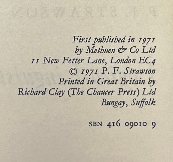 London: Methuen & Co Ltd, 1971. First Edition. Hardcover. Near Fine/Very Good. Near Fine in a Very Good jacket, unclipped (£2.75), bumped and with a few very short tears. Brown cloth with a dark brown ink panel on the spine with gilt lettering. Square, bound with some reading wear, clean internally. A selection of twelve papers on logic and language from the Oxford professor.