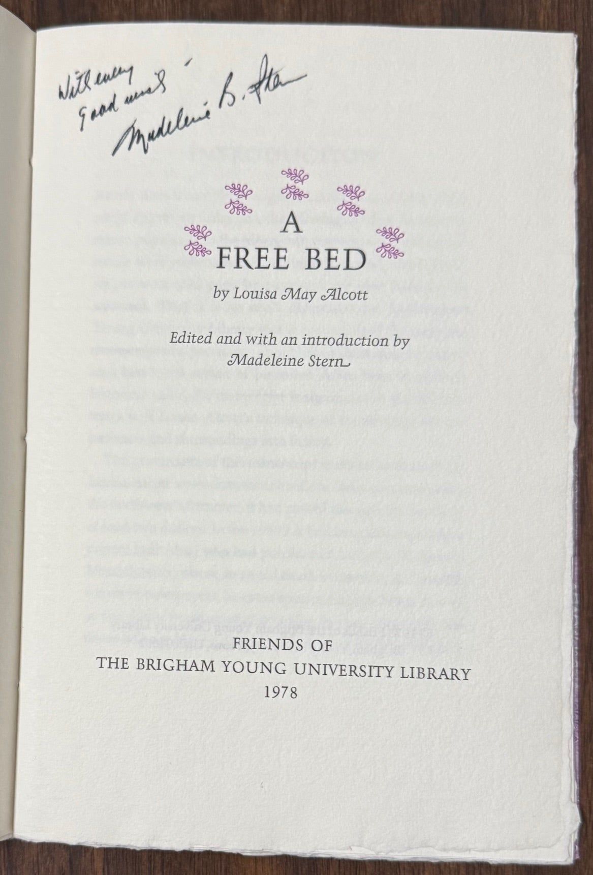 Provo: Brigham Young University Library, 1978. Limited. paperback. fine. Edited and with an introduction by Madeleine B. Stern. Handsomely printed by Henry Morris on hand-made paper for Friends of the Brigham Young University Library, Provo Utah. [19] pages plus the prospectus laid-in. Slim 8vo, purple marblized wrappers with printed label, string bound. Provo: Friends of the Brigham Young University Library, 1978. Limited first edition -- number 35 of 350 copies. Signed by Stern on the title page: "with every good wishes". Fine.