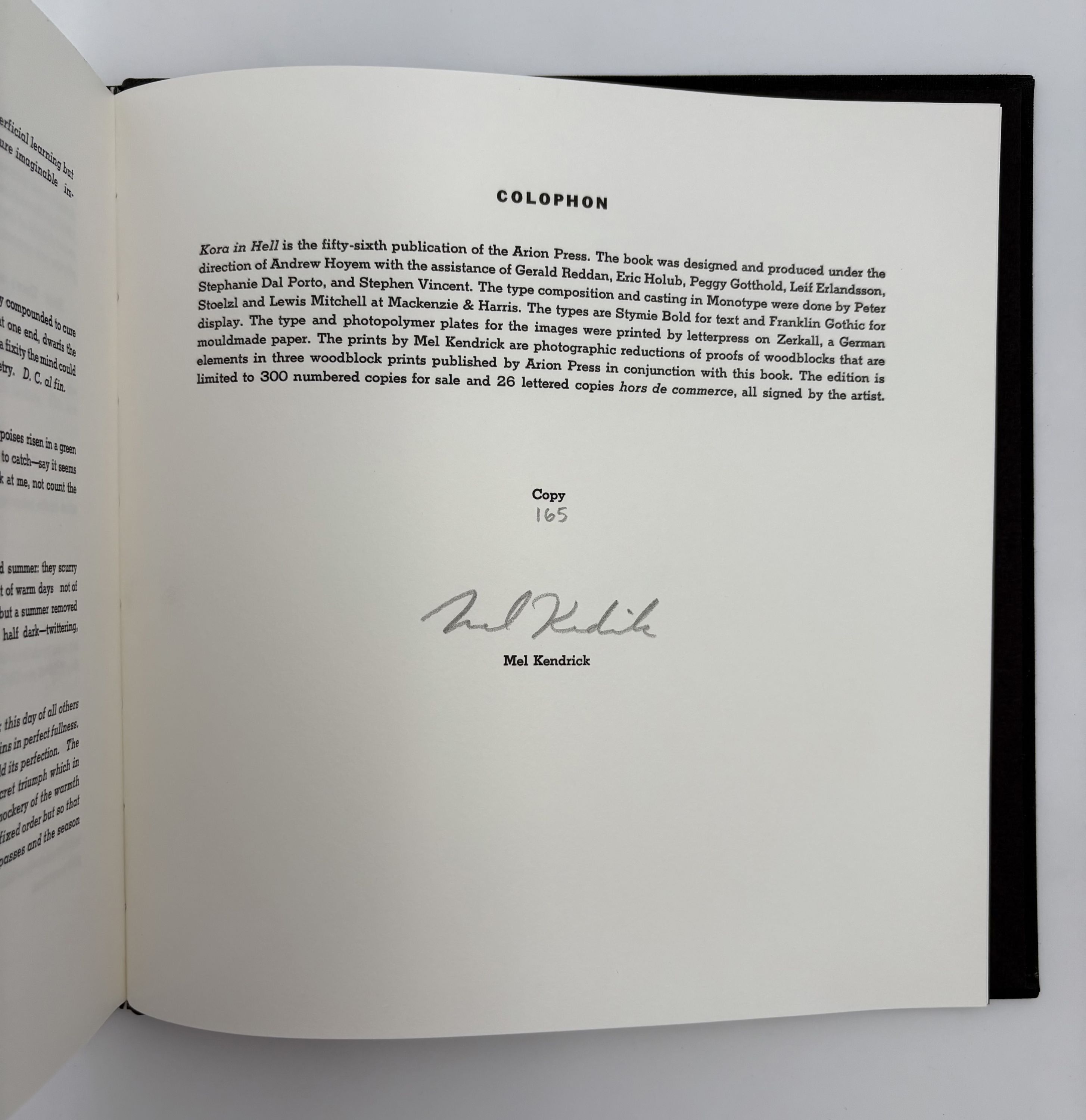 San Francisco: Arion Press, 1998. Limited. hardcover. fine. Mel Kendrick. Introduction by Lawrence Kart. Illustrated with 21 monochrome prints by Mel Kendrick. Slim 4to, publisher's black leather-backed cloth boards with wood veneer overlay, cut in the manner of Kendrick's prints; title in red on the spine. San Francisco: Arion Press, 1998. Fine.