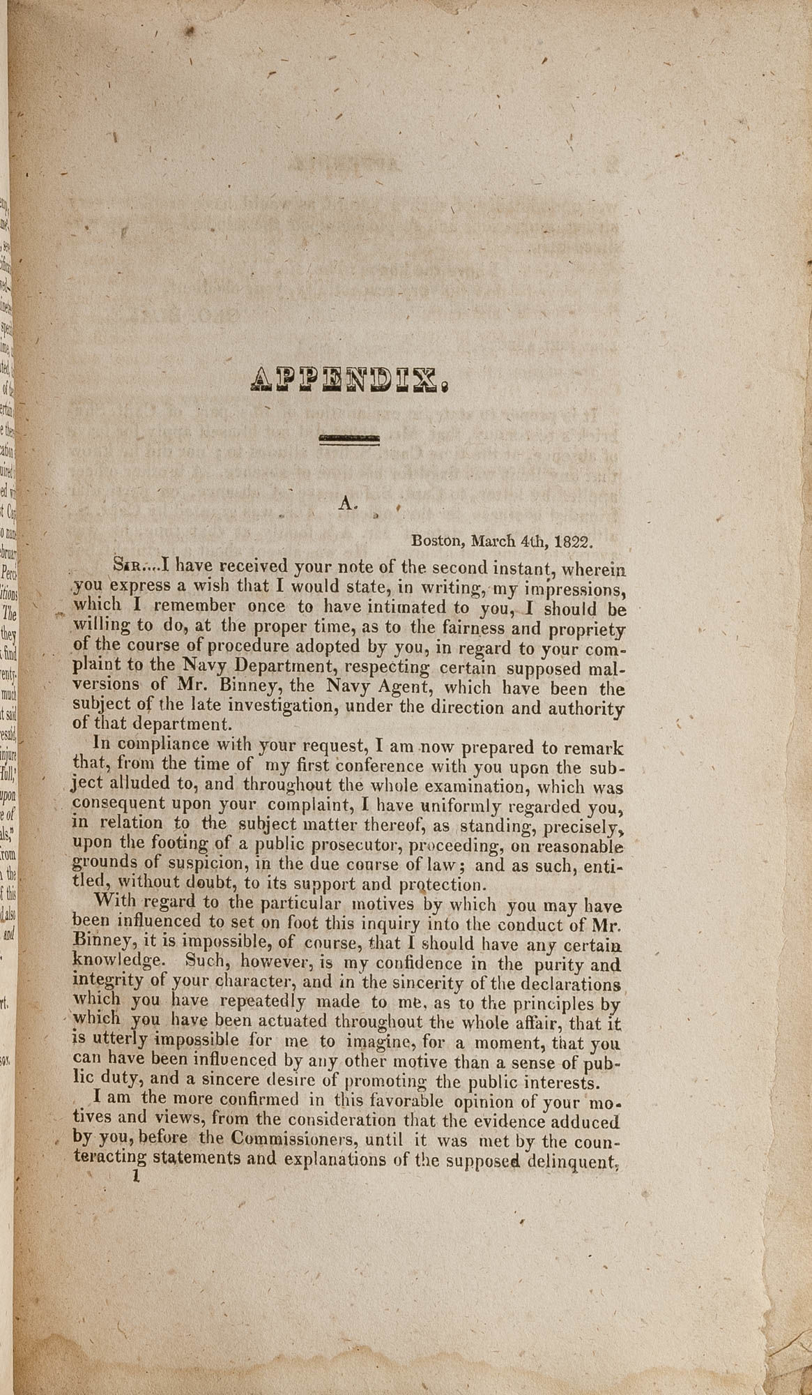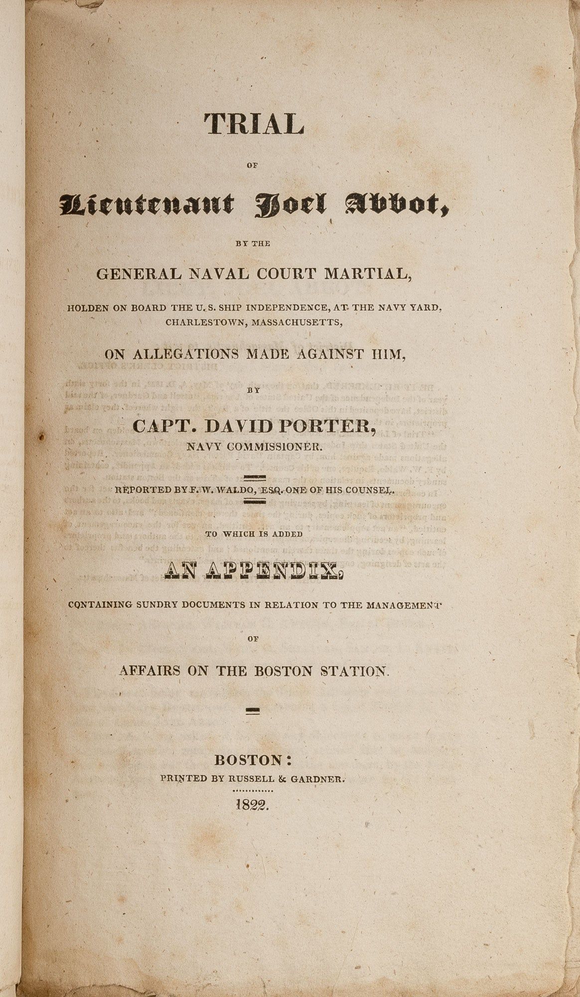 1822. Boston: Russell & Gardner, 1822. First edition.. Boston: Russell & Gardner, 1822. First edition. Copy of a Report of an Early U.S. Navy Court Martial with an Interesting Provenance [Trial]. [Abbot, Joel (1793-1855), Defendant]. Trial of Lieutenant Joel Abbot by the General Naval Court Martial, Holden on Board the U.S. Ship Independence, At the Navy Yard, Charlestown, Massachusetts, on Allegations Made Against Him, by Capt. David Porter, Navy Commissioner. To Which is Added an Appendix, Containing Sundry Documents in Relation to the Management of Affairs on the Boston Station. Boston: Printed by Russell & Gardner, 1822. 164, 72, [1] pp. Octavo (9-1/2" x 6"). Stab-stitched pamphlet with untrimmed edges bound into recent three-quarter morocco over marbled boards, raised bands gilt title and blind publication date to spine. Negligible light rubbing to extremities, moderate toning to interior, light foxing to a few sections, marks in early pen to margins of a few leaves, early inscription to front endleaf: "Presented to the Honble/ Churchill C. Cambreleng/ Member of the U.S. Congress/ [Geo.] Washington" ("Geo." added in a later, mischievous, hand). $500. * First edition, one of two issues, the other published in Washington, DC, by Davis and Force the same year. Abbott was a distinguished naval officer who fought on the frigate President during the War of 1812. He was tried, on charges brought by Porter, for making "scandalous and false insinuations" of corruption against his superior officer, Captain Isaac Hull, perhaps the greatest American naval hero of the War of 1812. Found guilty, Abbot was suspended from the naval service for the period of two years. Churchill Caldom Cambreleng [1786-1862] was a New York City merchant and politician. He served in the United States House of Representatives from 1821 to 1839, where he was a prominent member who chaired several high-profile committees. He later served as U.S. Minister to Russia from 1840 to 1841. Cohen, Bibliography of Early American Law 13396.