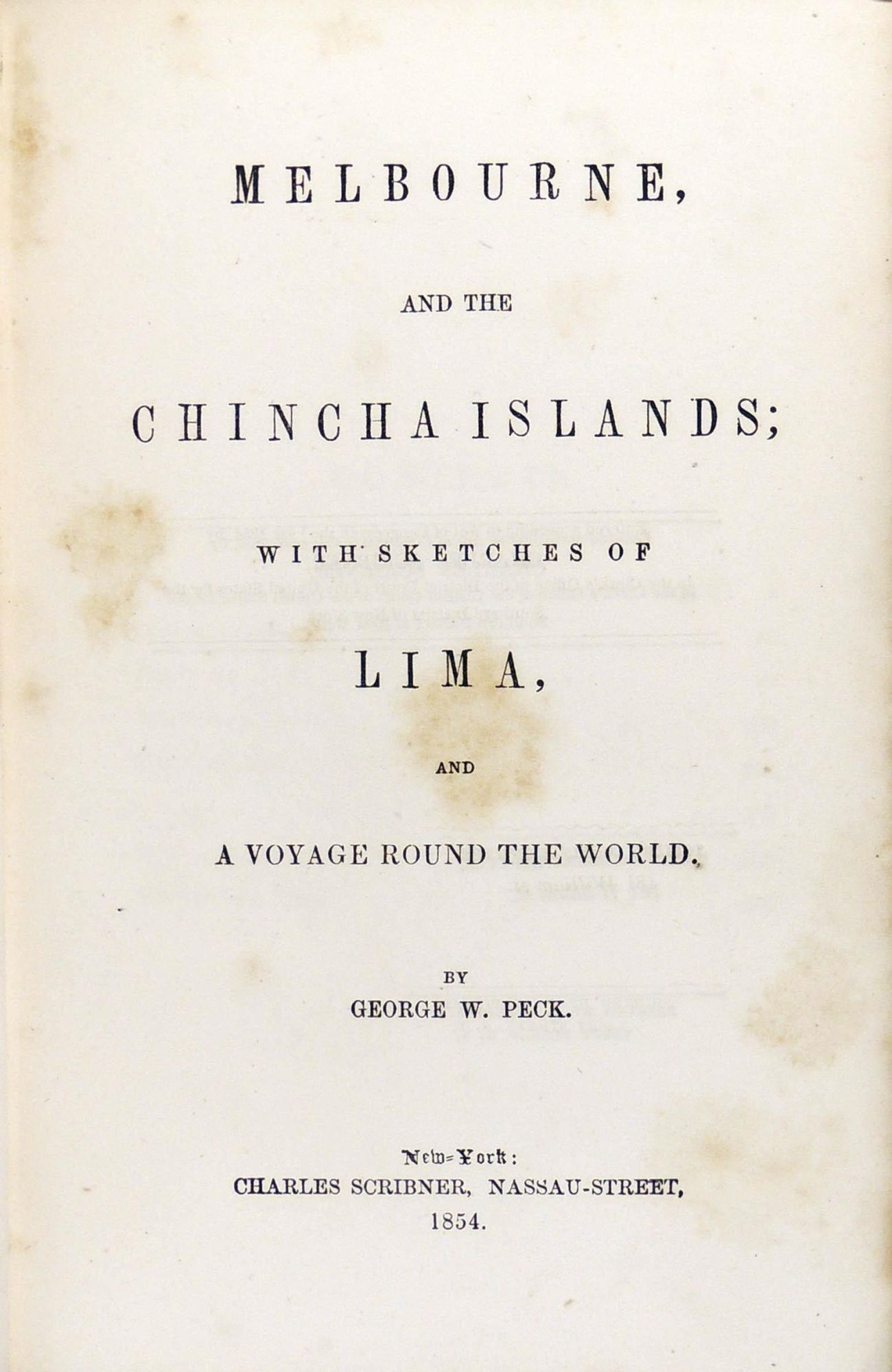 New York: Charles Scribner, 1854. Hardcover. Very Good. Hardcover. George Peck was an American writer who traveled round the world as a ship passenger and wrote this travelogue while on board ship. In addition to describing the adventures of sailing, including encountering turbulent weather and observing small island communities, he describes in detail his time in Melbourne, Australia and in visiting the Chincha Islands, which is a small group of islands just off the coast of Peru near the city of Pisco. These islands are best known for being covered with guano, which was harvested for commercial use in the mid-1800s. Peck describes trying to walk in guano and watching foreign laborers hard at work on these otherwise unpopulated islands. He also recounts his visit to Lima. Octavo. Purple cloth-covered boards blind-stamped on front and back covers, with title in gilt to spine. Spine is sunned to brown, as are some edges of covers. Minor rubbing to top and bottom of spine and to edges of covers. Heavy foxing to front and rear endpapers. Text block has minor foxing on some pages, but is otherwise clean. 294 pages. TRAVEXP/060425.