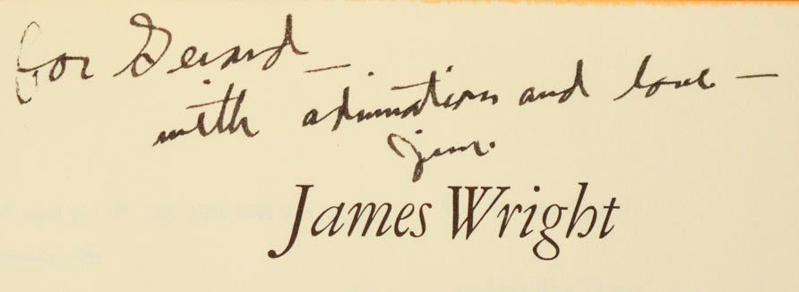 New York: Farrar, Straus and Giroux, 1973. First edition and first printing. Hardcover. 59 pages. A collection of poems from Wright whose previous book won the Pulitzer Prize in 1972. A very near fine copy in two tone cloth boards and in a near fine dust jacket with some very minute wear. Signed and inscribed by Wright on the title page to fellow writer Gerard Malanga: "for Gerard with admiration and love - Jim." A terrific association copy.