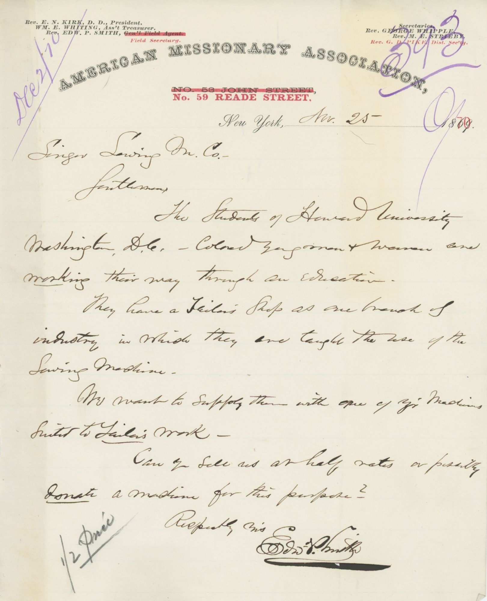 1870 Letter from Rev. Edward P. Smith to the Singer Sewing Company Requesting a Sewing Machine for Howard University Students