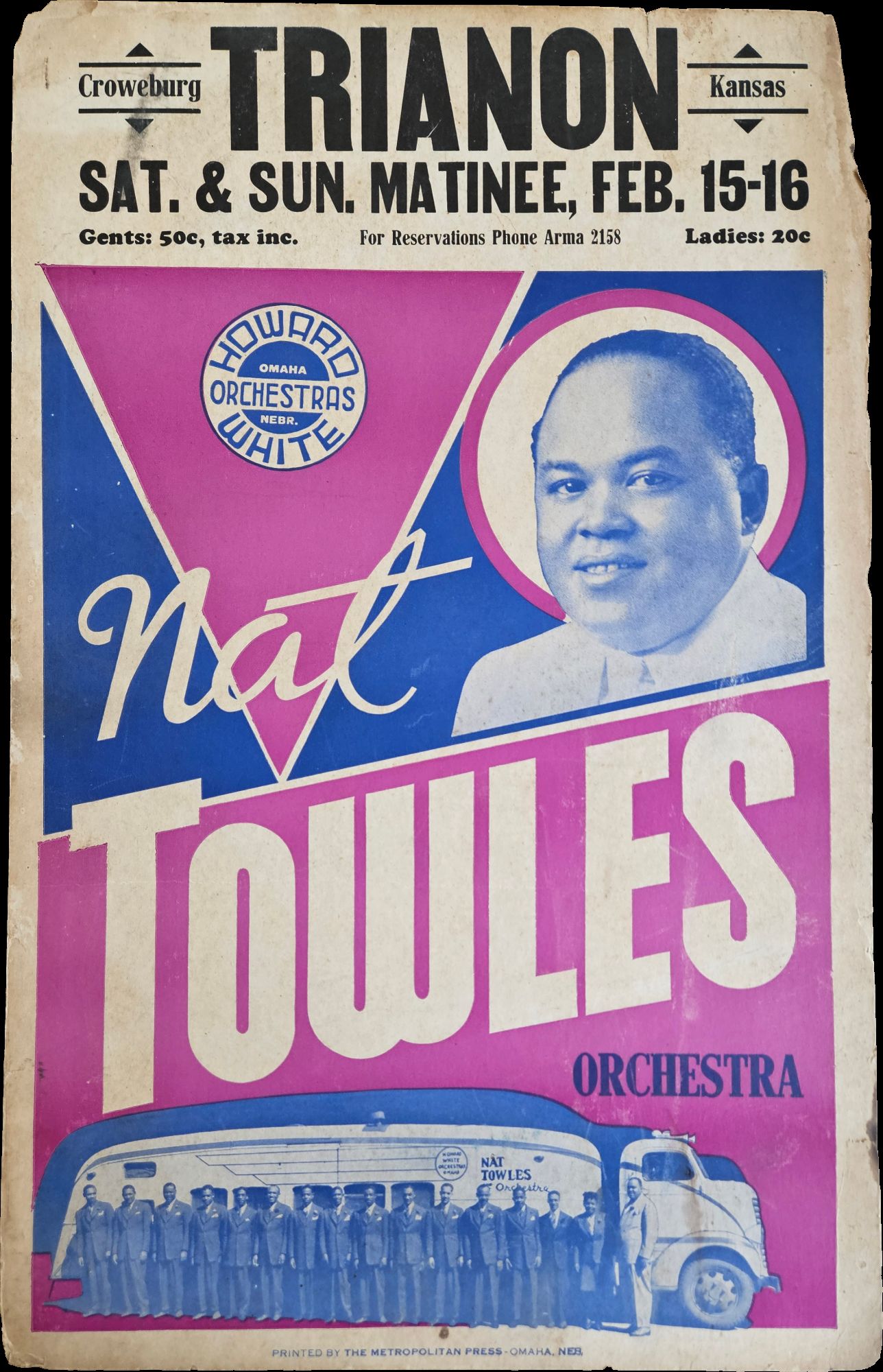 Omaha, Nebraska: The Metropolitan Press, 1930. 14 x 21 ½ inch poster. Worn with marginal damage; very good plus.. Nat Towles (1905–1963) was a jazz musician and bandleader from New Orleans. His band, first called Nat Towles’ Creole Harmony Kings, was a renowned territory band in Texas, Oklahoma, Kansas, and Nebraska. They would later have residences in Omaha and Chicago and tour New York City. Offered here is a poster for the Nat Towles Orchestra at the Trianon Ballroom in Croweburg, Kansas, likely from the 1930s given the location and band name. Croweburg was a coal mining town—and a sundown town until 1912.[1]
