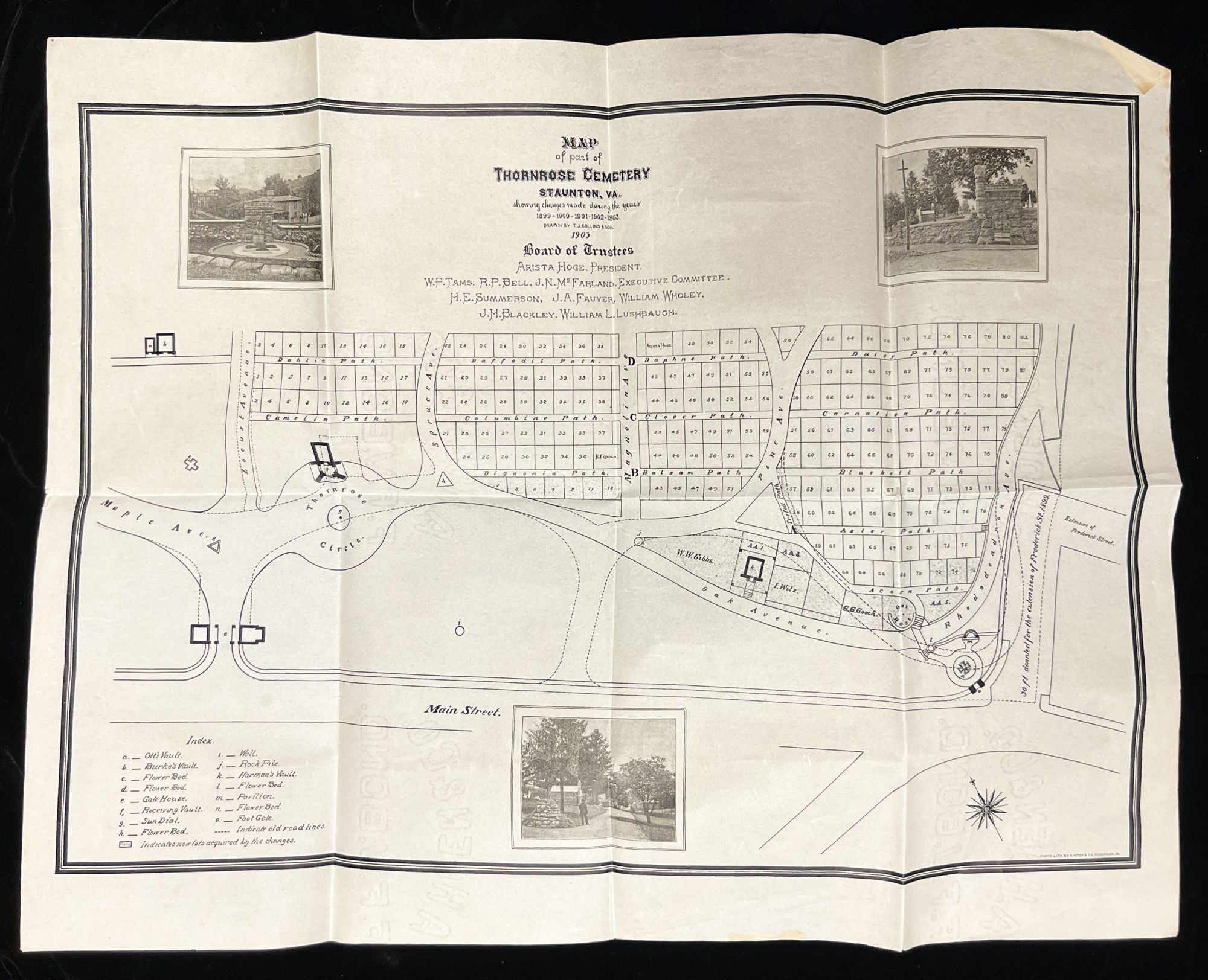 Richmond, Virginia: A. Hoen & Co, 1903. Very good. Some dust soiling, a couple nicks.. A lithographed map from 1903 showing a plan of Thornrose Cemetery [in] Staunton, Virginia, showing changes made to the property between 1899 and 1903. Depicts changes to pathways and roadways. Includes three (3) inset photos of the cemetery, and a key/index. Measures approx. 19" by 23", verso blank.