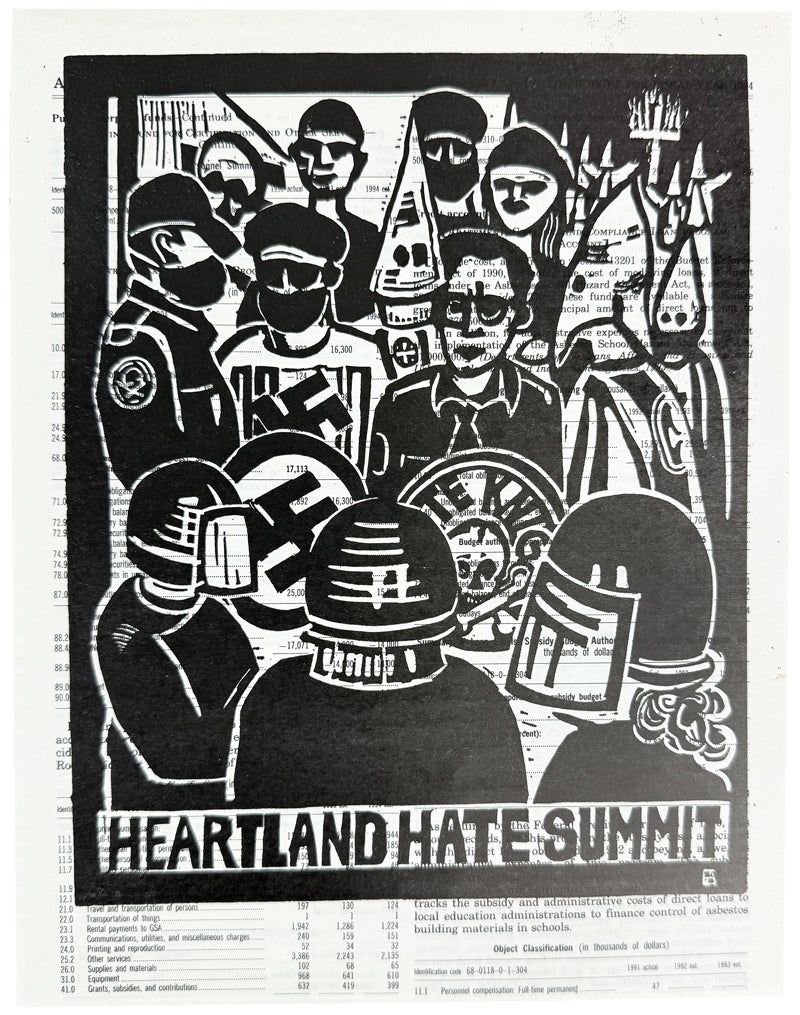 Laid in original print by Eric Avery titled "Heartland Hate Summit" executed on a recycled piece of paper from a report issued by the Environmental Protection Agency.