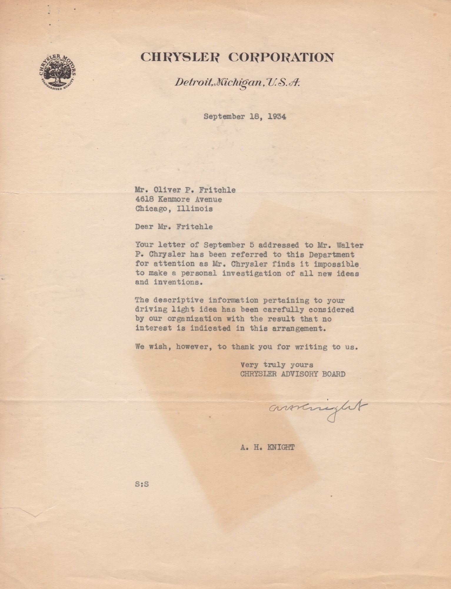 Fritchle would turn his attention to the problem of night driving and headlight glare. Included in the archive is a very large, 8 by 32 inch diagram of his novel headlight design, the explanation of which proposed that mounting the headlights on the top of the car was the “only solution to the Head-Light Glare Problem” (September 7, 1934). He pitches the design to C.D. Nash of Nash motors, writing: