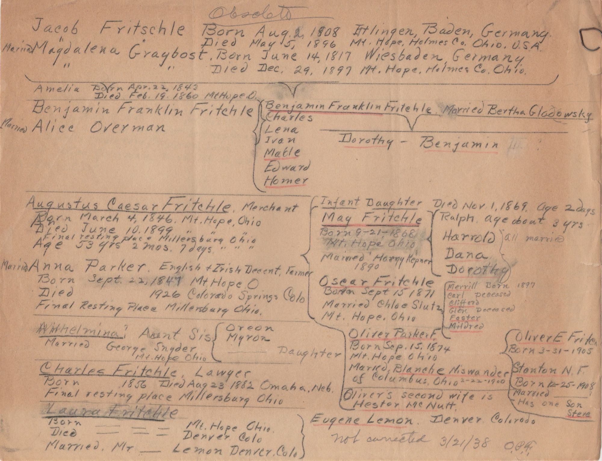 The remainder of the material in the archive concerns Fritchle’s family life. He attempts to reconstruct his family tree, to reach distant relatives in Germany, and find out why his family left the country—he asks the Institute of Germans Living Abroad whether there was “any Jewish blood in the Fritschle or Magdalena Graybost (my grandmother), family?” (January 24, 1939). There are also many photographs of his family, especially his two young songs Oliver E. and Stanton Fritchle with their mother, Blanche Neiswander (1879–1960) in what is probably Denver.