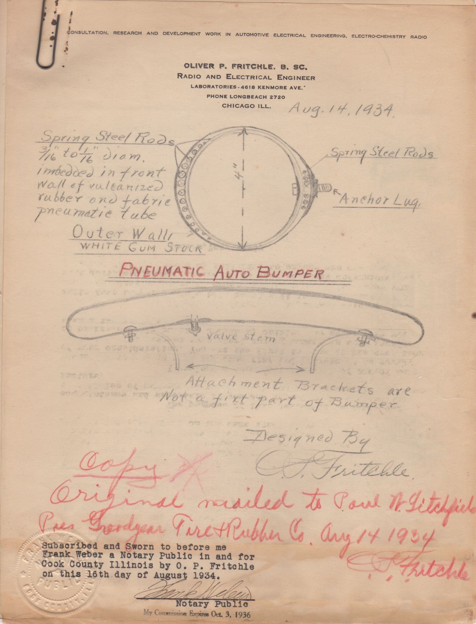 Fritchle would spend his first few years in Long Beach working on ideas for auto safety inventions. In 1934, he would start pitching his pneumatic bumper and roof-mounted headlights. The archive includes four diagrams of the bumper; Fritchle writes to Paul Litchfield at Goodyear that “If you are favorably impressed with my Pneumatic Auto Bumper I could help develop it in your factory”, because “I am now free to devote my full time to anyone who can use my services” (August 14, 1934) – he seems to have become unemployed at some point around this time, as his Relief Administration work assignment from 1935 suggests. Litchfield objects to the cost and attractiveness of pneumatic bumpers generally, writing that Goodyear has “considered many times but have not attempted to develop” them (August 21, 1934). Fritchle counters that he “can not accept your objections to my pneumatic bumper as sufficient reason to abandon the idea” (August 30, 1934), and Litchfield replies curtly that “we have given the matter careful investigation and consideration, and the decision has been made” not to follow up (September 6, 1934).
