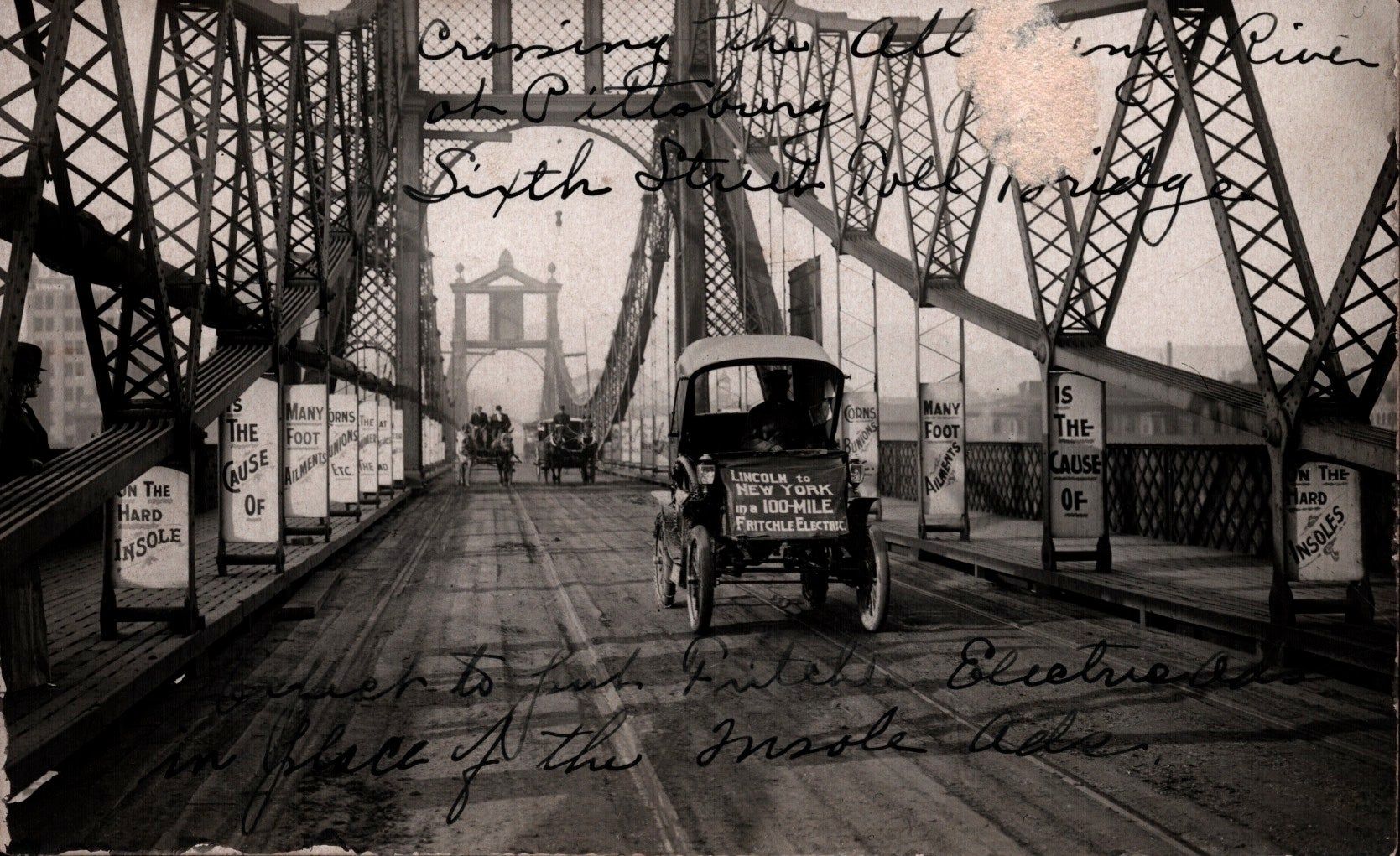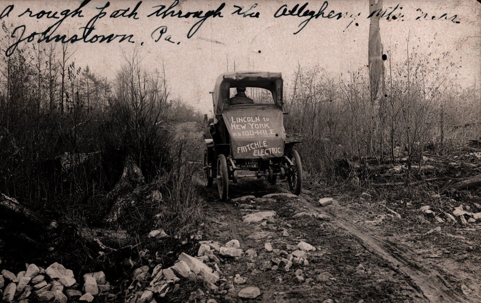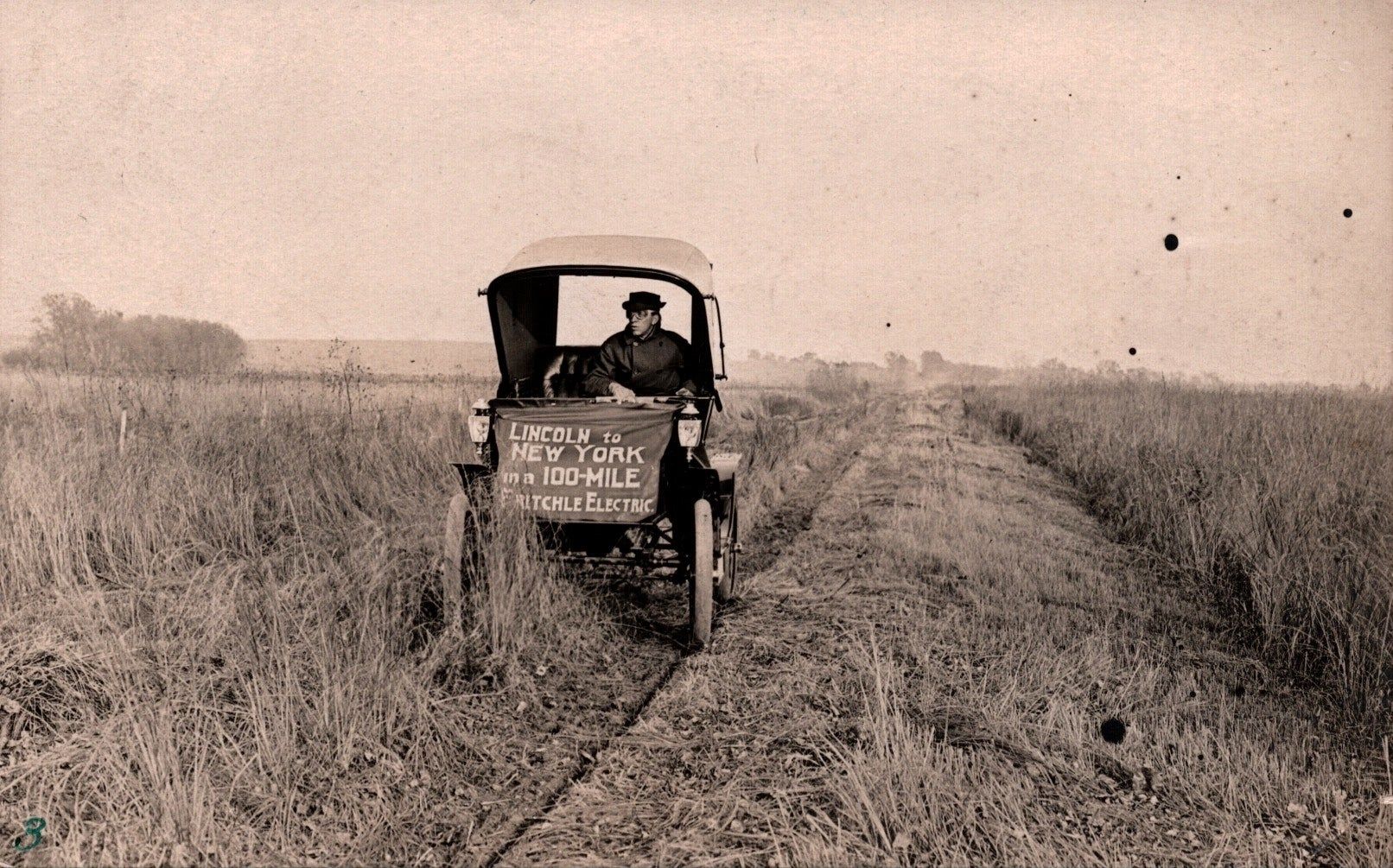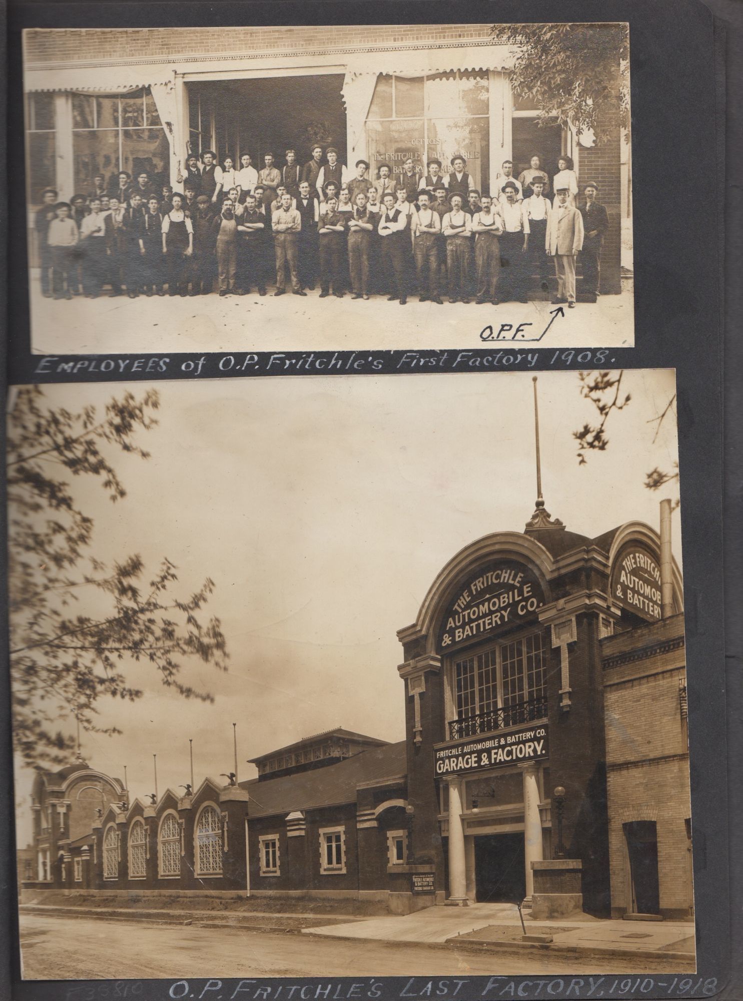 Most of the material relating to the Fritchle electric car is photographic or patent-related. He documented some of the Nebraska–New York endurance test with postcards to his son Oliver Eugene Fritchle. These show the car with its “Lincoln to New York” banner on the primitive roadways that existed at that time; one is captioned “In the Mud - In the Dark - In IOWA”. A number of photographs show various Fritchle electric models driving around Denver and climbing the rugged terrain outside the city. Two labeled photographs show the factories: employees in front of the first Fritchle automobile factory around 1908, and the exterior of the second and last factory, occupied between 1910 and 1918. There is also a shot of the company baseball team, with uniforms reading “100 MILE FRITCHLE ELECTRIC” across the chest. A catalog of the electric cars shows the various available models, with general specifications and prices—which neared $100,000 in today’s dollar—and there are patents for six components of the cars, including the safety brake and body design.
