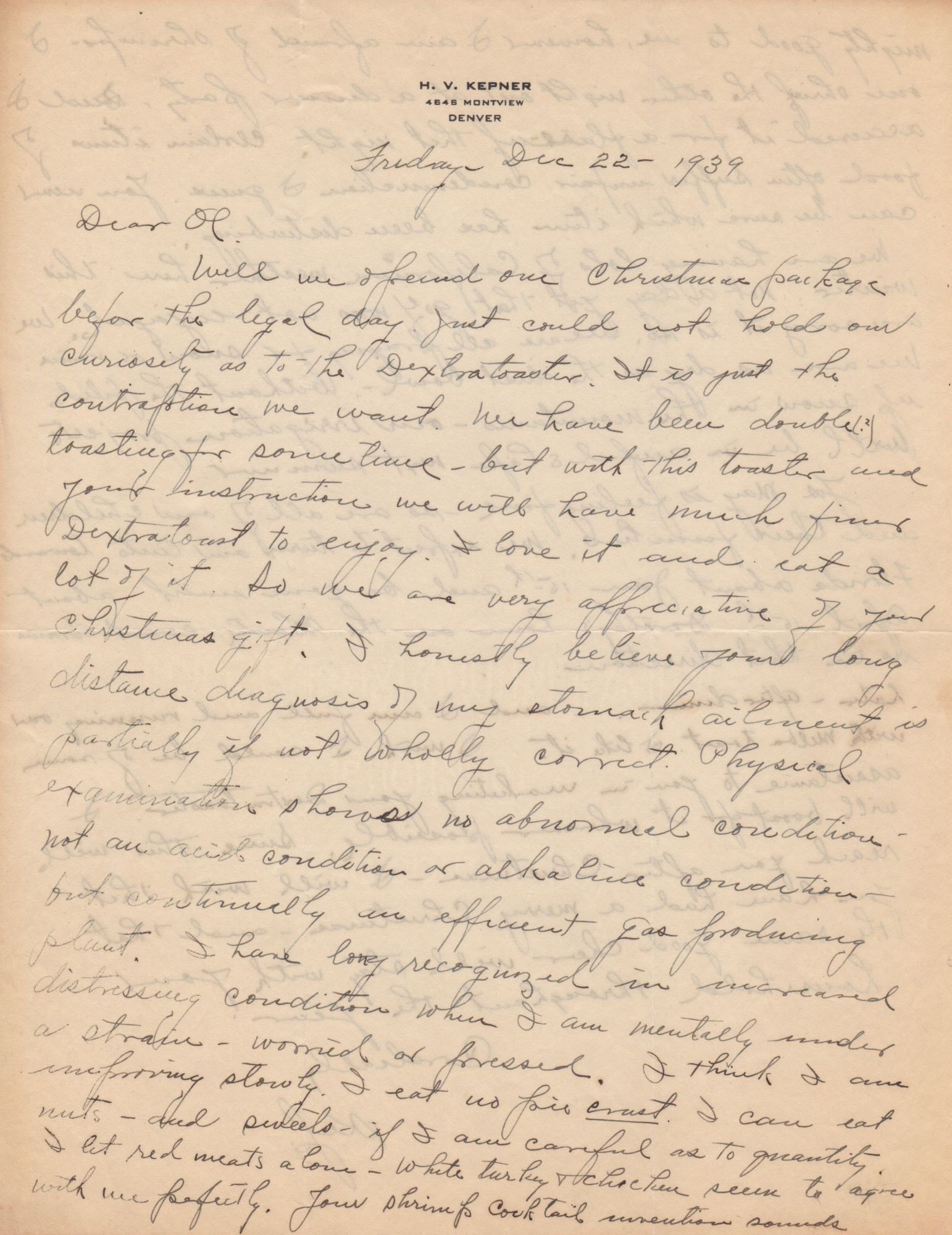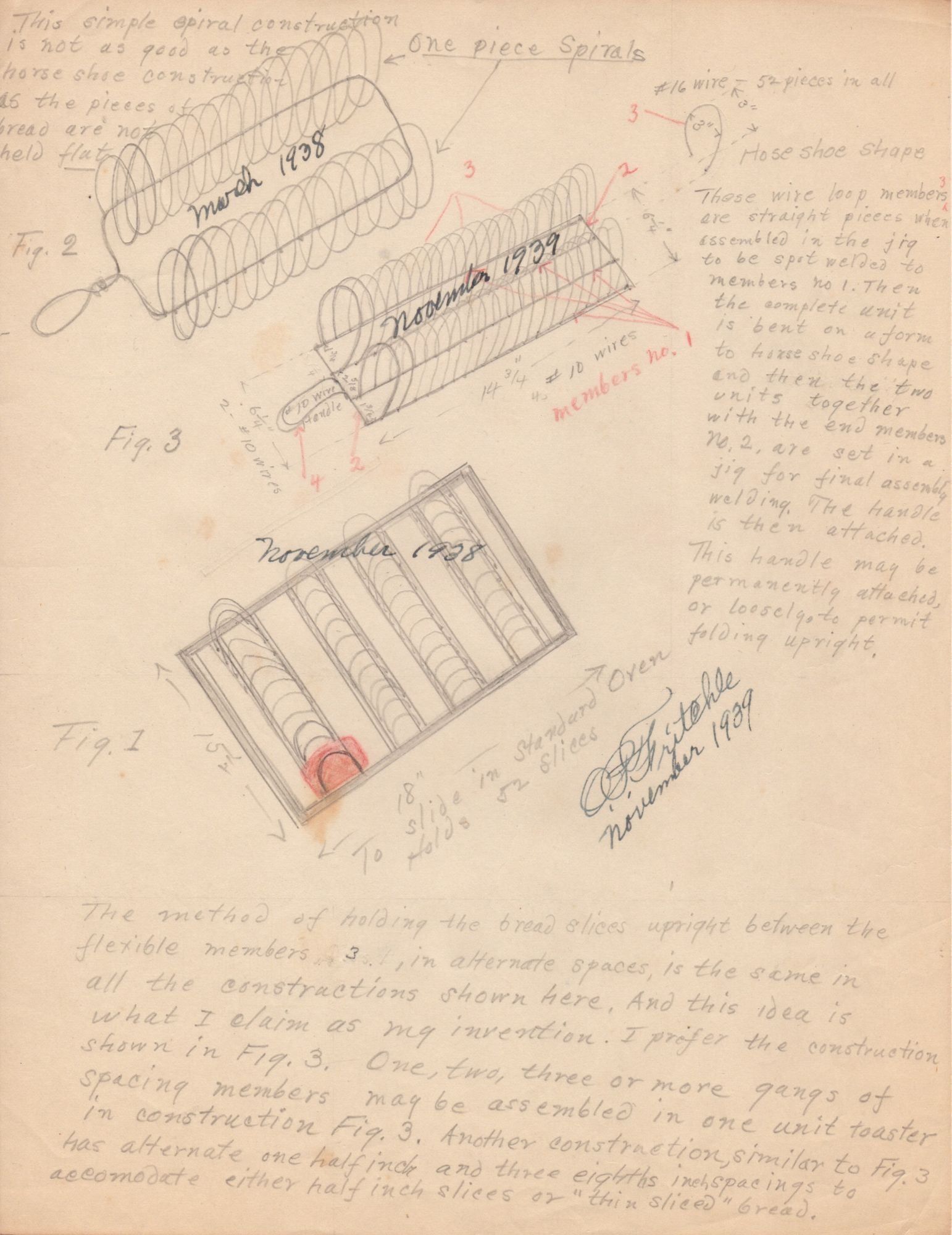He also pitches it to Chrysler, who write back that “no interest is indicated” (September 18, 1934). Never discouraged, Fritchle tries his hand at a few cooking inventions. One of these is a highly complicated device for cooking asparagus or “other things which require a higher heat on one part than the other” (No Date), of which there is a photograph and a hand-drawn diagram in the archive. The other is the “Dextratoaster”, which “makes it easy to make perfect DEXTRATOAST, commonly known as Melba Toast” (November 1939). The device consisted of a rack with a series of wire hoops, with which one was meant to toast an entire loaf of sliced bread, at a low heat, for several hours. Though he sent details of the device to a patent attorney in Washington, D.C., it is not clear that it ever was patented. However, at least his family liked the device; his brother-in-law described it as “just the contraption we want” (December 22, 1939).