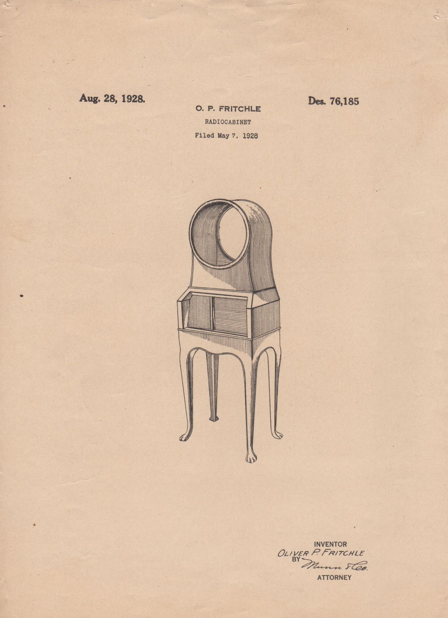 Following this, in 1923, Fritchle would move to Chicago to work in radio manufacturing. He worked at several radio companies before starting out on his own, designing, patenting, and pitching his Fritchle Radio and Radiocabinet. This archive contains a significant amount of material relating to these projects: photographs of the radio cabinet, copies of the patent, Fritchle’s notes about how to advertise it, and correspondence with various radio and cabinet manufacturing companies. In his personal notes, he claims that his radio reproduces “all the tones, from the highest note of the canary bird to the lowest note of the pipe organ [...] in their original quality and volume” (No Date). However, the letters he would send out focused on the cabinet’s visual aesthetics – he is sure that its curved shape, which set it apart from its boxy contemporaries, would make it the “ultimate masterpiece” in radio cabinet design, “just as certain as there was an ultimate masterpiece in the grand piano and violin, which has endured for centuries” (No Date). James Woods of the Showers Brothers Furniture Company—which manufactured cabinets for Crosley Radio—shows the most interest, and promises to meet with Fritchle in Chicago. He writes:
