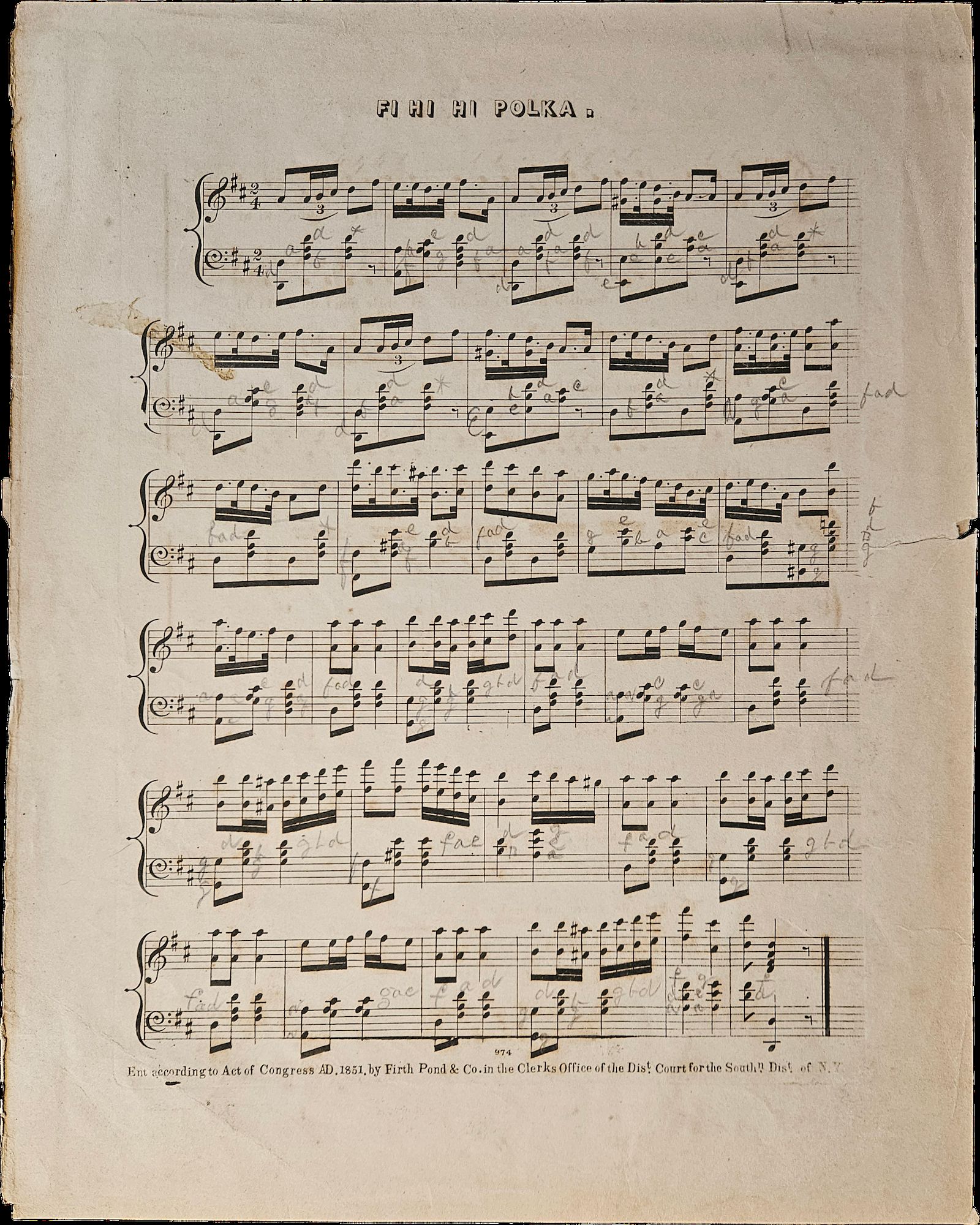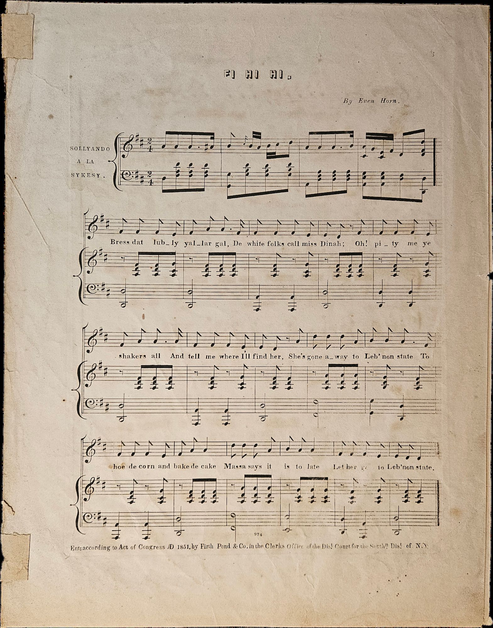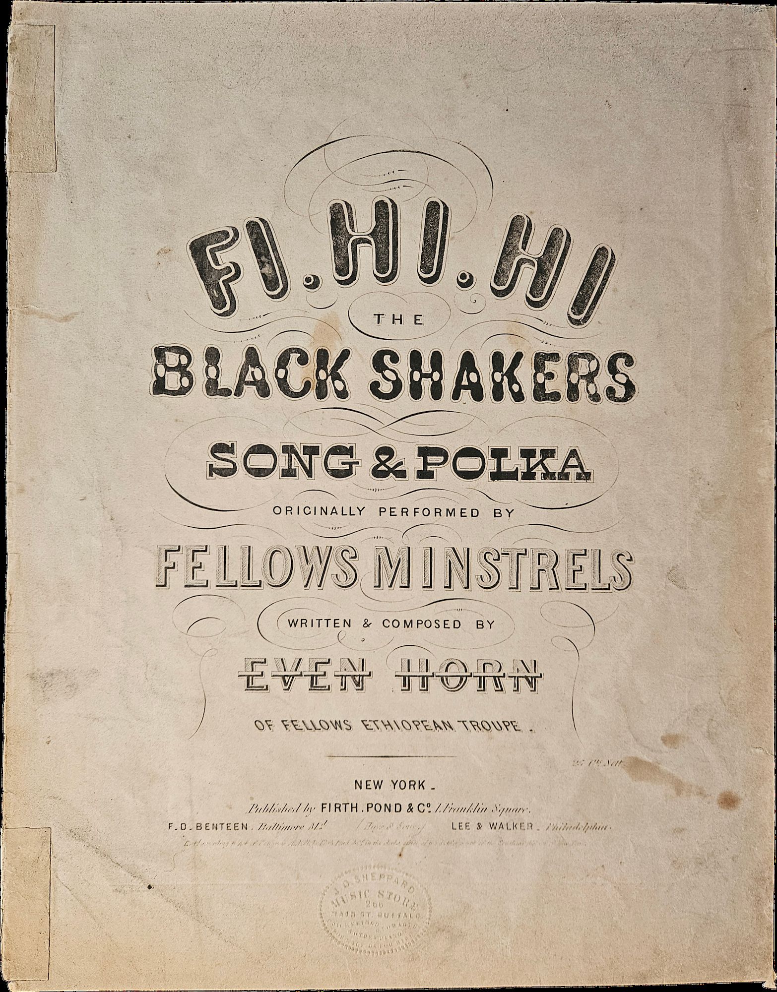 New York City, 1851. Sheet music measuring 10 x 13 inches, 3 pp. Pencil markings of chords over third page. Some staining and a few small tears; overall excellent.. Sheet music for “Fi-Hi-Hi” or “The Black Shakers Song & Polka”, a track written by Even Horn and originally performed by the Fellows Minstrels. The Fellows, who are also called on the cover “Fellows Ethiopean [sic] Troupe”, were a New York City-based minstrel group who briefly ran Fellow’s Opera House on Broadway just above Canal Street. The singer of this tune, whose girlfriend has “gone away to Leb’non state”—perhaps Mount Lebanon, New York, or Lebanon, Ohio—asks, “Oh! pity me ye shakers all/ And tell me where I’ll find her”.
