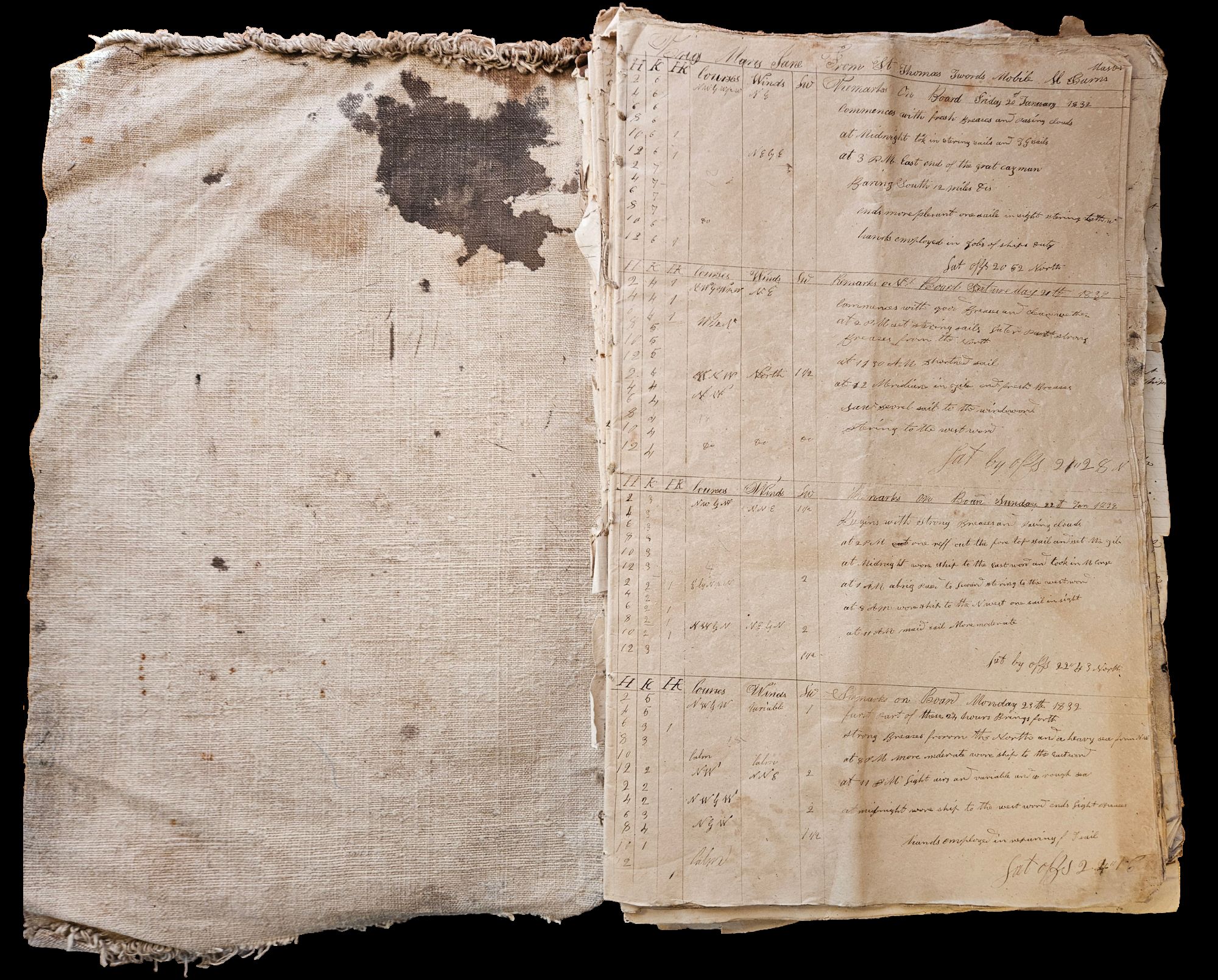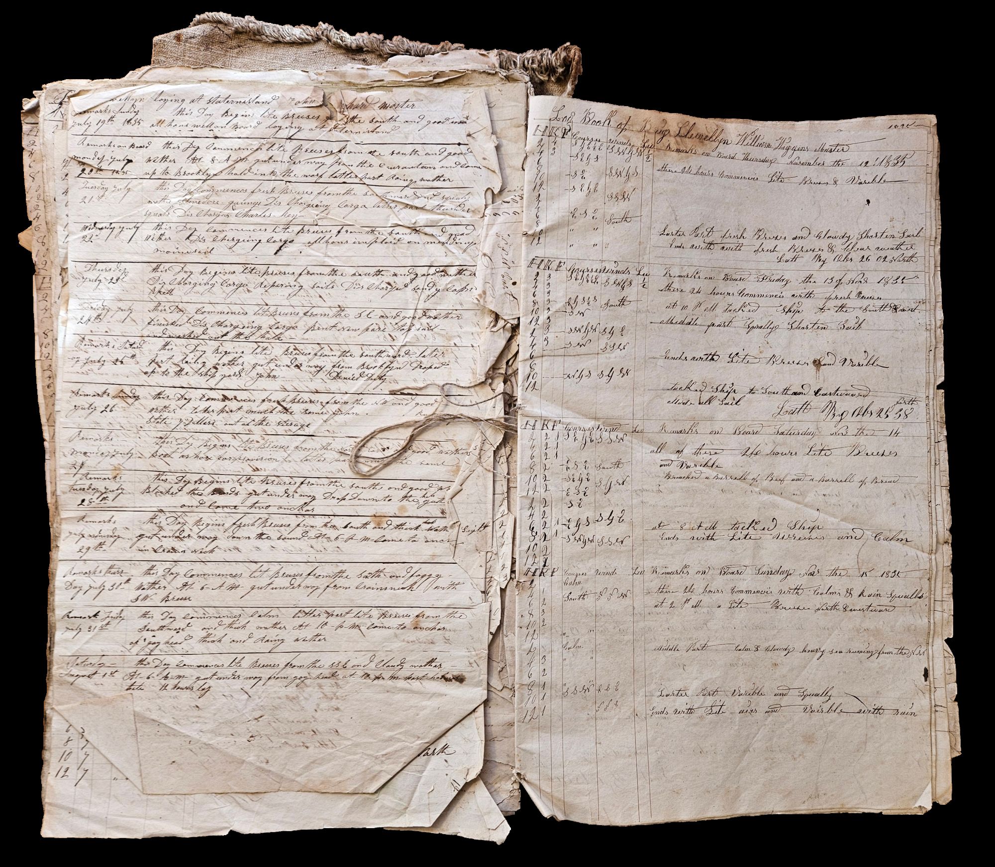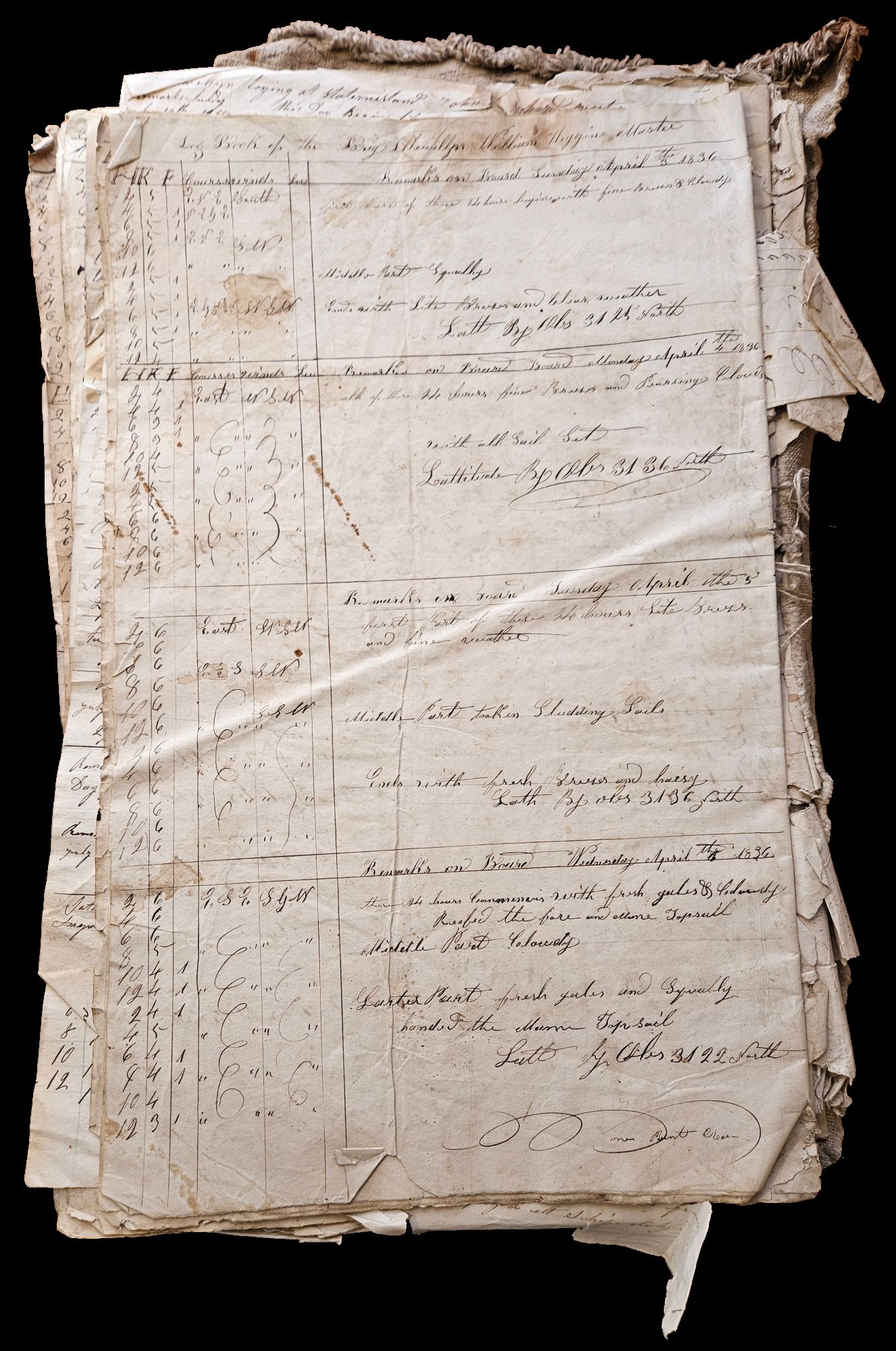 - Approximately twenty-nine pieces: logbook of eighty-four double-sided pages measuring 13 x 20 inches; eight letters, seventeen d