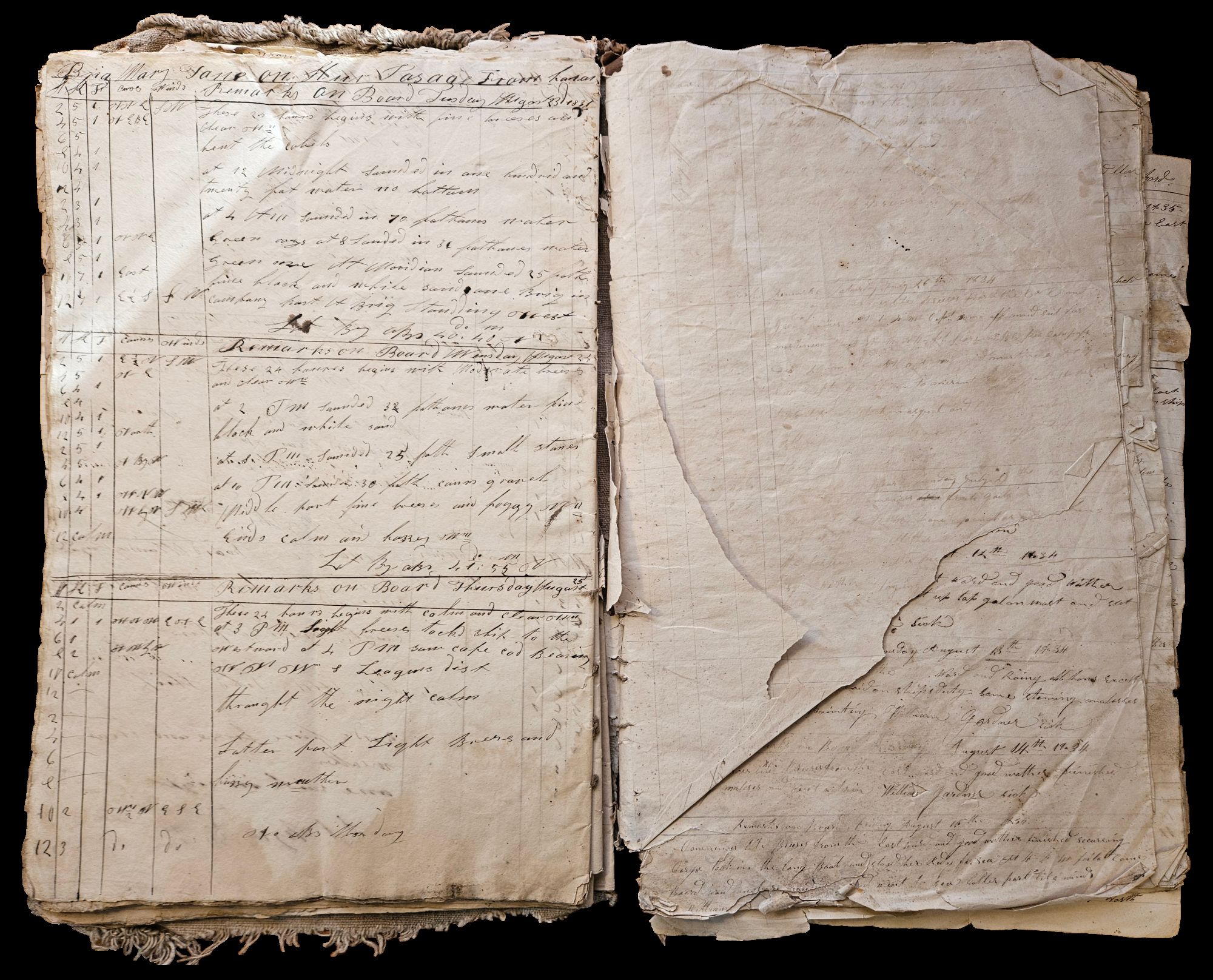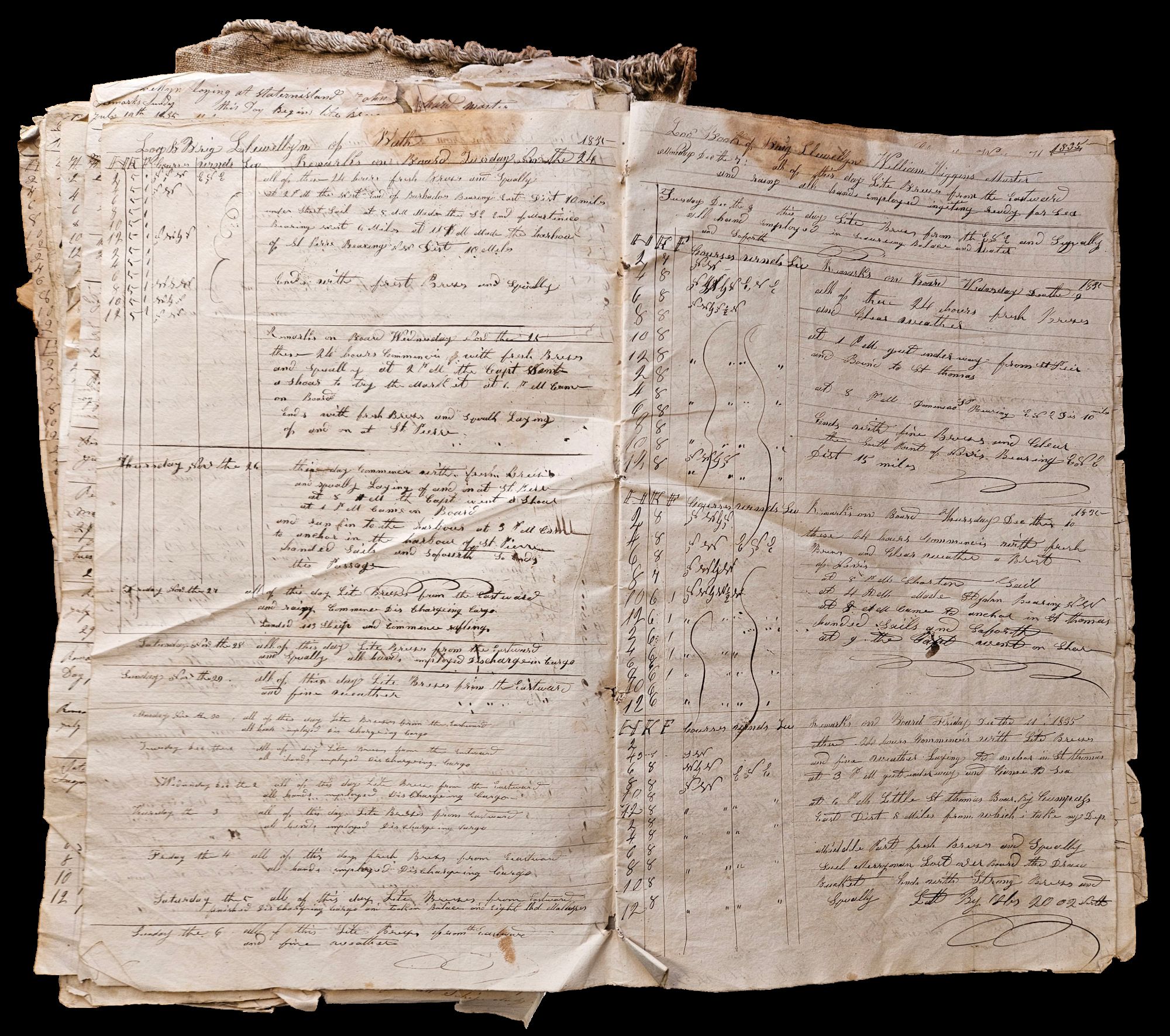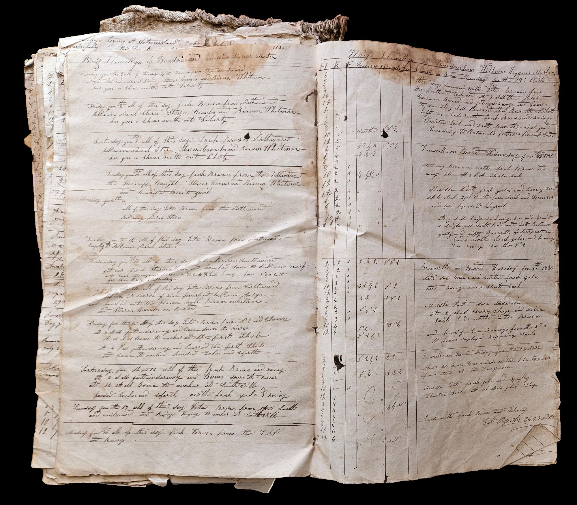 United States and Caribbean, 1898. Approximately twenty-nine pieces: logbook of eighty-four double-sided pages measuring 13 x 20 inches; eight letters, seventeen documents and forms, and three pieces of miscellany. Much wear and significant damage to logbook, including water damage, mildew, and tearing; log book overall fair to good minus. Other materials good to very good. Overall good.. William Higgins (1791–1872) was a farmer, sea captain, and owner of and investor in ships, from Bowdoinham Maine. According to the Maine Maritime Museum, which holds his family papers, Higgins’ ships traded mainly in lumber, which they took from Wilmington, North Carolina to the Caribbean.