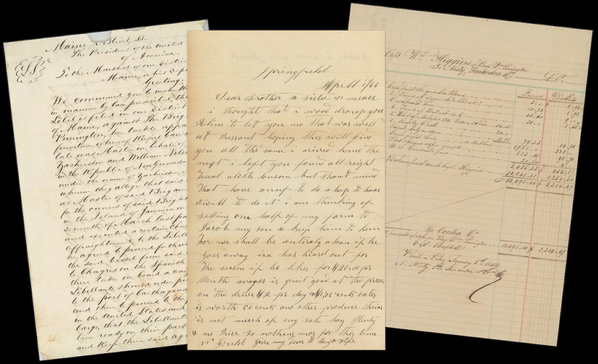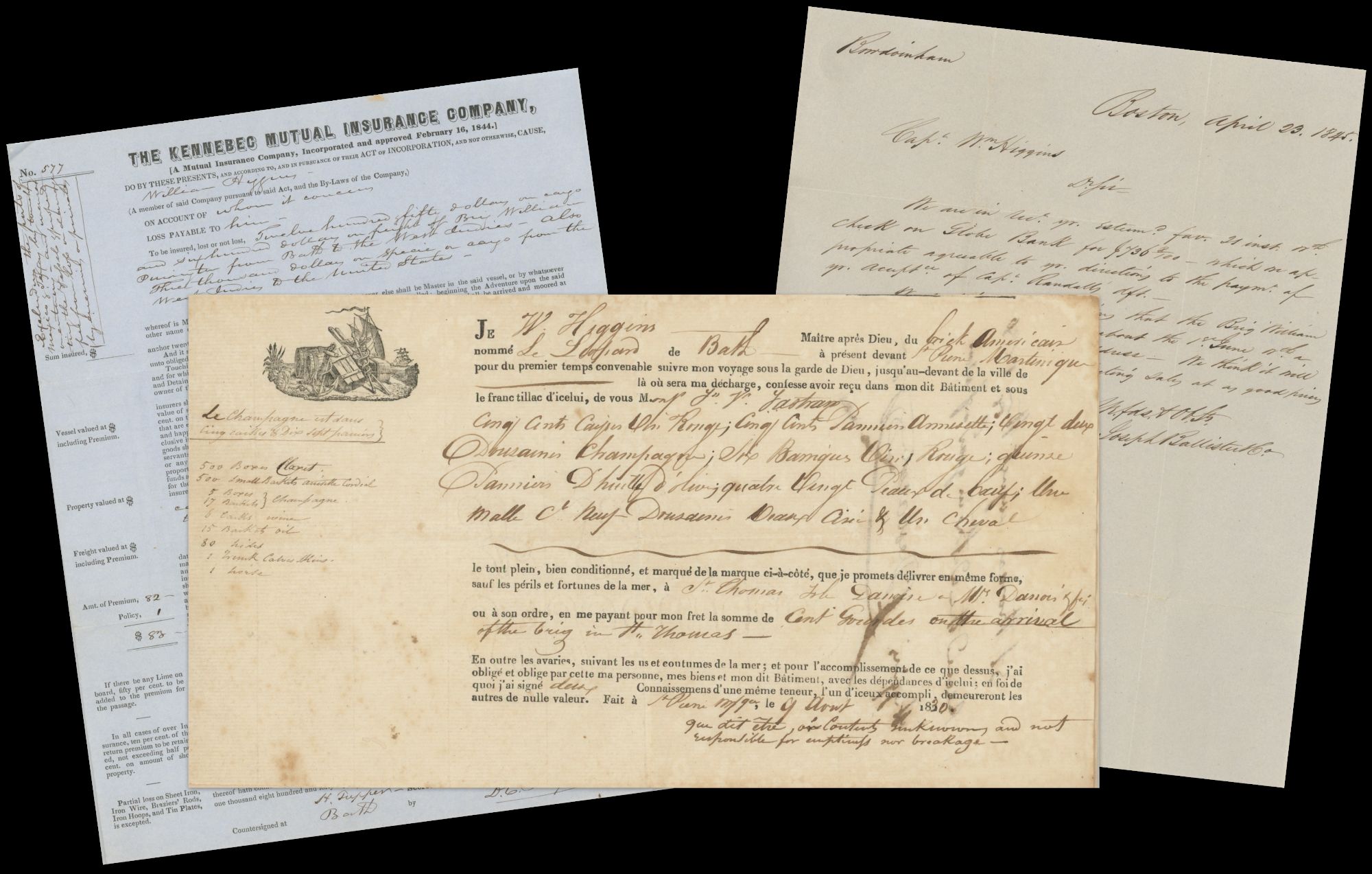The letters and documents date from 1830 to 1867 and are also mostly business-related, including an insurance document for the brig William Parrington, a roll of sailors enlisted to work on a six-month journey between the Caribbean and the US in 1845, a bill of sale for ¼ stake in the brig Mary Jane, and receipts and logs for items including various liquors, sugar, molasses, casks, and so on. One letter from a young man in Wilmington requests advice on how to start his own business in the style of Higgins’; other letters concern family matters. One interesting undated document is a writ addressed to the Marshal of the District of Maine concerning a lawsuit filed against Higgins and Rufus Carr, master of the William Parrington, by Zachrisson, Nelson, + Co. The suit alleged that Carr, acting as an agent for the ship’s owners (that is, Higgins), had agreed to an affreightment involving shipping from Jamaica to Spain to New York, but had then “wholly neglected and refused to do so”.