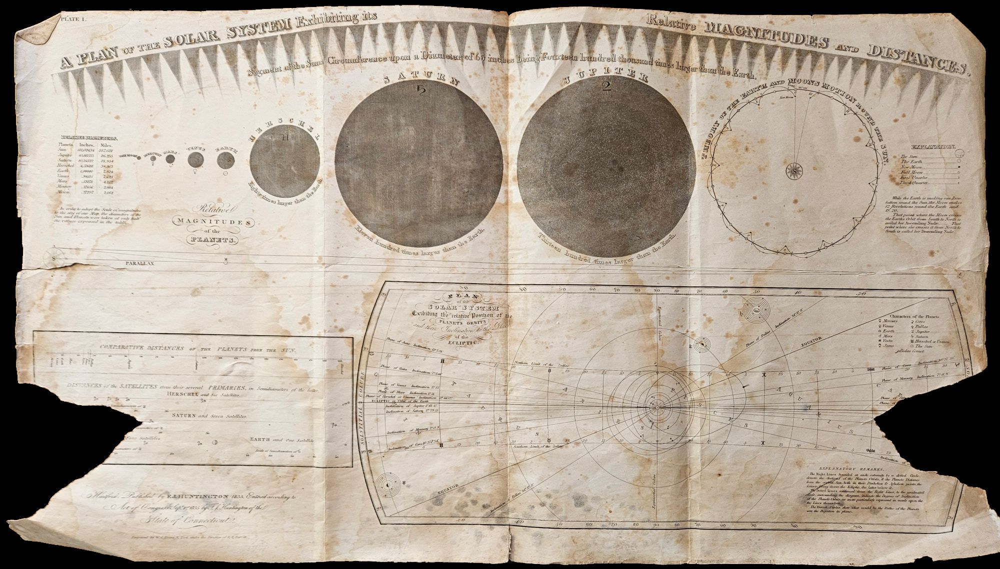 Offered here is a logbook recording the travels of several of Higgins’ ships, particularly the brigs Mary Jane and Llewellyn, alongside related documents and personal letters. The logbook, dating between 1832 and 1836, extensively documents the course, wind data, and weather remarks for travels of the ships between east coast US port cities and various locations in the Caribbean including Barbados, St. Thomas, and Martinique. The logbook also contains a copy of astronomer and mathematician Elijah Burritt’s illustration “A Plan of the Solar System Exhibiting its Relative Magnitudes and Distances,” engraved by W. G Evans and printed in 1835 by F.J. Huntington.