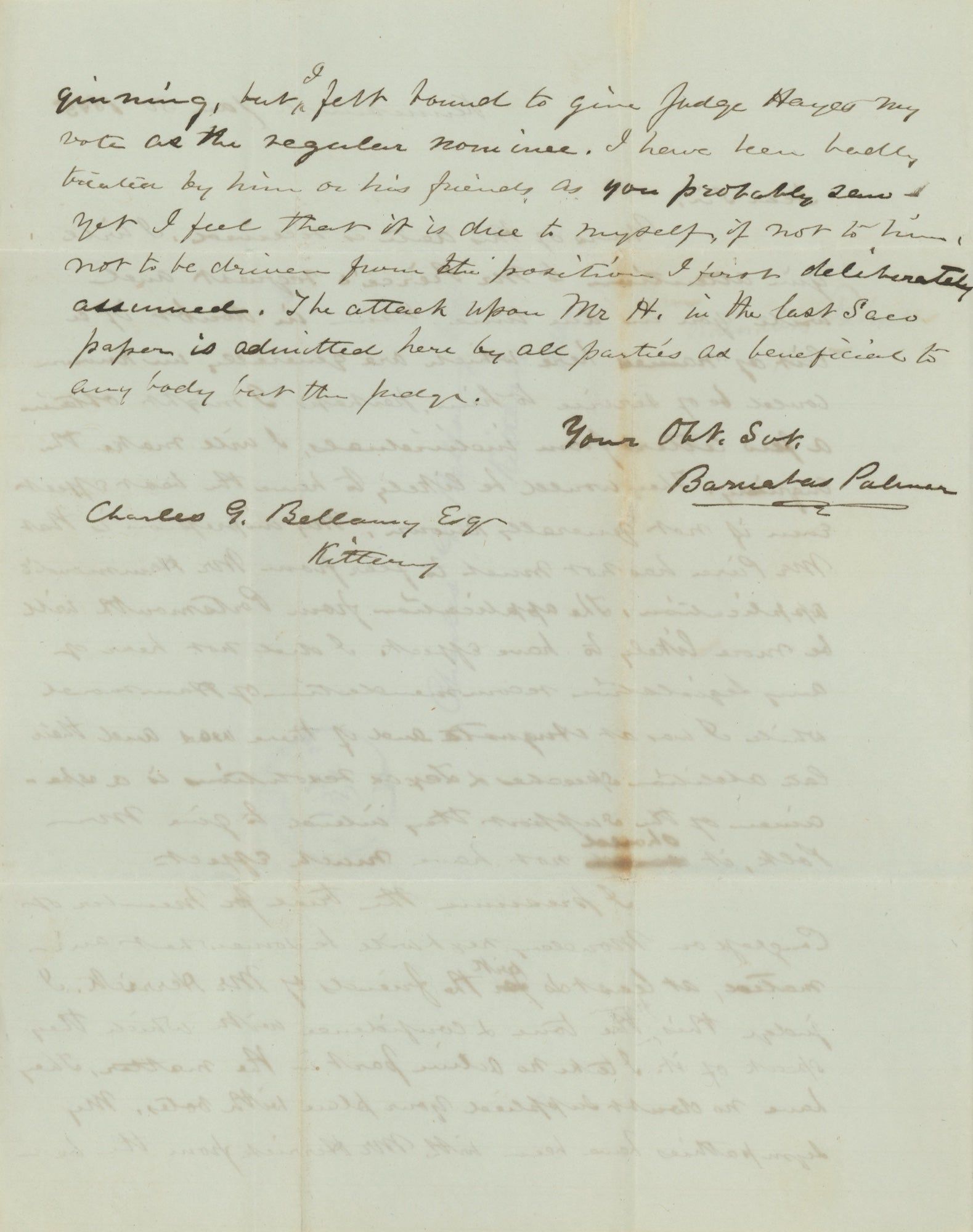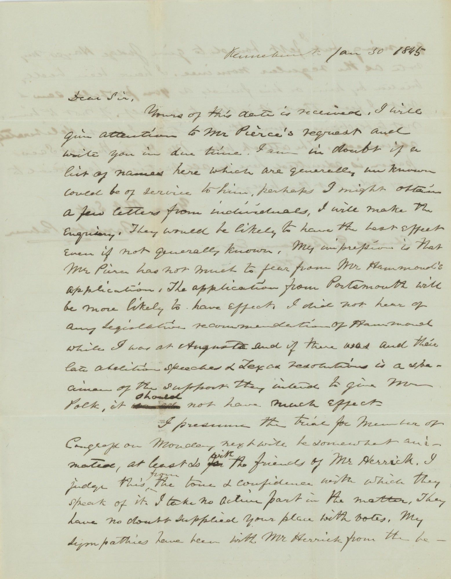 The US under President Polk had not yet annexed Texas, and Palmer is apparently underwhelmed by Maine’s support for the cause. He also remarks on Joshua Herrick’s (1793–1874) bid for re-nomination to Congress; though he feels that he had “been badly treated” by Herrick’s competition, “Judge Hayes”, Palmer nonetheless feels compelled to vote for Hayes over Herrick. Of interests to historians of Maine state politics.