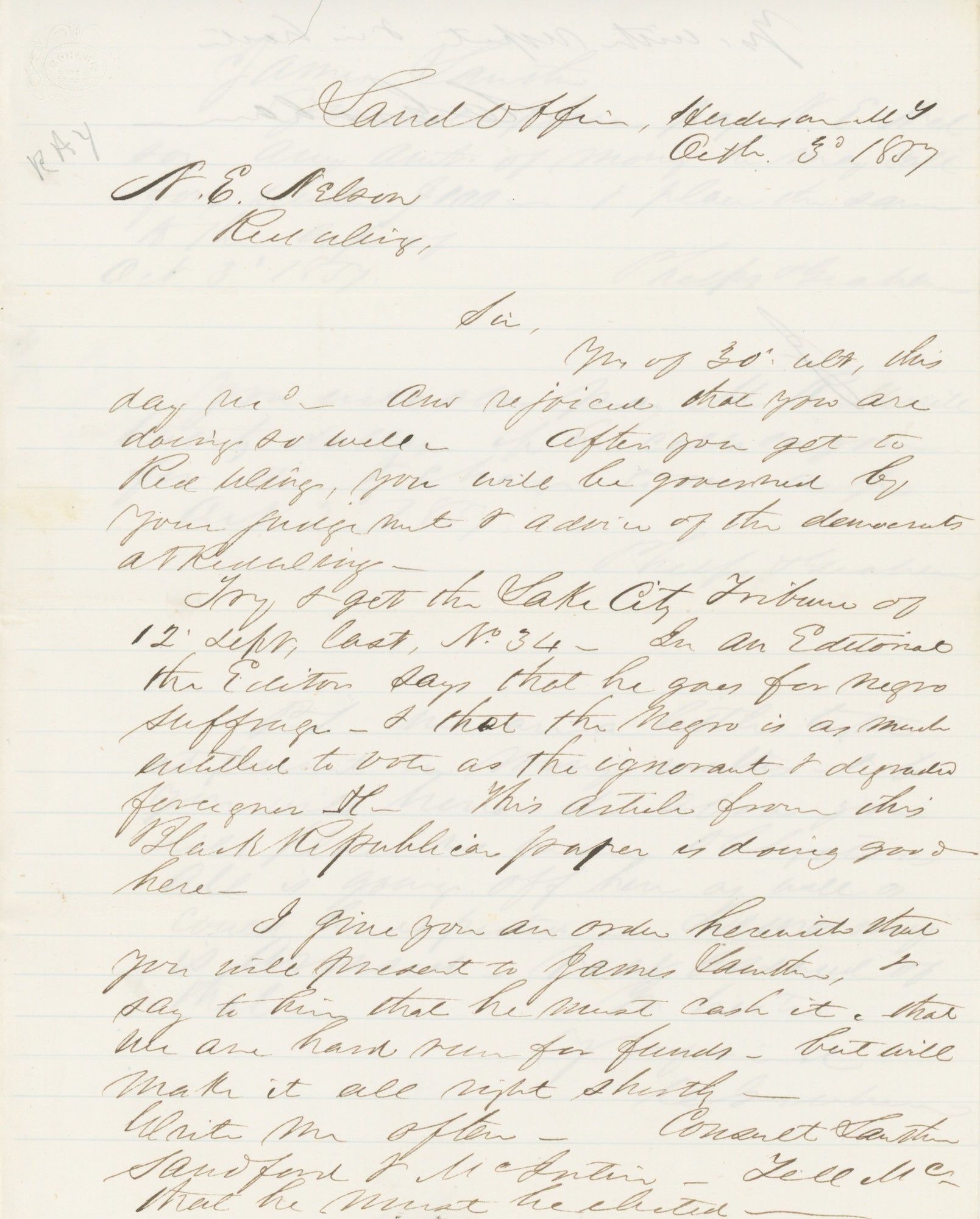 “After you get to Red Wing, you will be governed by your judgment & advice of the democrats at Red wing – Try & get the Lake City Tribune of 12 Sept. last, No. 34. In an Editorial the Editor says that he goes for negro suffrage & that the Negro is as much entitled to vote as the ignorant & degraded foreigner &c.”