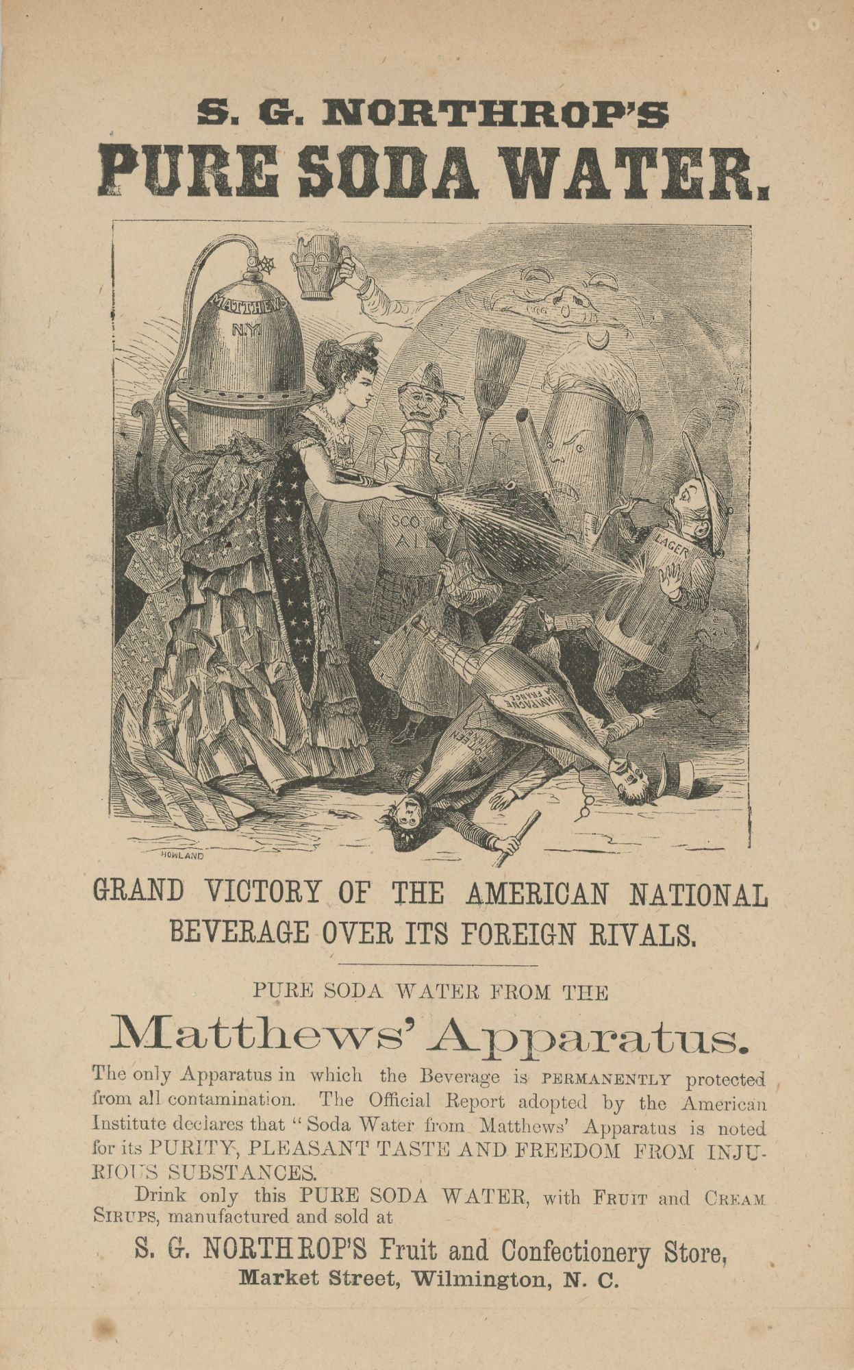 Wilmington, North Carolina, likely mid-19th century. Single 6 x 9 ½ inch sheet. Folded and toned with some stains; excellent.. Advertisement for soda water from S.G. Northrop’s Fruit and Confectionery Store in Wilmington, North Carolina. Northrop’s used “Matthews’ Apparatus,” a mechanism for carbonating water invented by the “Soda Fountain King” John Matthews. The advertisement features an amusing lithograph of a woman in an American flag-themed dress spraying avatars of various alcoholic drinks with a hose of Matthews’ soda water. The lithograph is signed “Howland”.