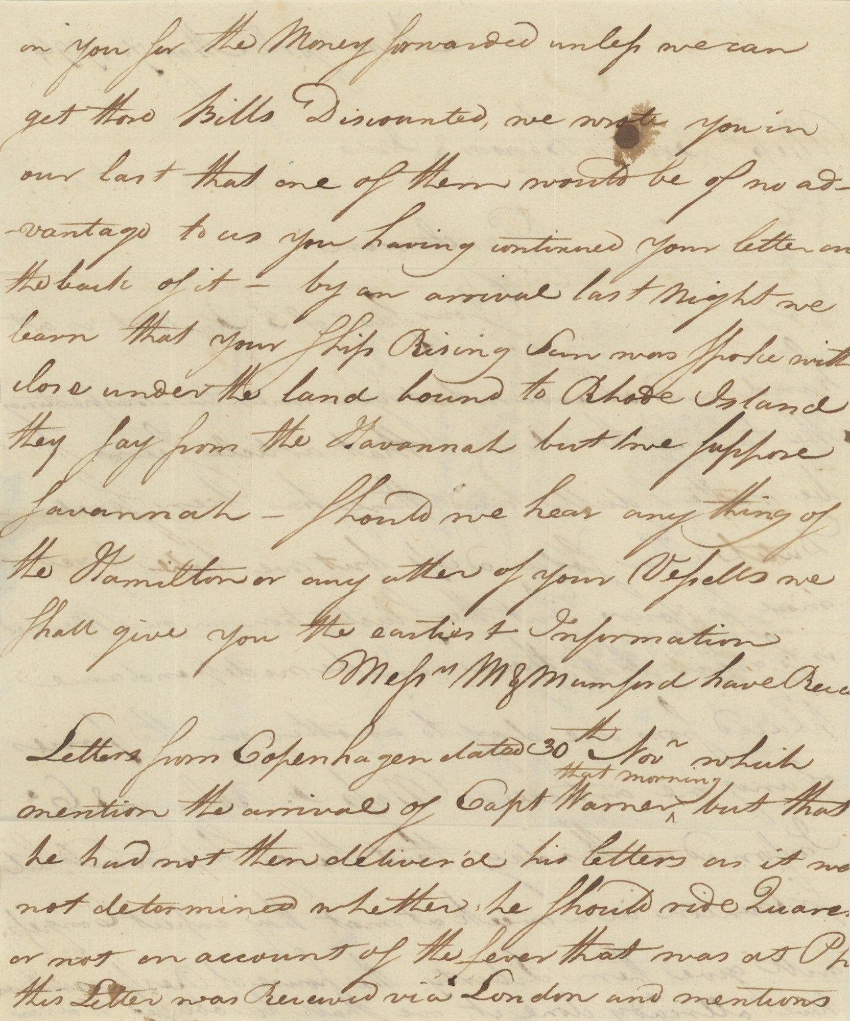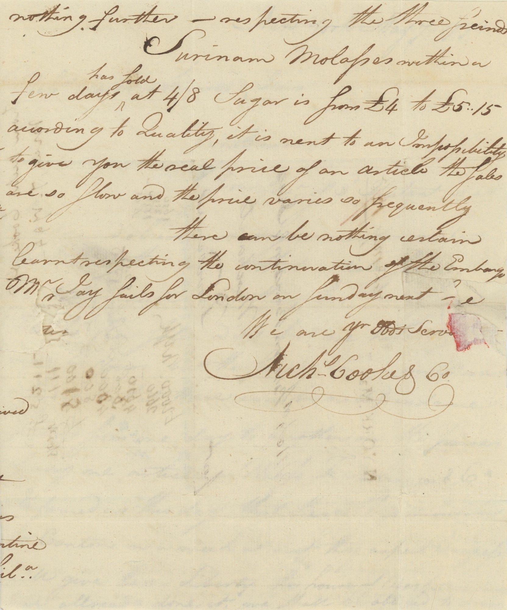 This company, writing in May, discusses the “dull” taste of recent tea imports and a captain quarantining due to fever, and relays some information about Brown, Benson, & Ives’ ships as well as those of some other companies. In particular, they write that “F. Robinson & Co. informed us this day that their ship would sail for Canton in a week at most, they expect Congress will give them liberty, the House of Representatives have already done it”. This ship likely required Congressional approval because of the embargo, passed in March of that year, on ships going from the US to any foreign port.[2] This embargo was passed in response to British ships capturing American ones in the West Indies to interrupt trade with France, as the two were then engaged in the French Revolutionary Wars. Cooke & Co. inform the firm that “there can be nothing certain learnt respecting the continuation of the embargo. Mr. Jay sails for London on Sunday next.” They are probably referring to John Jay, who in 1794 negotiated a treaty between the US and Britain that relieved some of the post-war tension between the countries.