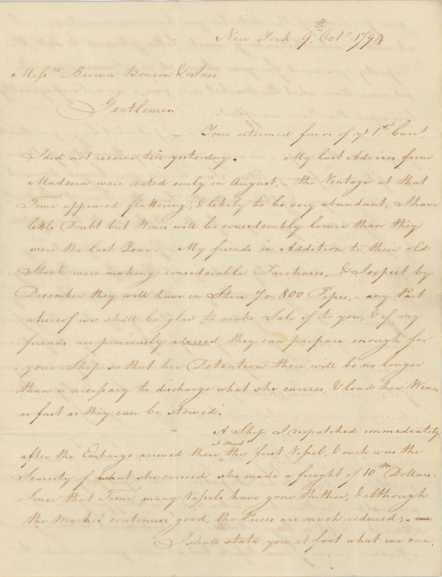 Two Letters to Brown, Benson, & Ives Concerning Madeira Imports, Other Goods, and the 1794 Embargo