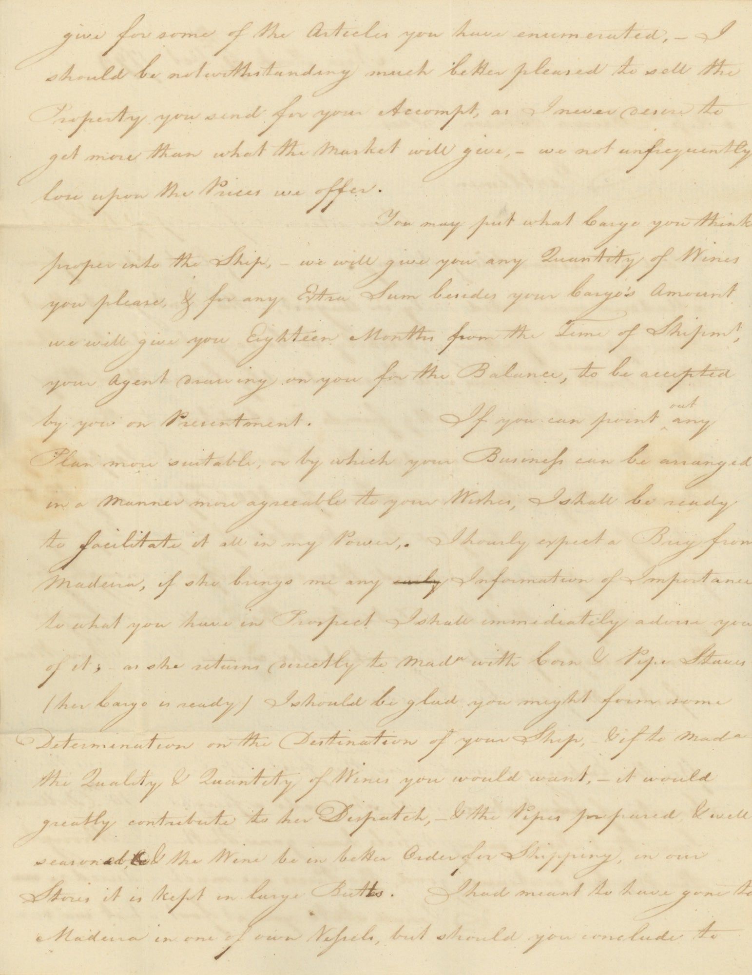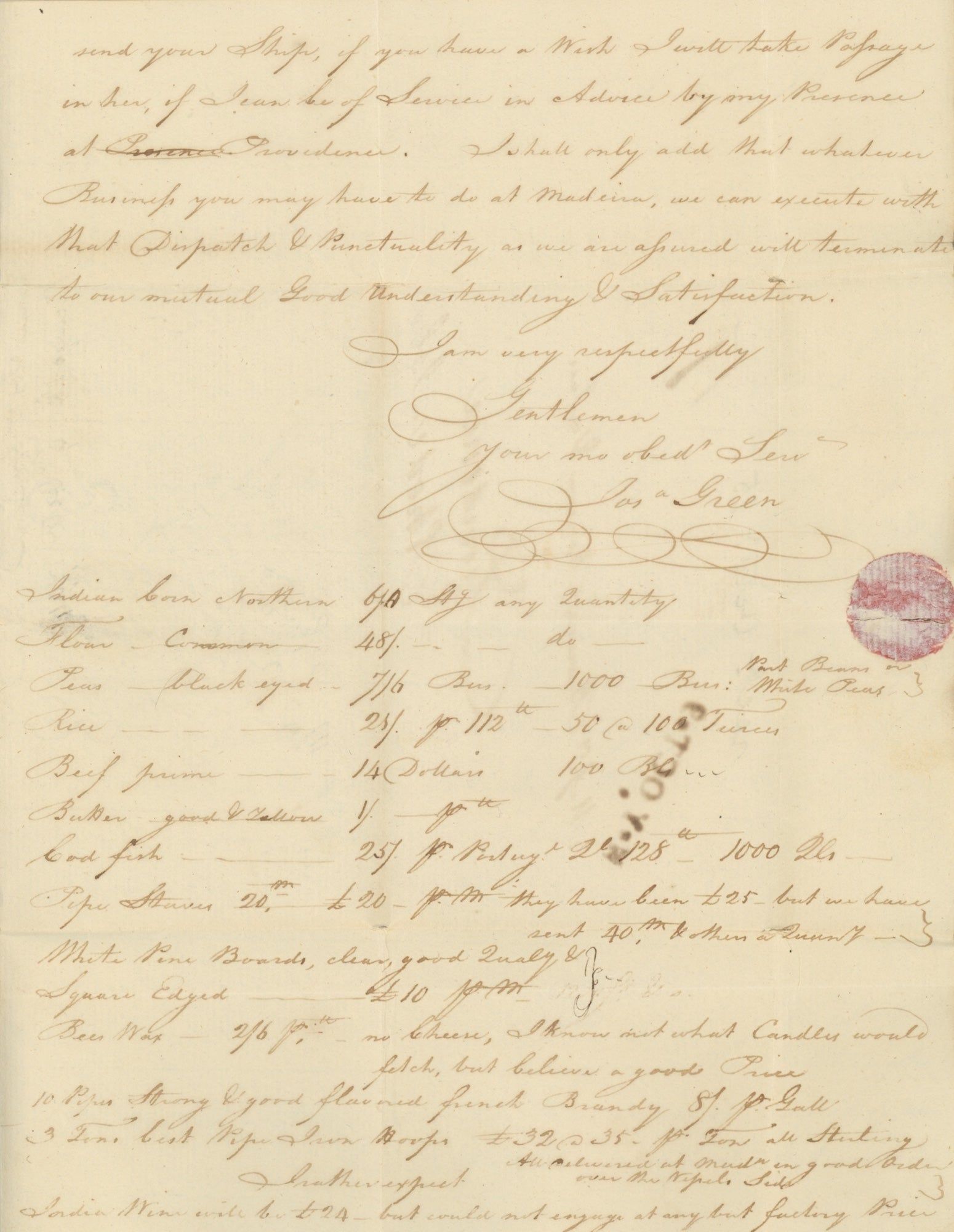 The later letter comes from Joseph Green (who notes having dispatched a ship “immediately after the Embargo”). Besides providing the prices his company would pay for various articles Brown and company had inquired about, Green’s main concern is madeira, a type of wine produced on the eponymous Portuguese island colony. Green describes that year’s vintage as “flattering, and likely to be very abundant”, and anticipates that prices “will be considerably lower than they were the last year”, although “the market continues good”. Madeira was extremely popular in Colonial America; it was famously involved in the 1768 Liberty affair, in which John Hancock was accused of smuggling the wine on his ship Liberty to avoid import taxes, and which led fairly directly to the Boston Massacre. Following the Revolutionary War, Congress had, ironically, passed a series of higher and higher import taxes on items including madeira wine.