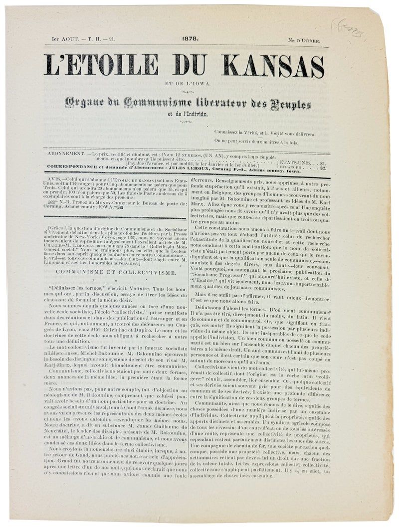 L'Etoile du Kansas. Organe de la Republique française et universelle [Later title: L'Etoile du Kansas et de l'Iowa: Organe du Communisme libérateur des Peuples et de l'Individu] [Broken run of four issues]