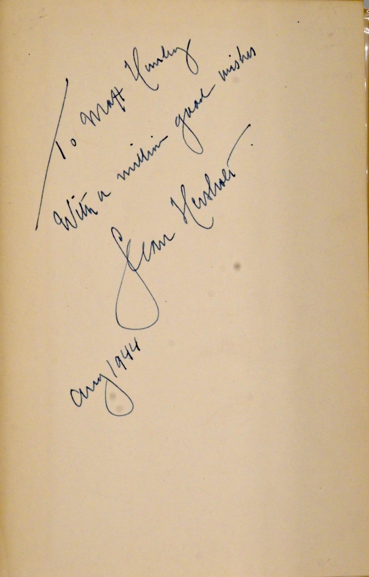 New York: Random House, 1944. First Edition; First Printing. Hard Cover. Very Good binding/near Very Good dust jacket. Signed. 8vo; in the publisher’s blue cloth binding; 243 pages; in an unclipped jacket; some wear and toning to the boards but the binding is sound; the dust jacket is a bit shelfworn at the extremities with some chipping including a bit of loss to the front panel near the hinge; dust jacket is now protected in a mylar cover.~~Signed and inscribed by Hersholt on the front free endpaper. Very Good binding / near Very Good dust jacket.