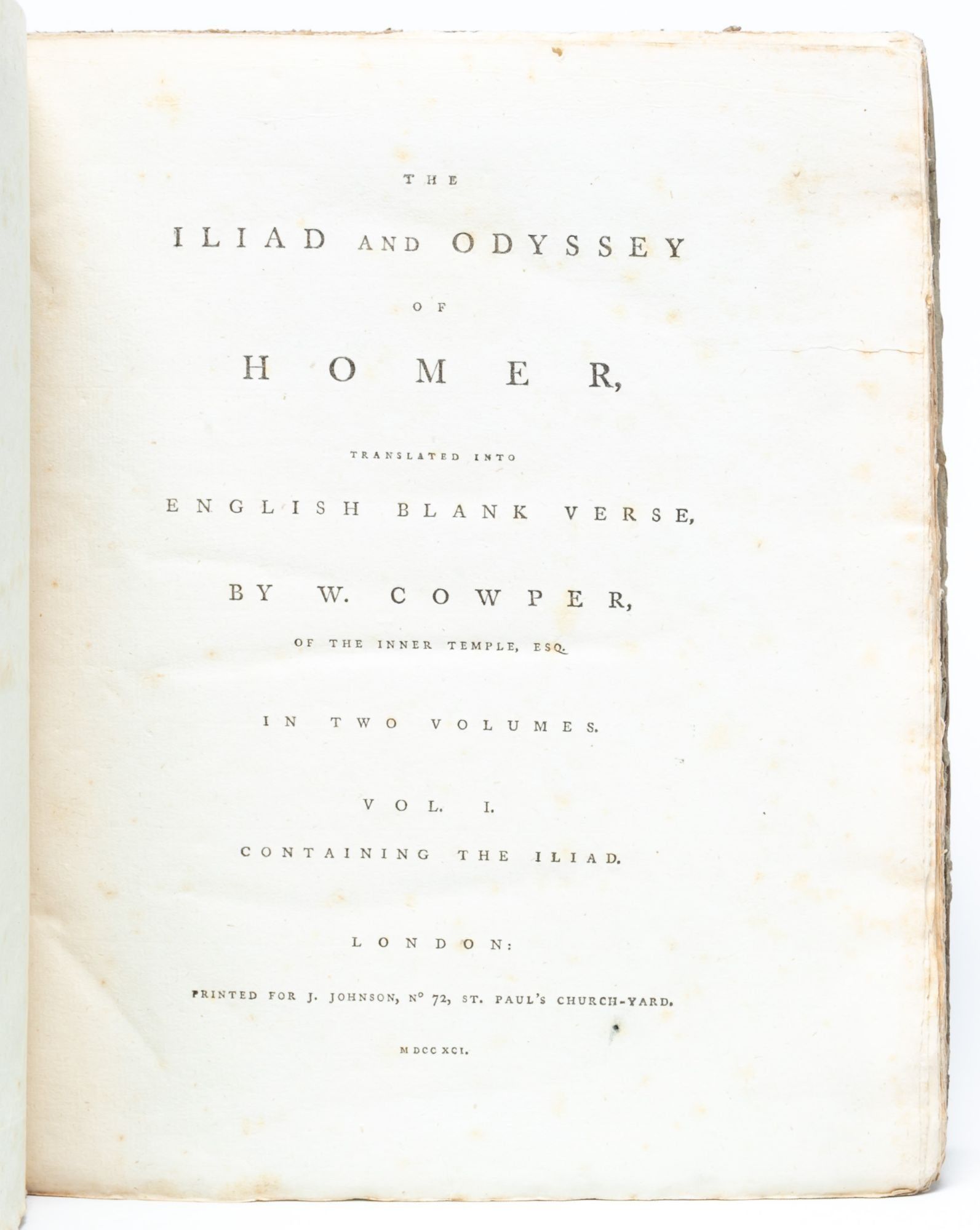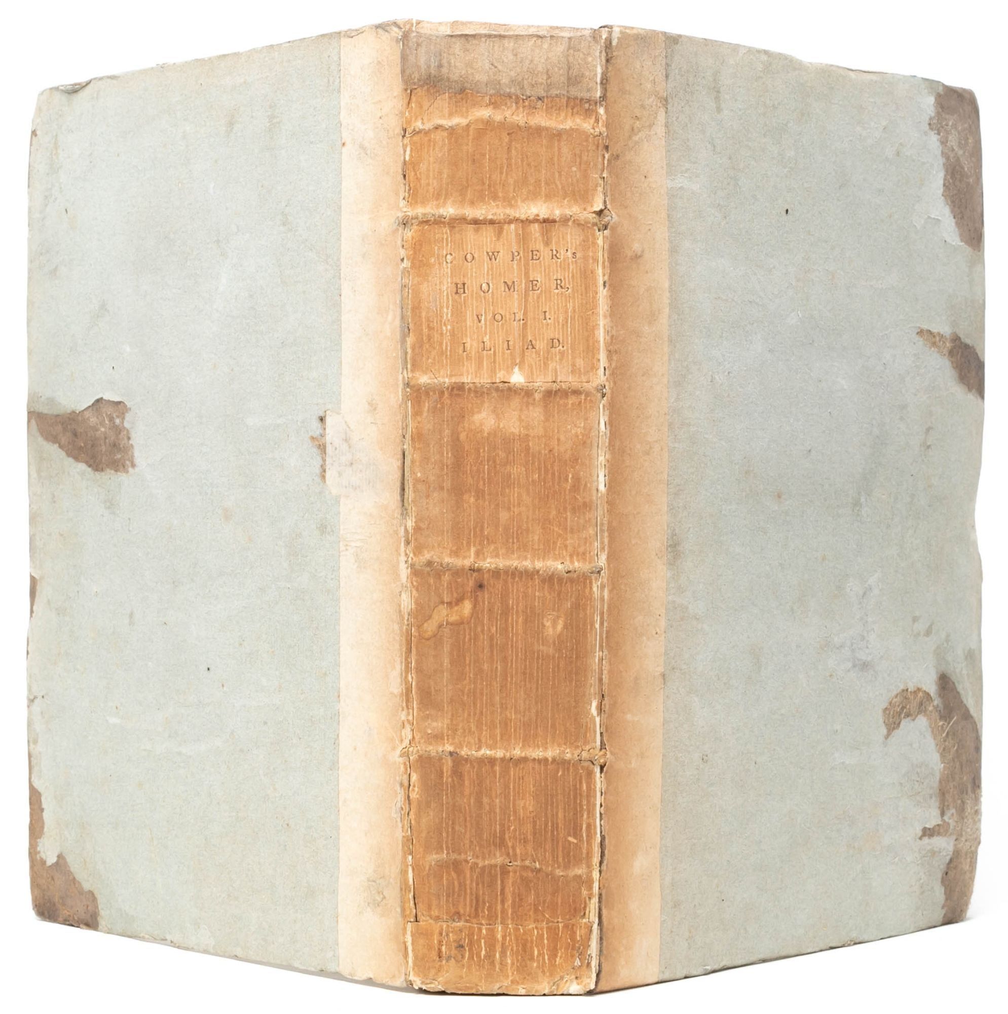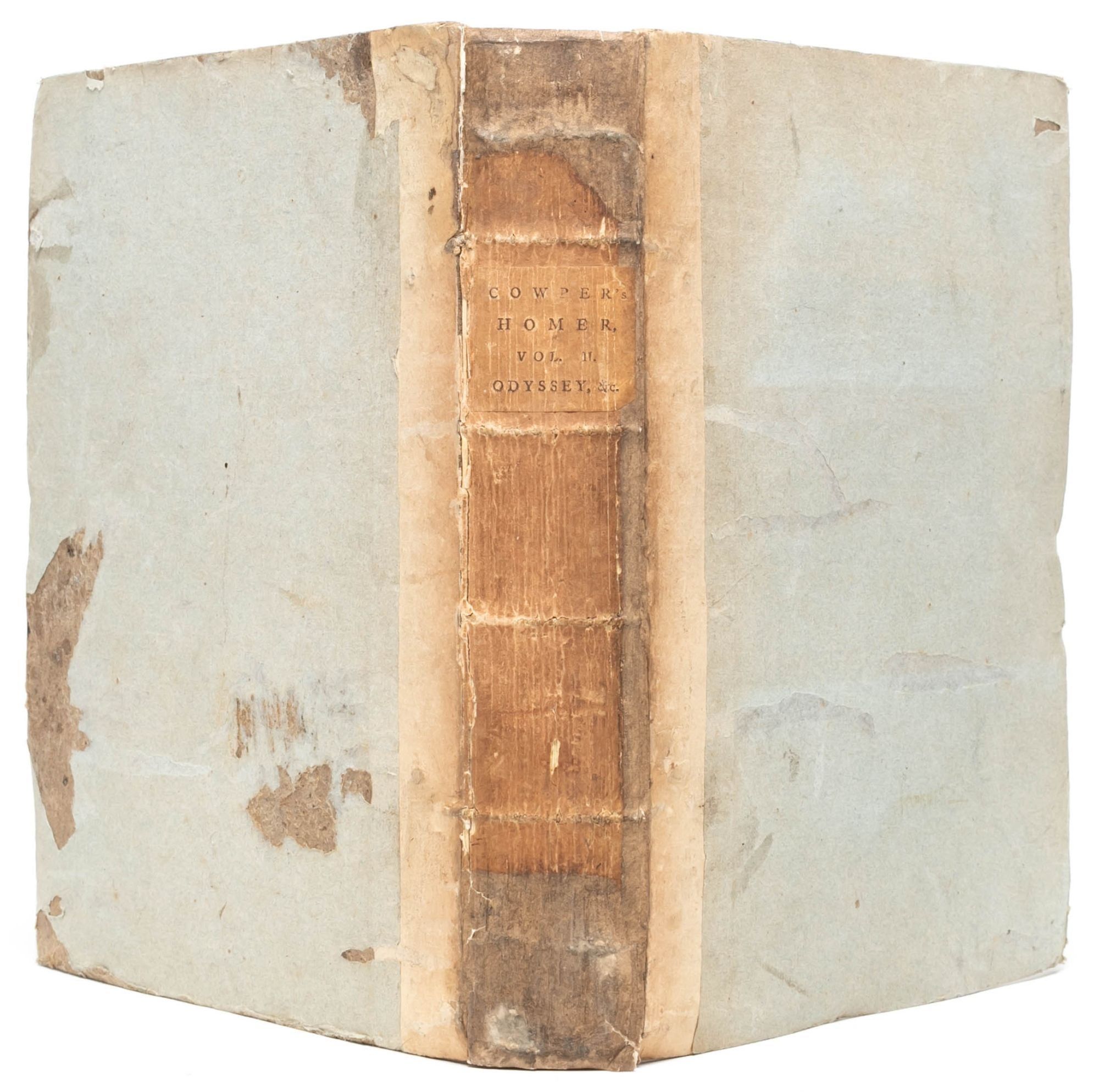 William Cowper's translation is considered a "conscientiously literal" rendering of the text, adopting a "Miltonian" blank verse in an attempt to capture the plain, direct tone of the Greek (Arnold, On Translating Homer).Though the translation was criticized by some as lacking the flow and ease of the original text, and for relying too much on reference to Milton, it was also regarded as "a lofty achievement in scholarship and poetry" that appropriately preserved the Homeric "nobility" and is generally preferred over Alexander Pope's 1715 translation (The Cambridge History of English Literature). Overall, Cowper presented an appealing translation that is here preserved in its rare and attractive original state – in the publisher's boards, untrimmed, and partially unopened.