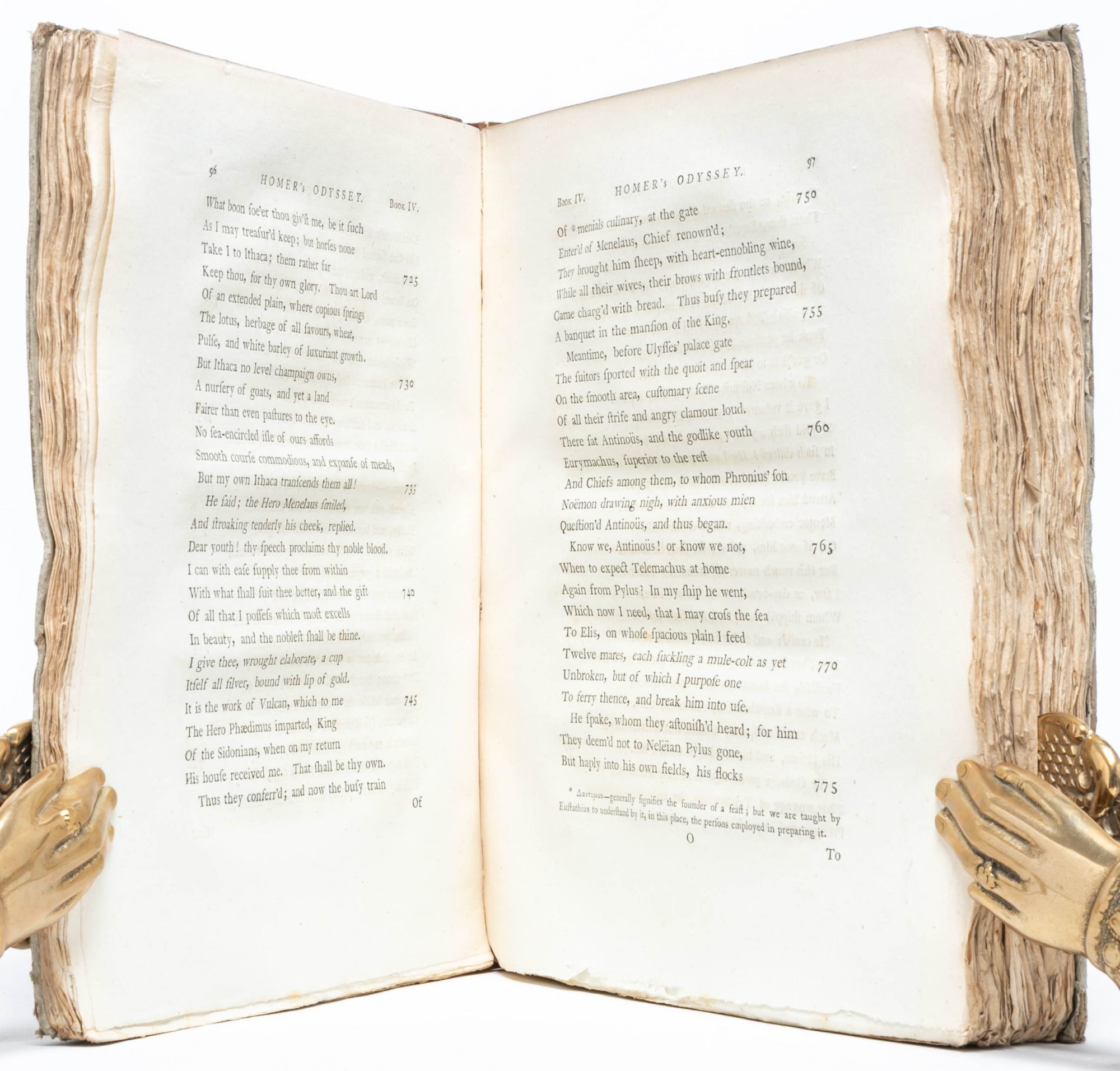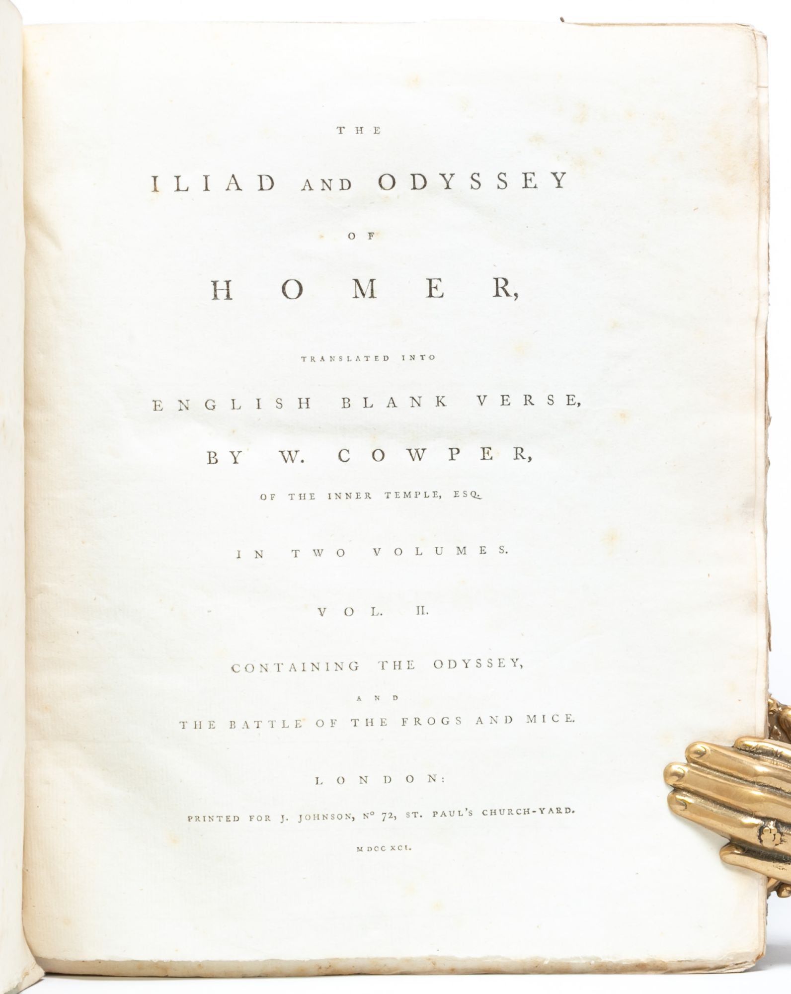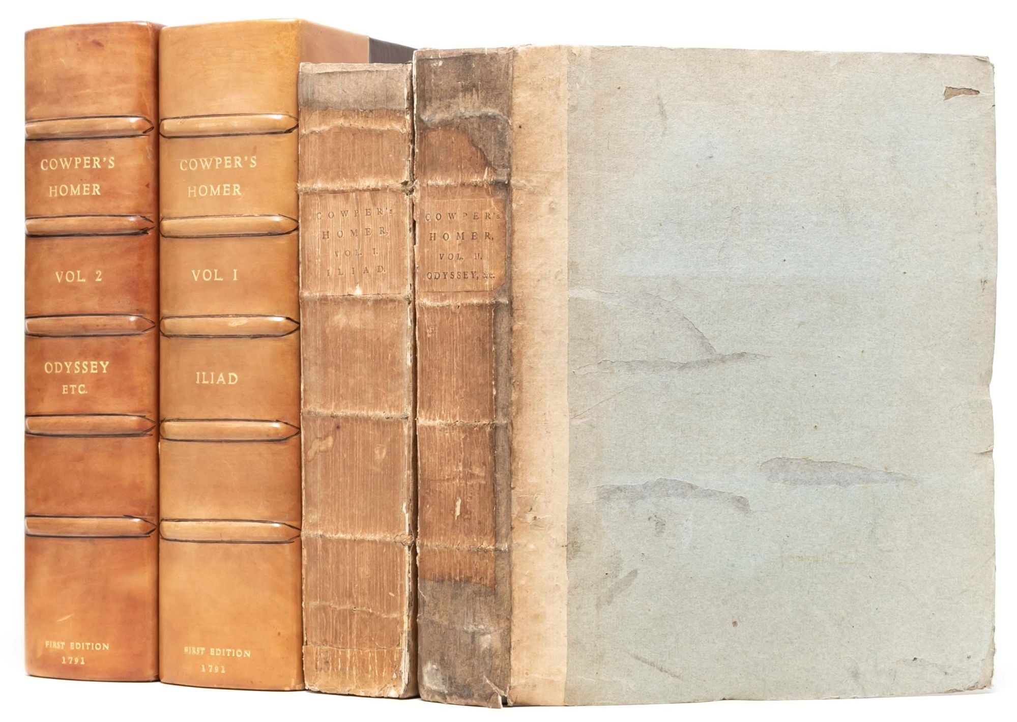 William Cowper's translation is considered a "conscientiously literal" rendering of the text, adopting a "Miltonian" blank verse in an attempt to capture the plain, direct tone of the Greek (Arnold, On Translating Homer).Though the translation was criticized by some as lacking the flow and ease of the original text, and for relying too much on reference to Milton, it was also regarded as "a lofty achievement in scholarship and poetry" that appropriately preserved the Homeric "nobility" and is generally preferred over Alexander Pope's 1715 translation (The Cambridge History of English Literature). Overall, Cowper presented an appealing translation that is here preserved in its rare and attractive original state – in the publisher's boards, untrimmed, and partially unopened.
