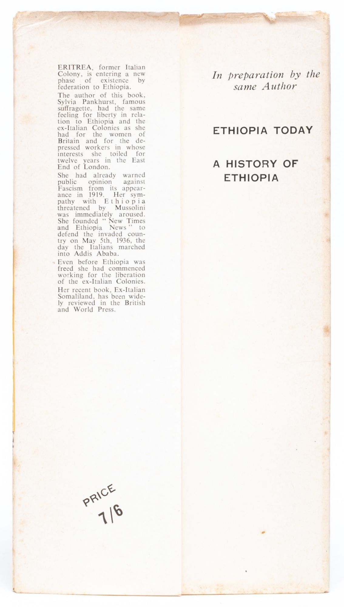 Eritrea on the Eve: The past and future of Italy's "first-born" Colony, Ethiopia's ancient Sea Province was published as Eritrea exited a period of British occupation and preceding colonization by Italy (1868 - 1941), which included five years under fascist rule. In 1850, Eritrea was federated with Ethiopia, against the wishes of many Eritreans who sought independence. Eritrea on the Eve reviews the history of Eritrea under fascist rule and British occupation, recounts the United Nations resolution that federated Ethiopia and Eritrea, and explains the problems facing Eritreans moving forward (including disease, deforestation, poverty, and lack of educational infrastructure). E. Sylvia Pankhurst (1882 - 1960), a longtime ally of Ethopia, also used the work to express her support for Ethopian imperial control over the territory. Eritrea on the Eve was the penultimate book Pankhurst published in her lifetime, followed only by Ethiopia: A Cultural History (1955).