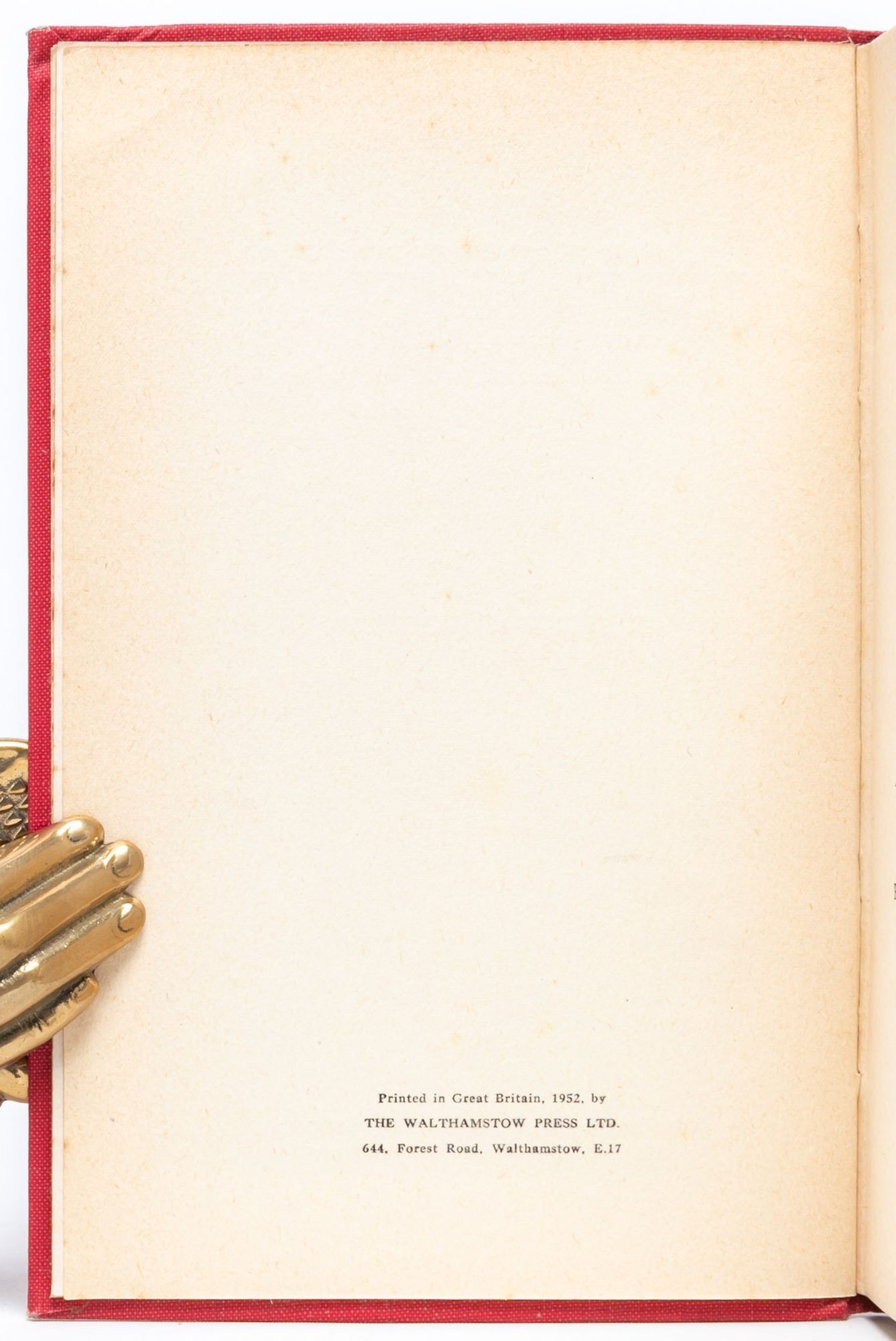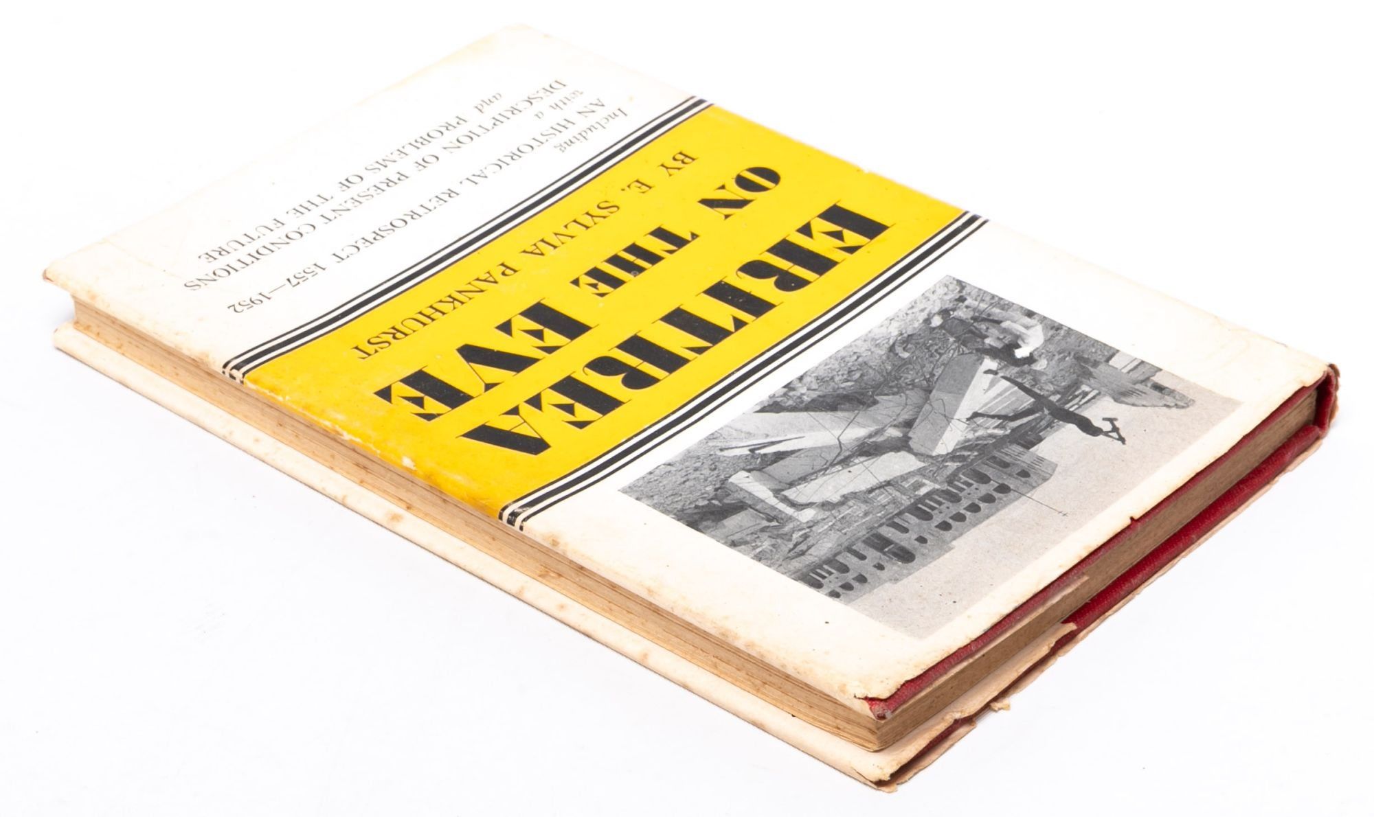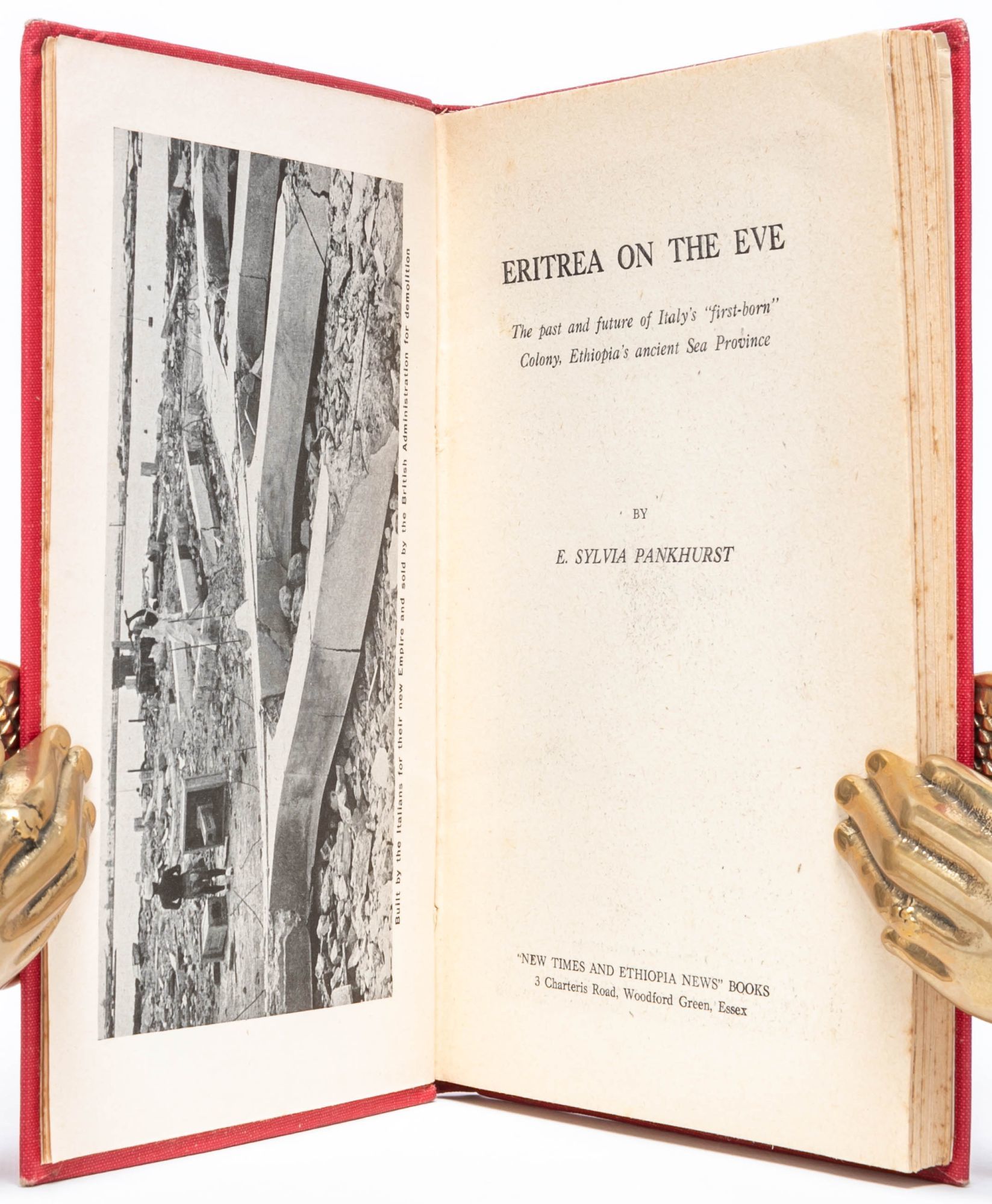 Essex: New Times and Ethiopia News" Books, 1952. First edition. Very Good/Good +. Publisher's red cloth titled in black. Octavo. 72, [4] pp. With photographic frontispiece and fourteen double-sided photographic plates and three maps. Some foxing to cloth and to leaves, mostly at preliminaries. Some marginal toning. Original dust jacket with some foxing and some chipping to edges, with a couple amateur tape repairs to inside of jacket. A Very Good copy, in the Good+ dust jacket, of a scarce later Pankhurst title that commemorates her deep activist ties to Ethiopia.
