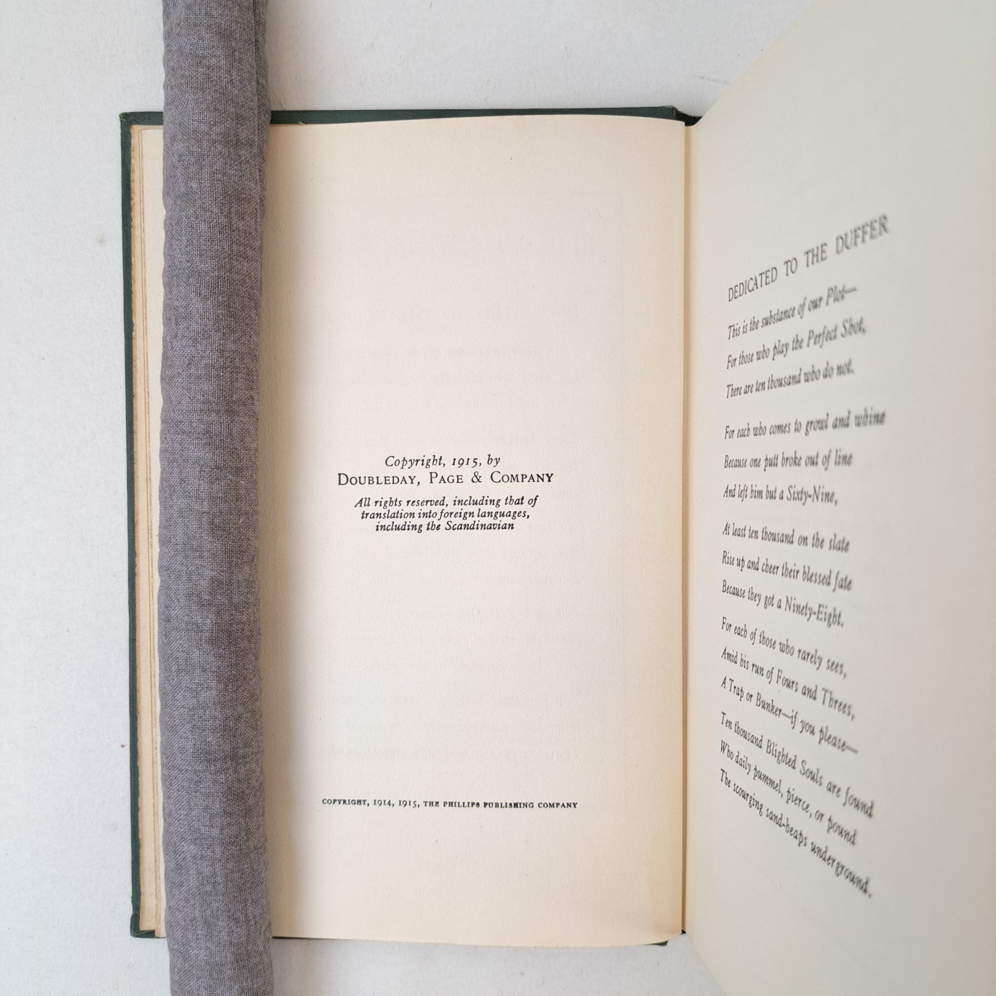 Garden City, New York: Doubleday, Page & Company, 1915. First Edition. Hardcover. Octavo, 258 pages. In Very Good minus condition. Spine is green with orange lettering. Boards have mild shelving and rubbing wear along extremities, mild bumping and fraying to fore corners, soiling along front cover, and small black scuff marks along rear cover and front fore edge. Textblock has mild age-toning and soiling; interior has mild age-toning along endpapers and previous seller's pen markings along head edge of rear pastedown. Contains frontispiece of a golfer putting. DL Consignment. Shelved Room C. 1399381. Special Collections.